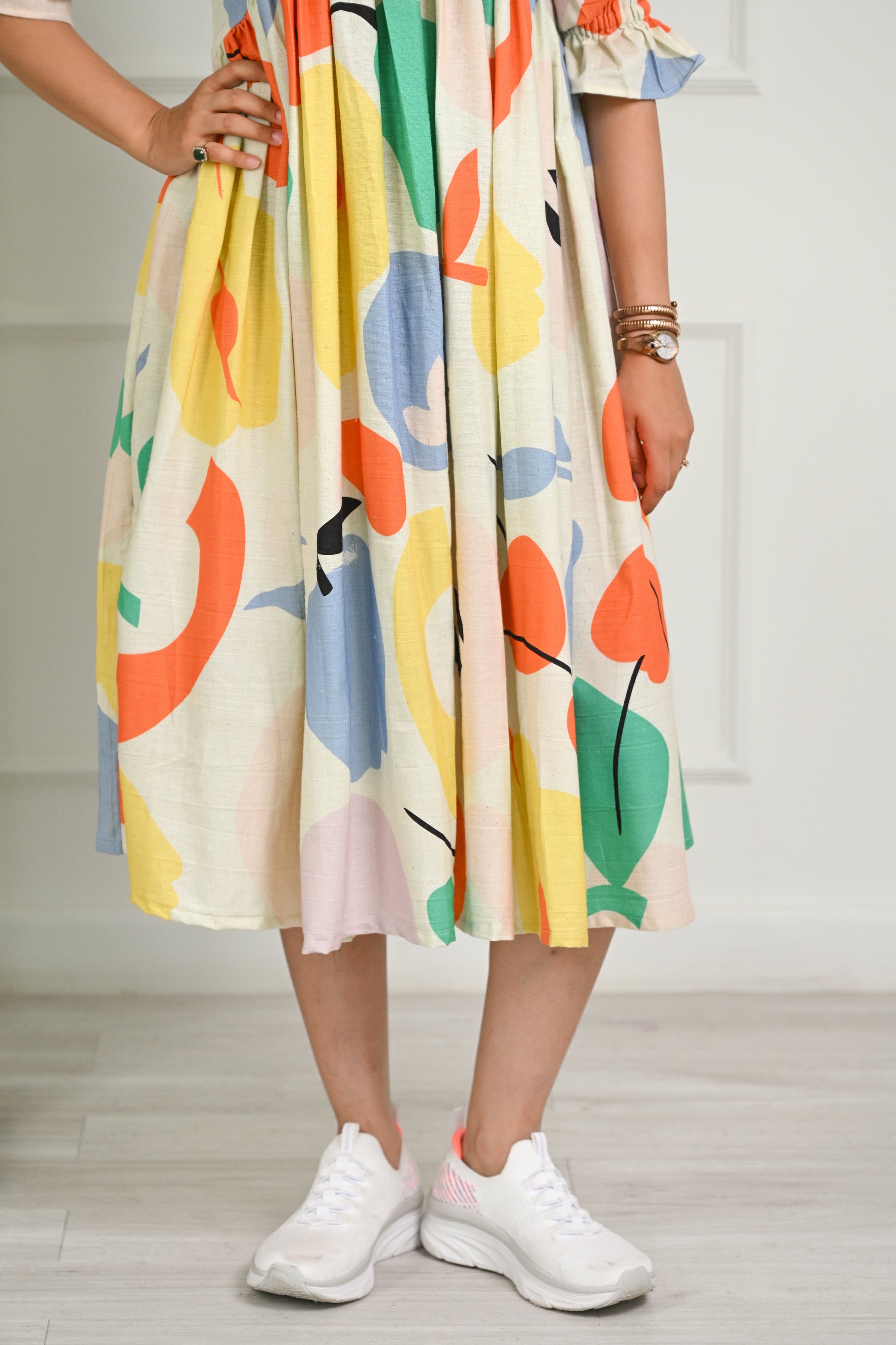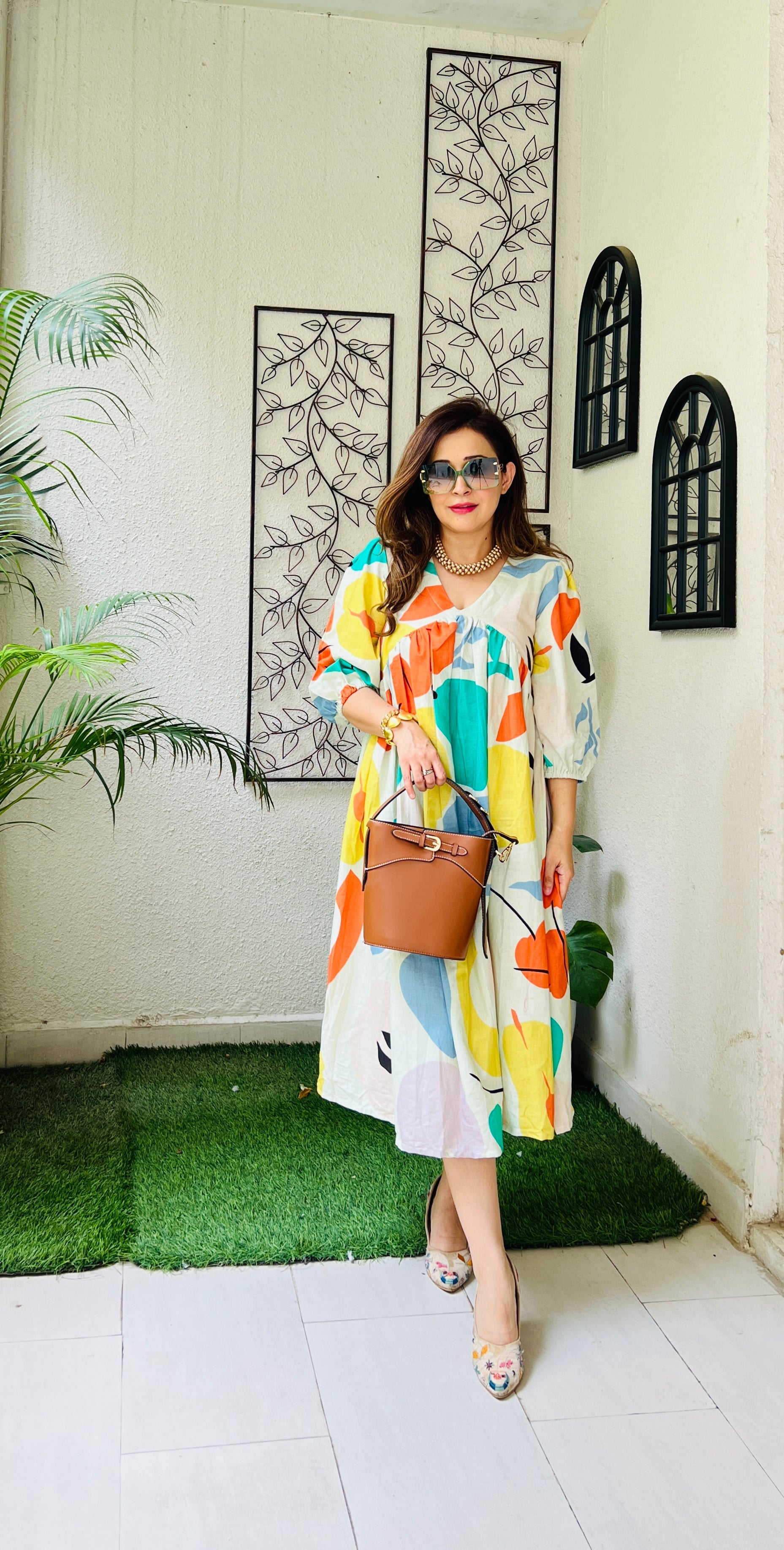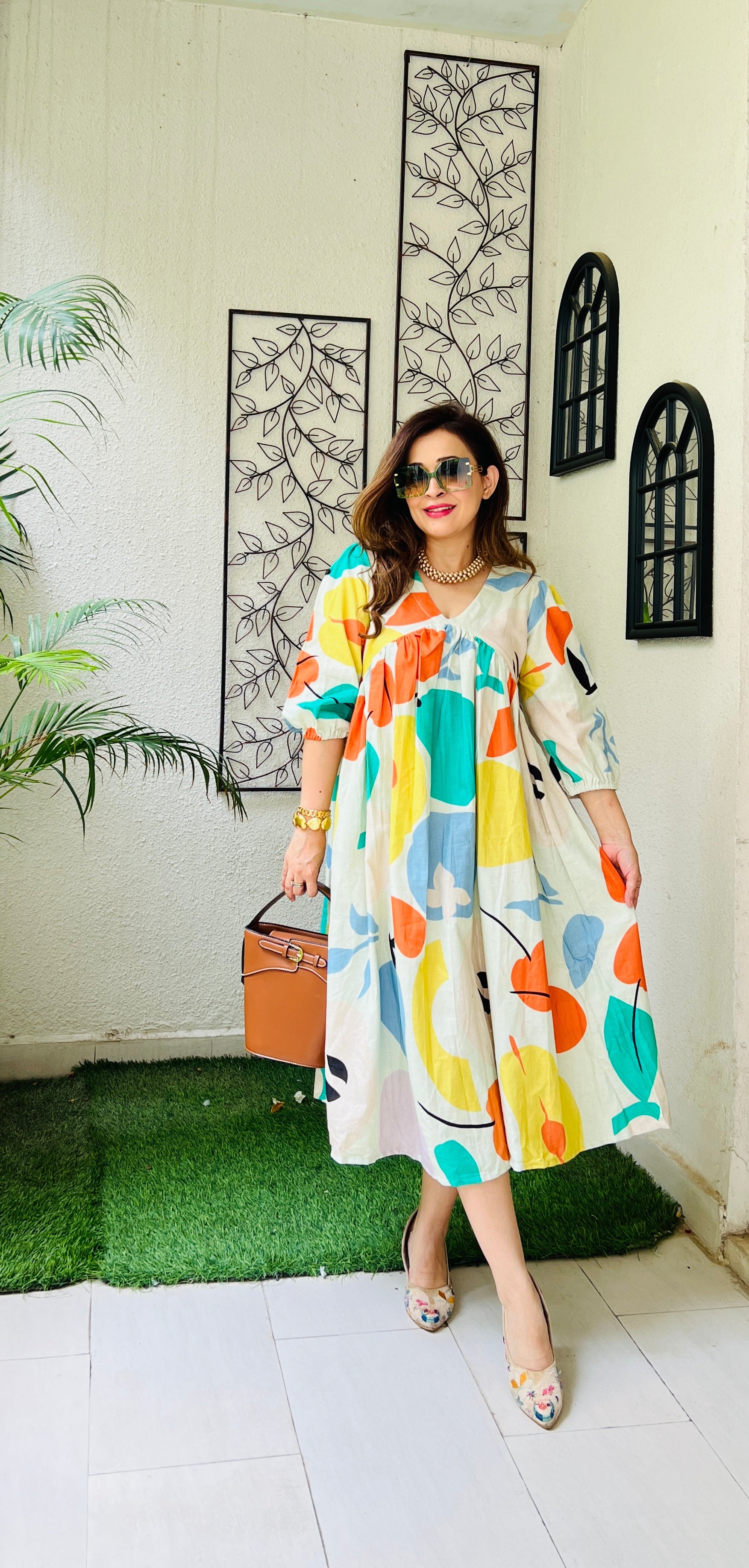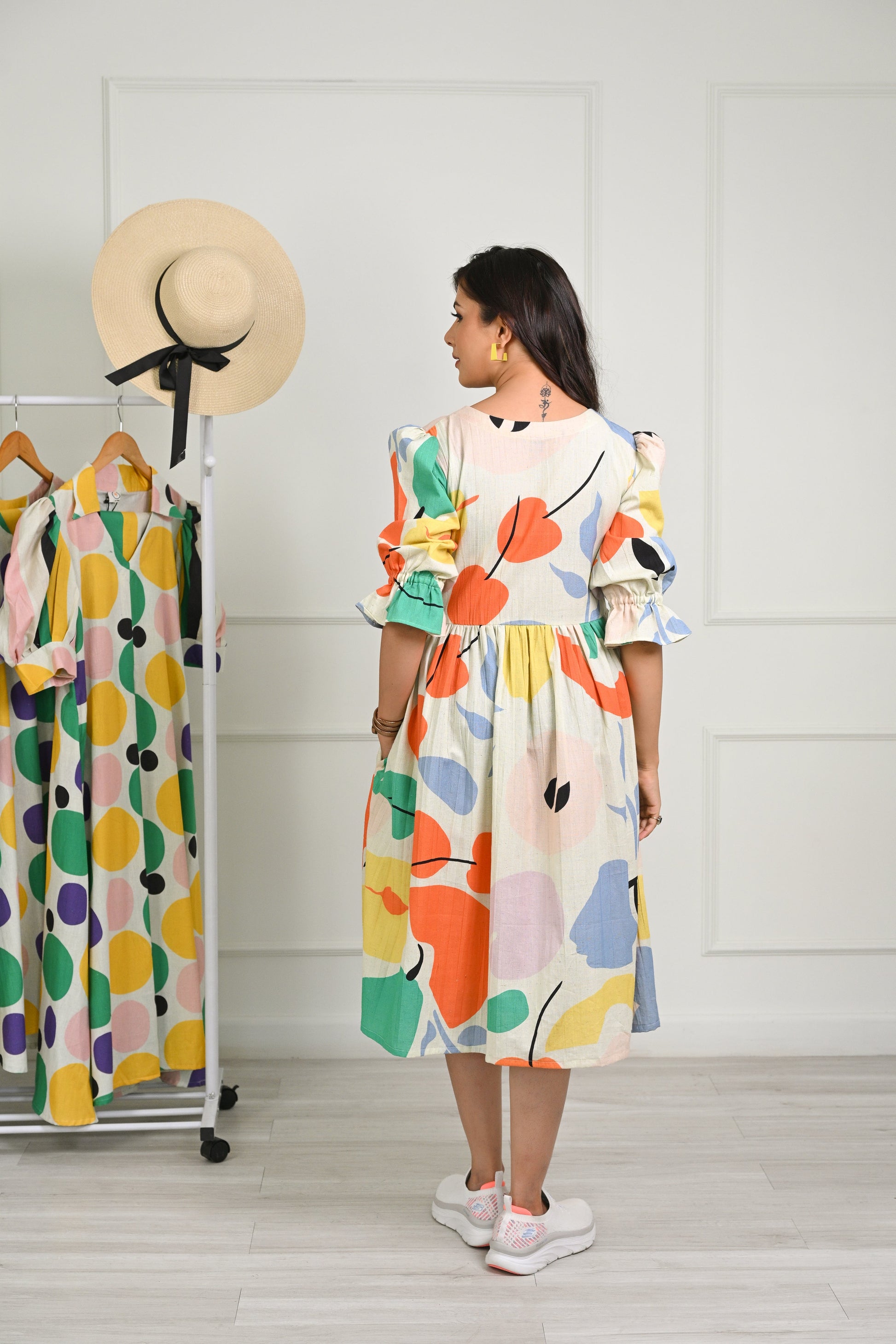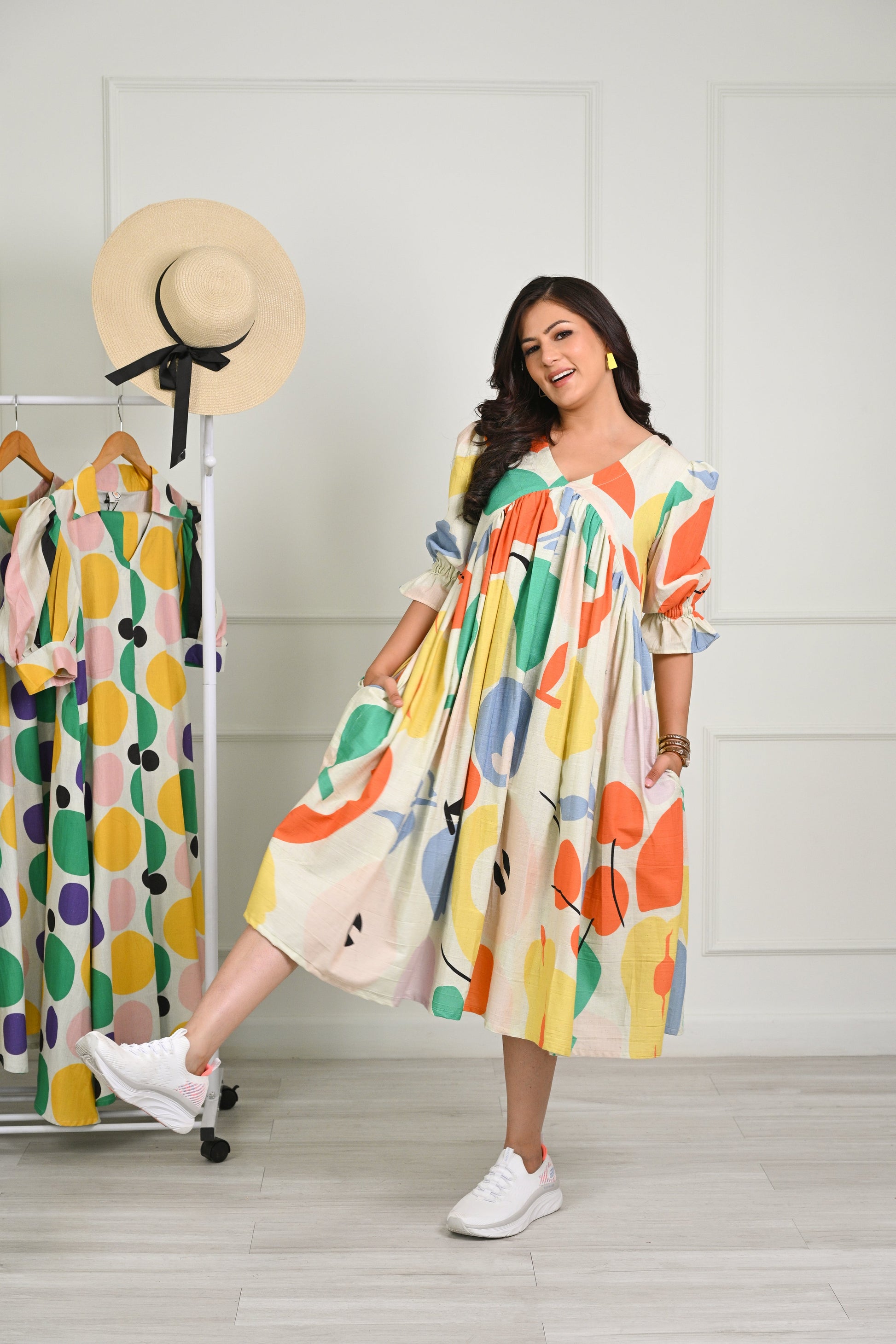 Introducing our Quirky Prints Midi Dress: a vibrant, stylish piece perfect for making a statement. Featuring unique, eye-catching prints, this dress offers a flattering midi length and a comfortable fit. Ideal for casual outings or special occasions, it combines playful design with effortless elegance. Make every day a little more fun with this must-have addition to your wardrobe.
