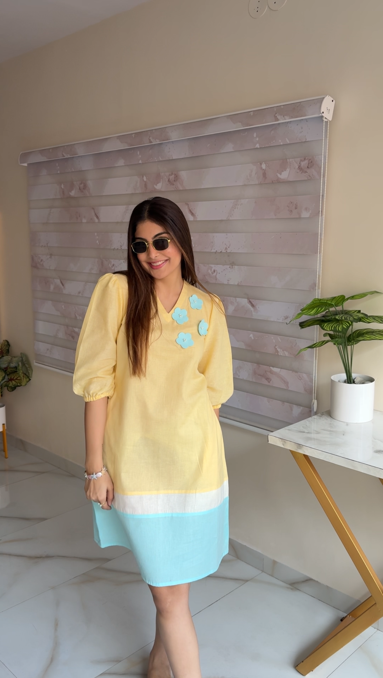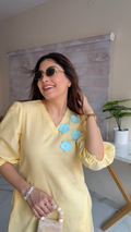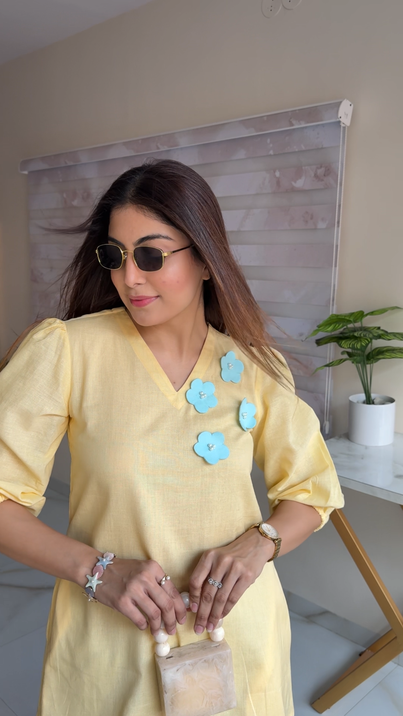 Three adorable 3D aqua-blue floral appliqués with pearl centers add a playful yet graceful touch to the neckline, making the kurti stand out with subtle detailing. The V-neck and airy 3/4th puff sleeves offer both comfort and feminine style, perfect for everyday wear, brunch outings, or casual gatherings.