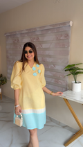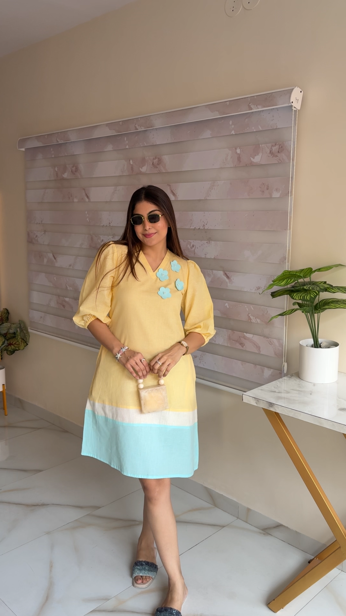 Step into serene summer charm with this delightful soft-yellow kurti, designed to brighten your day with its pastel elegance. The outfit features a soothing yellow base paired with a refreshing aqua blue border, creating a calm and cheerful color-block look.