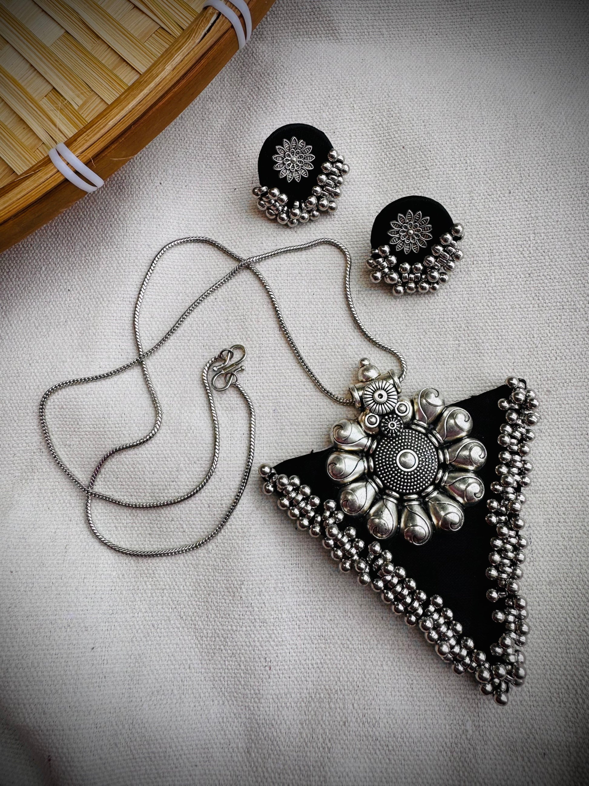 Make a bold statement with these classic gaji silk fabric necklace + earrings set, featuring striking antique embellishments—perfect for festive events, weddings, and everyday elegance.