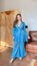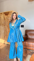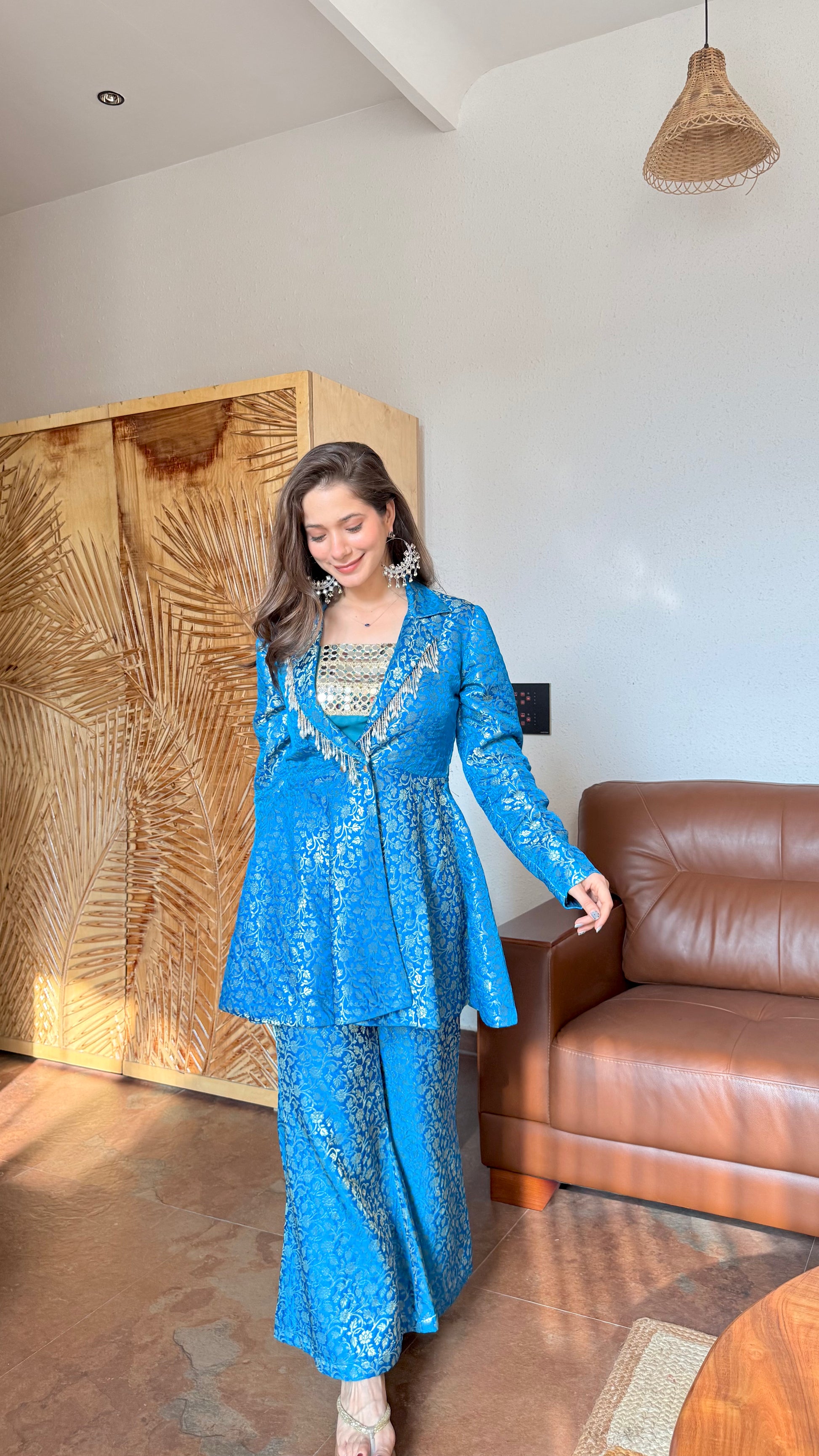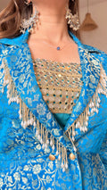 Make a statement in timeless elegance with this exquisite brocade outfit, crafted to reflect refined craftsmanship and festive charm. The luxurious brocade fabric features an intricate all-over woven pattern that gives a rich texture and subtle sheen. Designed with a flattering V-neckline, the outfit is beautifully enhanced with delicate mirror and embellishment detailing that adds just the right touch of sparkle.