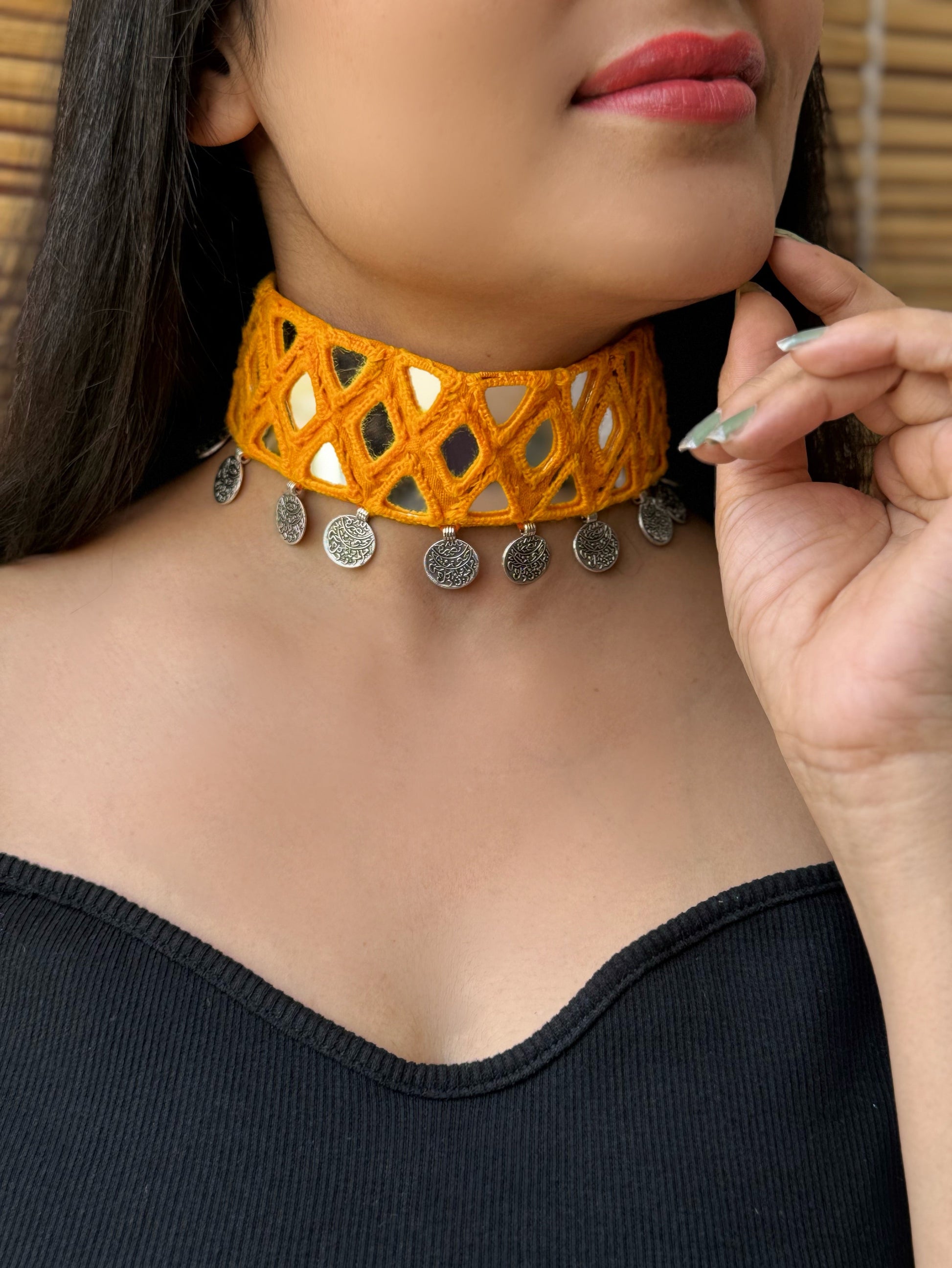 Look like a magnificent diva with this lovely multi-coloured mirrorwork necklace by DESIMORNI. Crafted with the finest material, this necklace is sure to solidify your identity as a style icon. Team it up with a kurta set and embellished flats for a fashionable look.