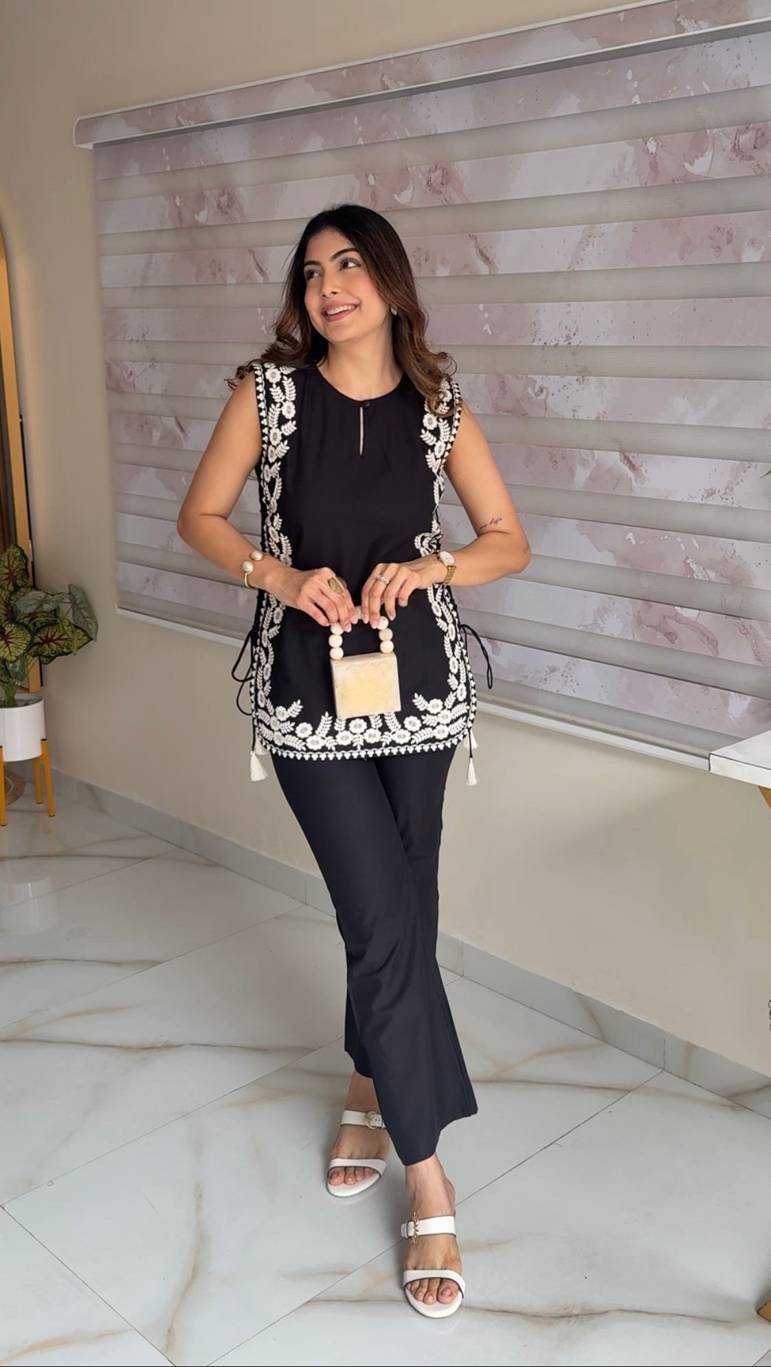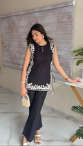 Elegant and edgy, this black cord set features intricate embroidery that adds a touch of timeless charm to a modern silhouette