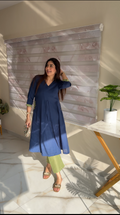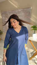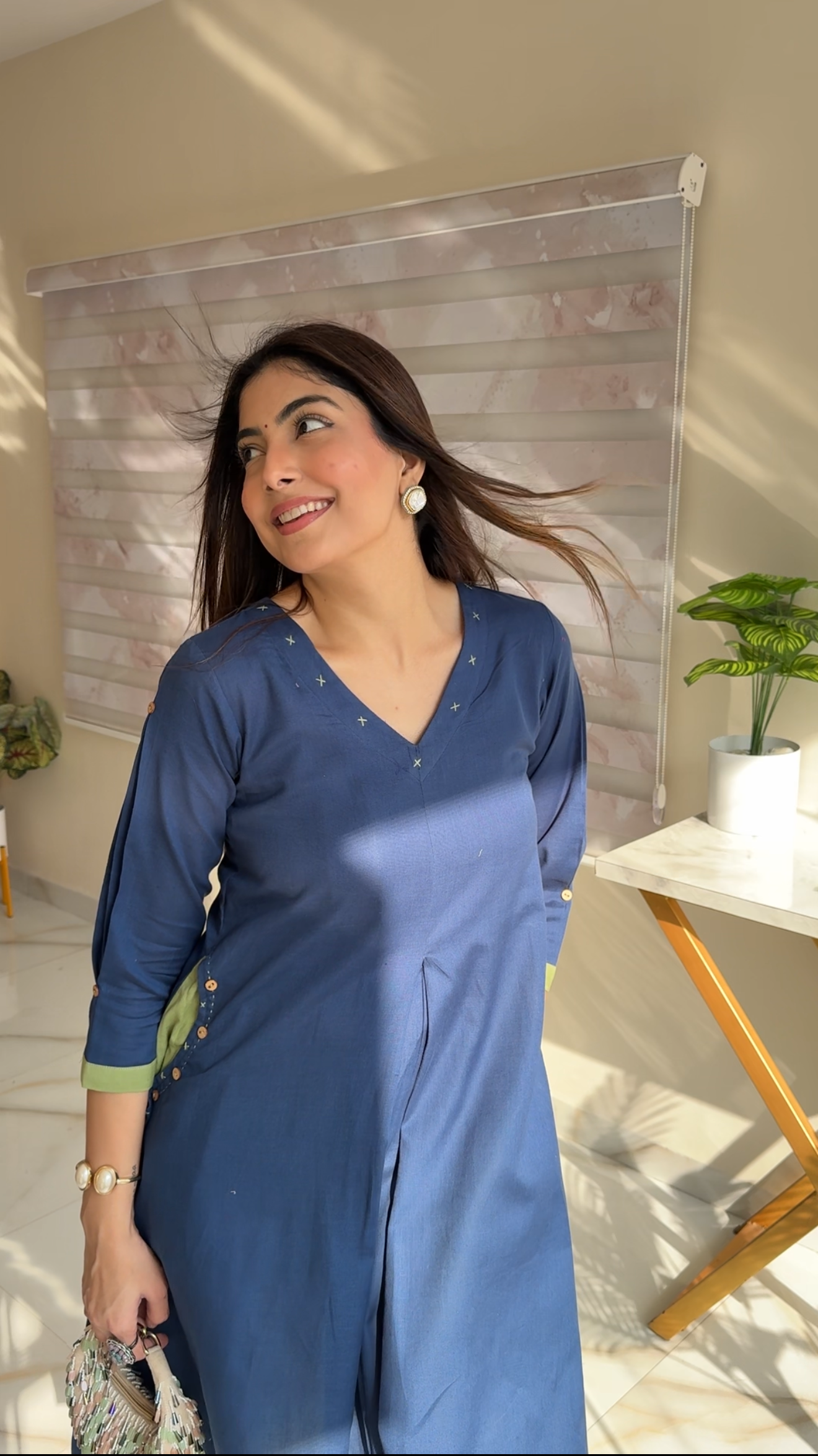 Step into effortless elegance with this stunning royal blue cord set, crafted for comfort and a touch of artisanal charm. Designed with a flattering V-neckline and three-quarter sleeves, the top features subtle hand-embroidered motifs around the neck, adding a delicate hint of sparkle.