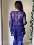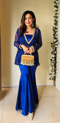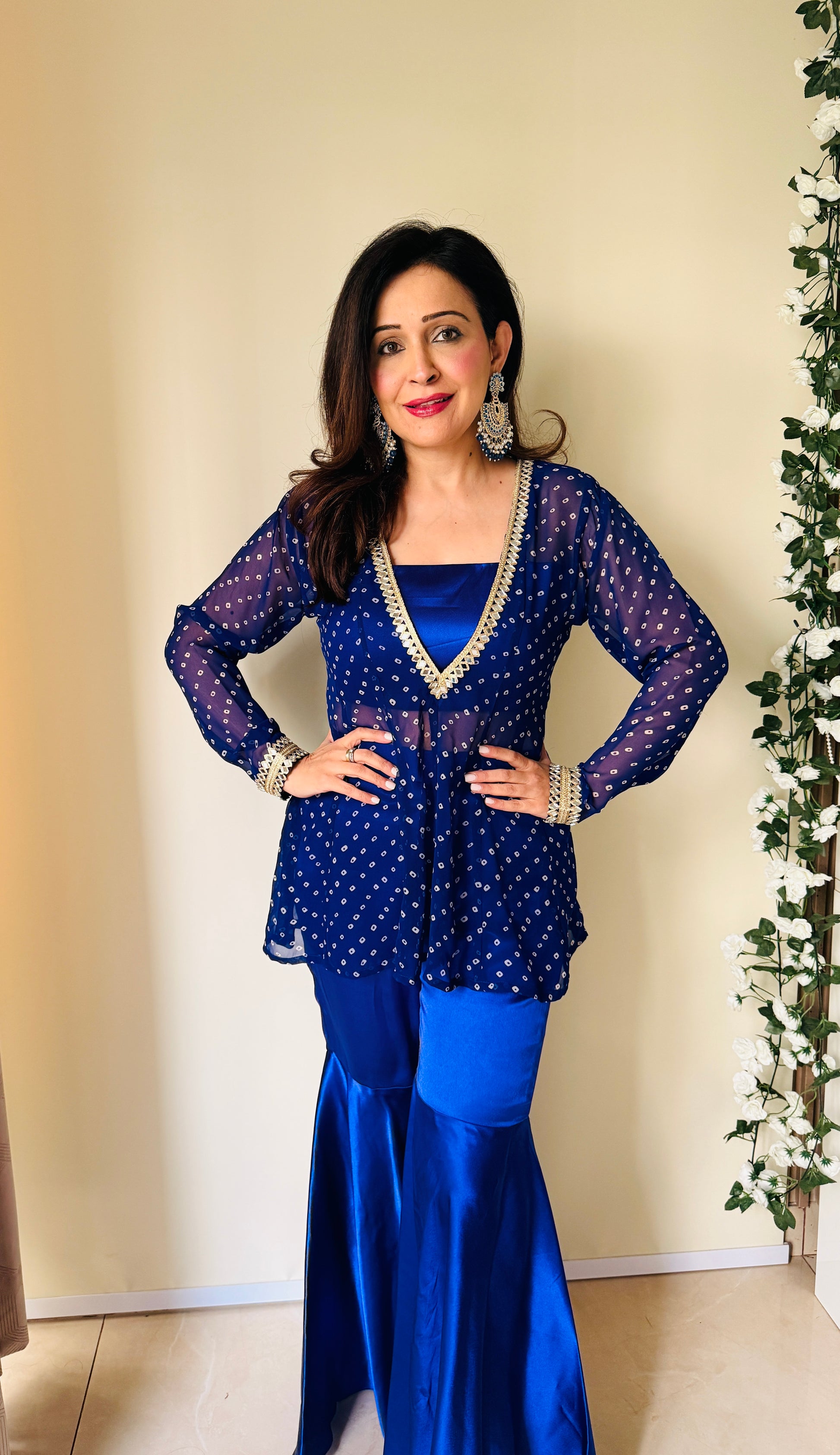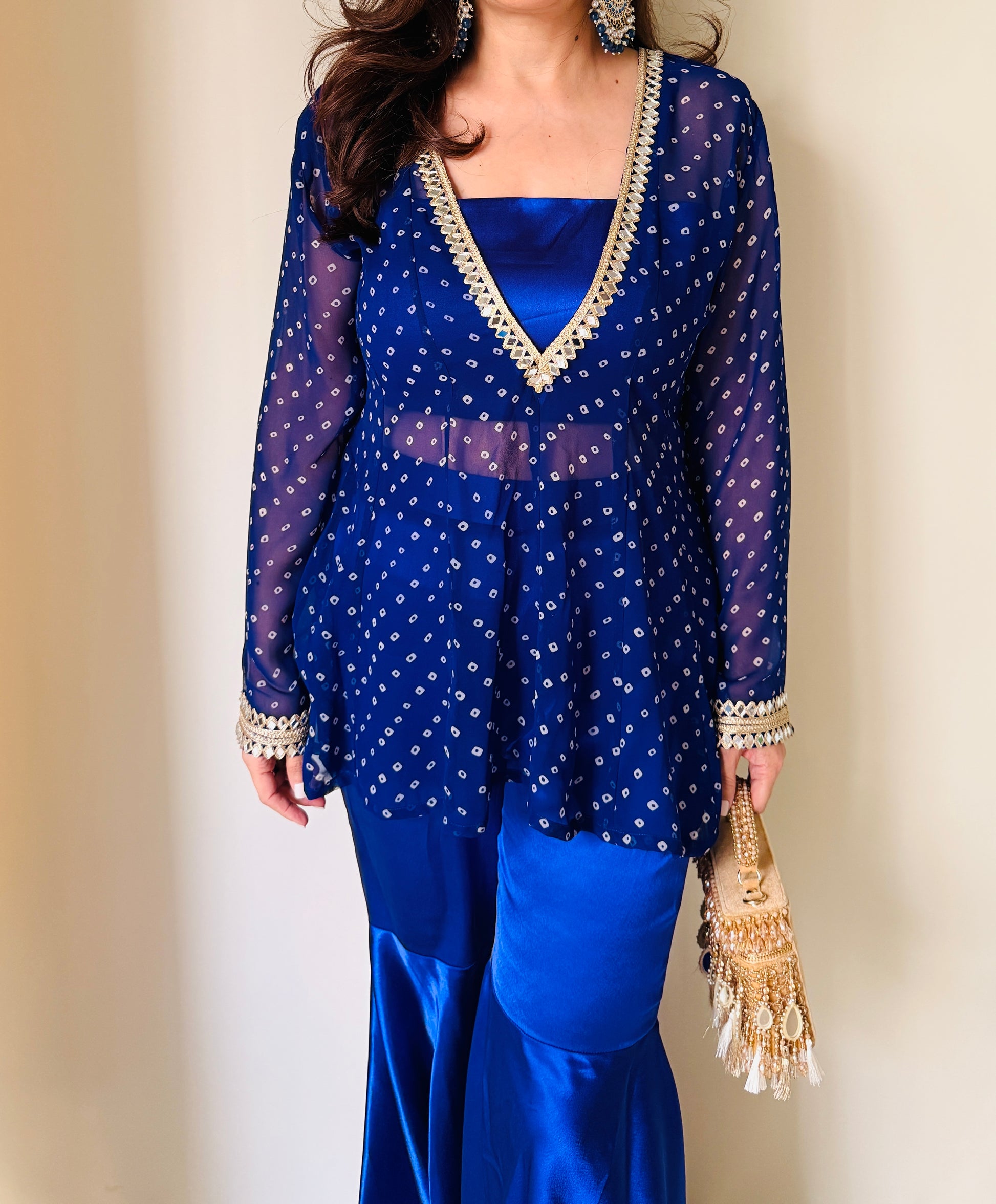 Turn heads in this royal blue bandhani set featuring a sheer embellished peplum top with delicate golden mirrorwork lace detailing. Paired with a smooth satin sharara, this outfit offers a perfect blend of elegance and comfort—ideal for festive events, weddings, and special occasions.