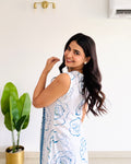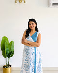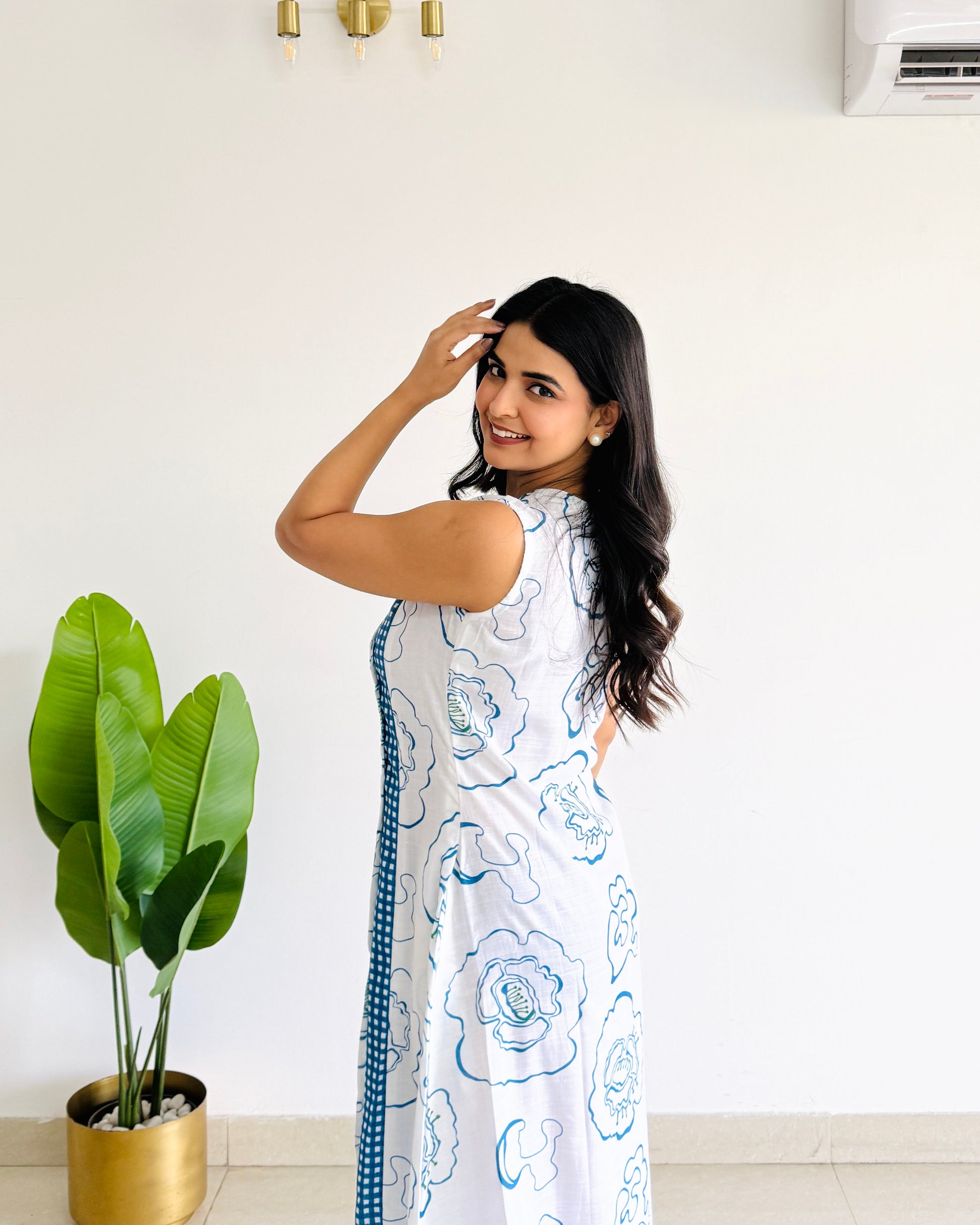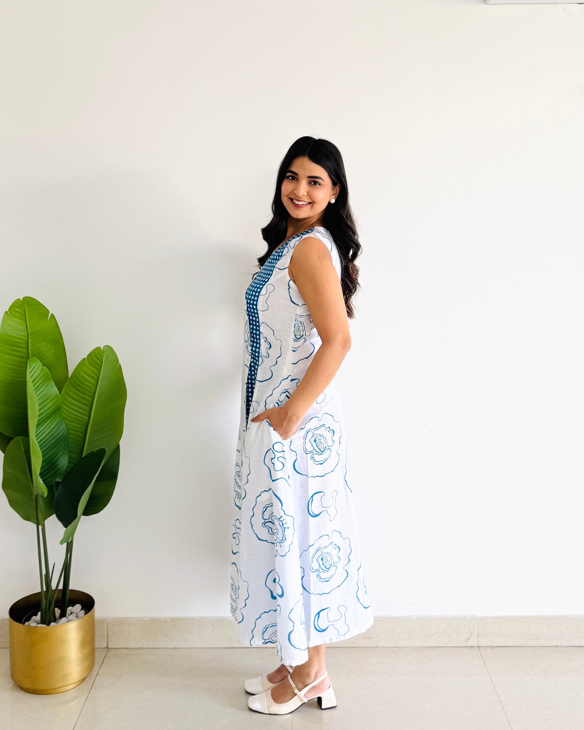 This elegant Blue Floral Midi Dress features a sophisticated digital print with a unique contrast gingham side panel for a modern look. Crafted from breathable pure cotton slub, it offers a premium textured feel and a relaxed A-line fit for all-day comfort. Designed with a stylish V-neckline and a sleeveless silhouette, it’s the perfect choice for garden parties, summer brunches, or a chic day out.