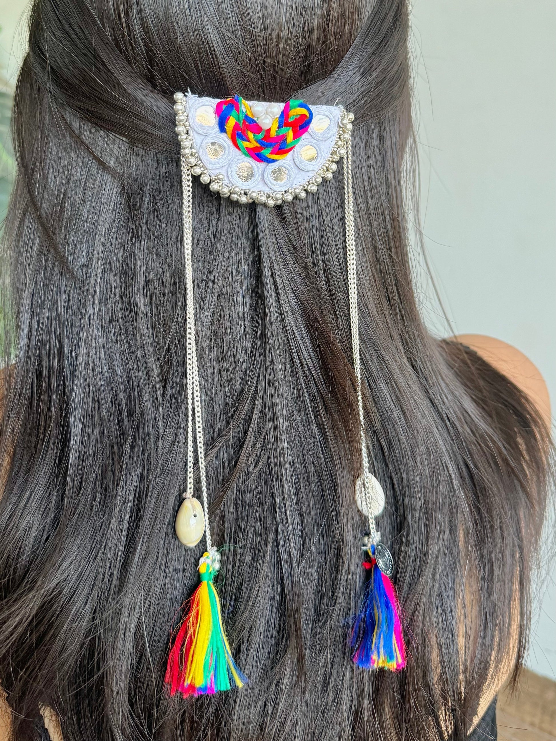 Handmade hair accessories with mirror sparkle and elegant lace tassels ā perfect for a touch of festive flair and feminine charm.
