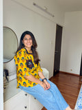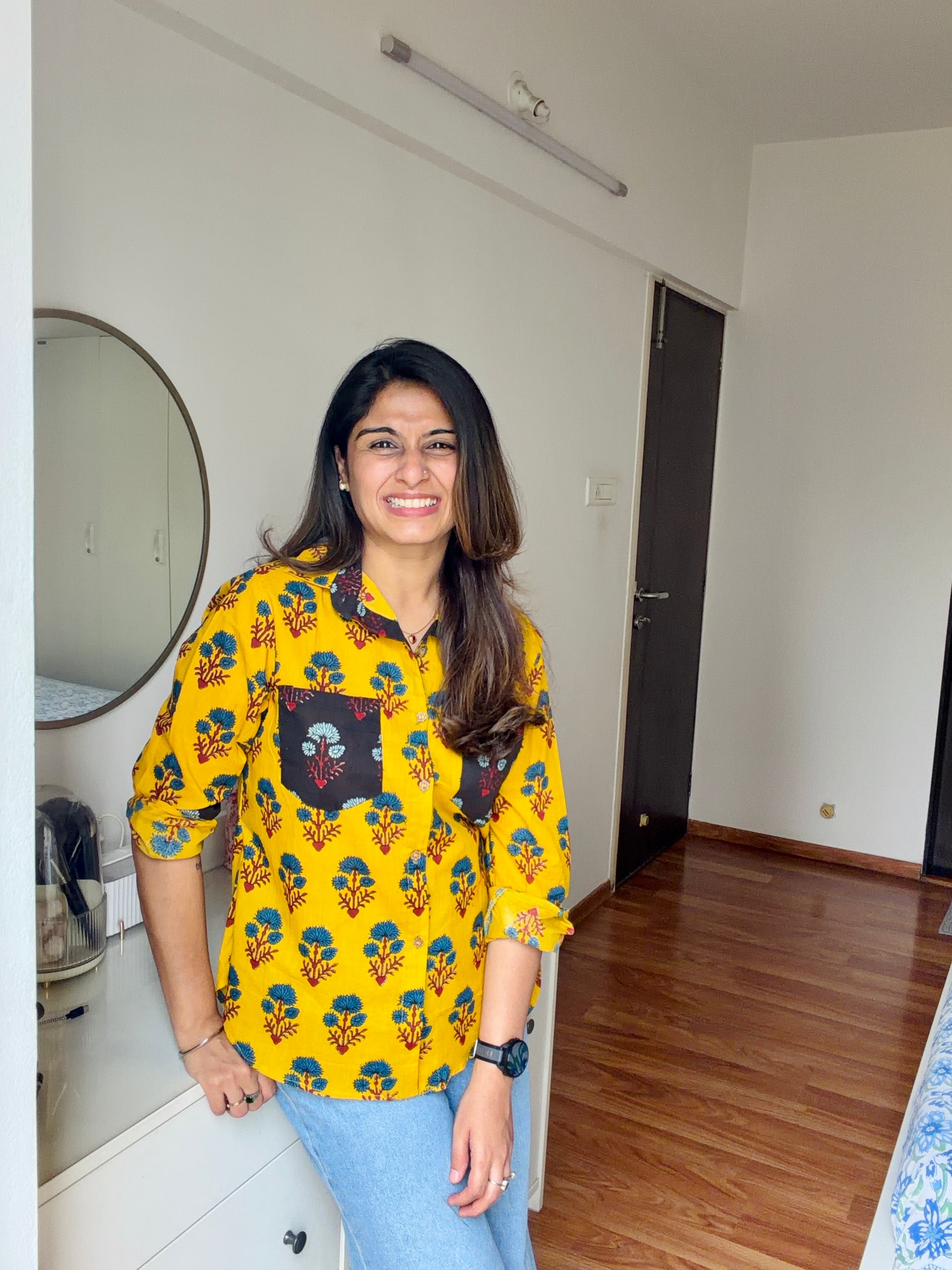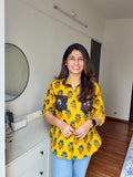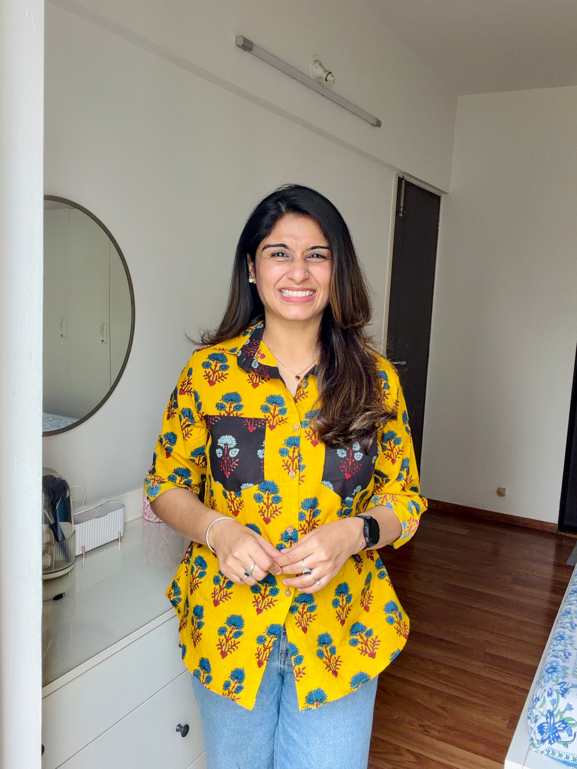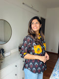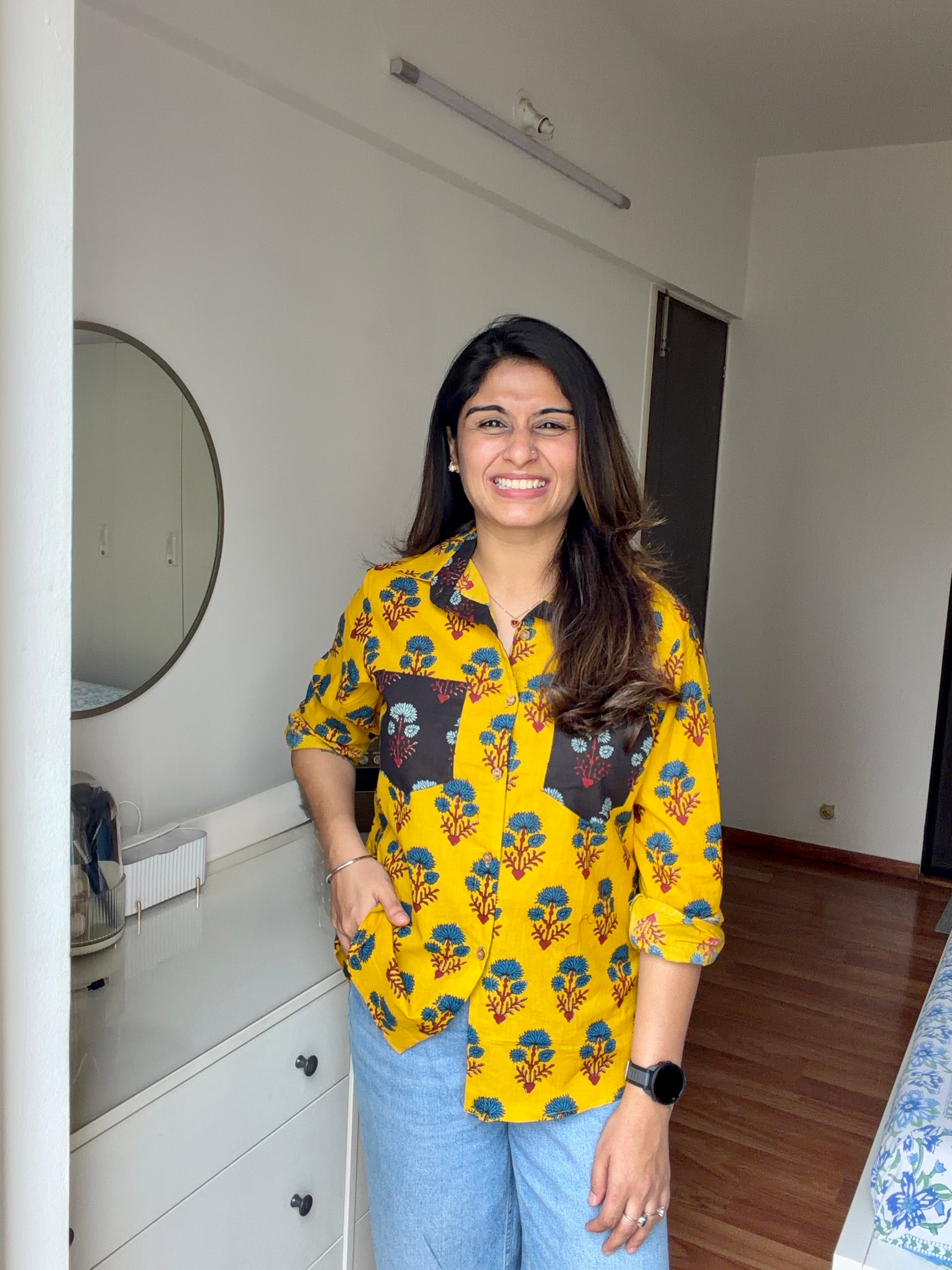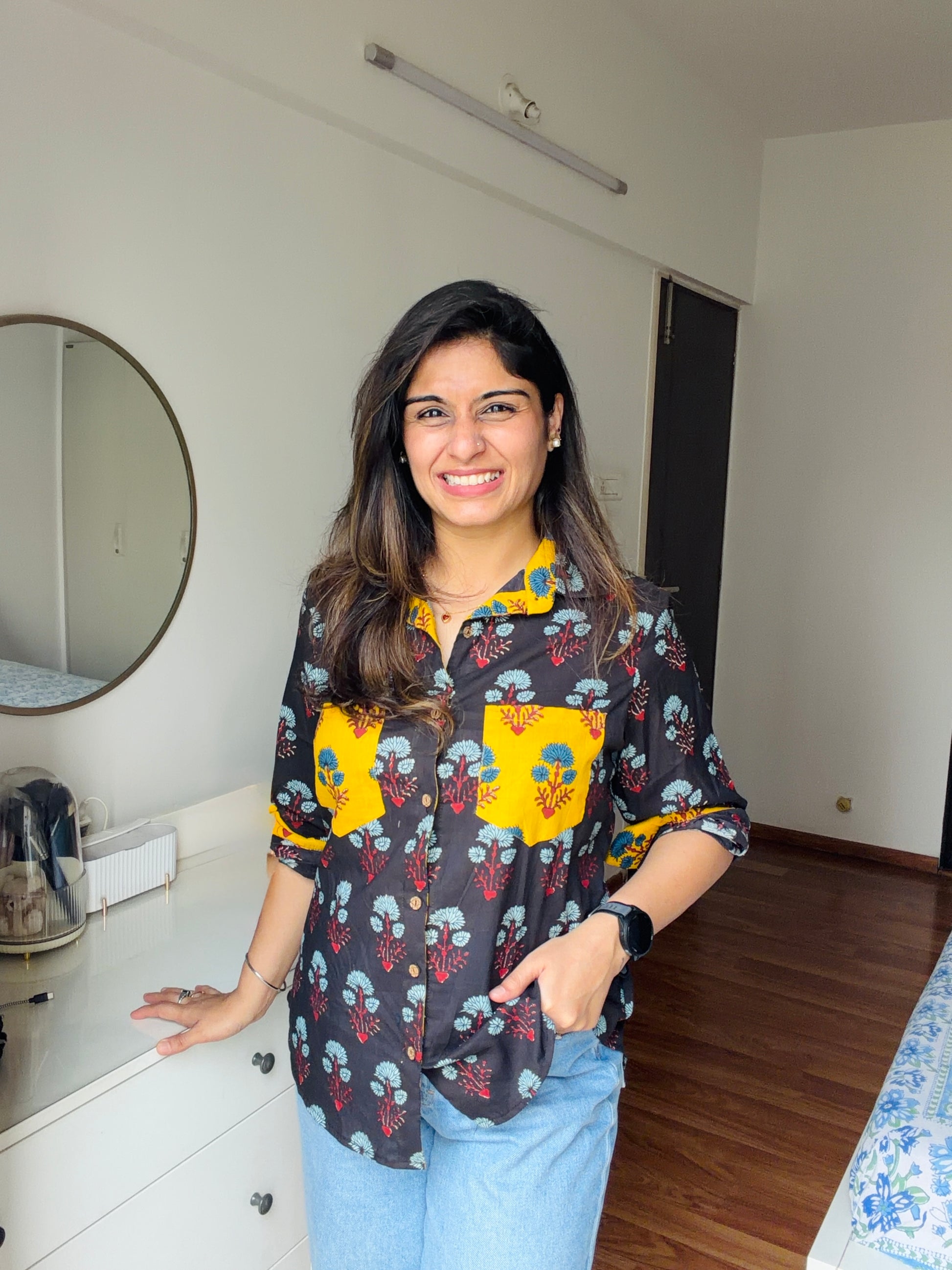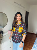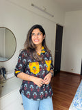 Make a bold style statement with this beautifully crafted Jaipuri print shirt. Designed in a rich dark base, it features intricate floral motifs that reflect traditional artistry with a modern twist. The contrast yellow detailing on the collar and pockets adds a vibrant pop of color, making this piece truly eye-catching.