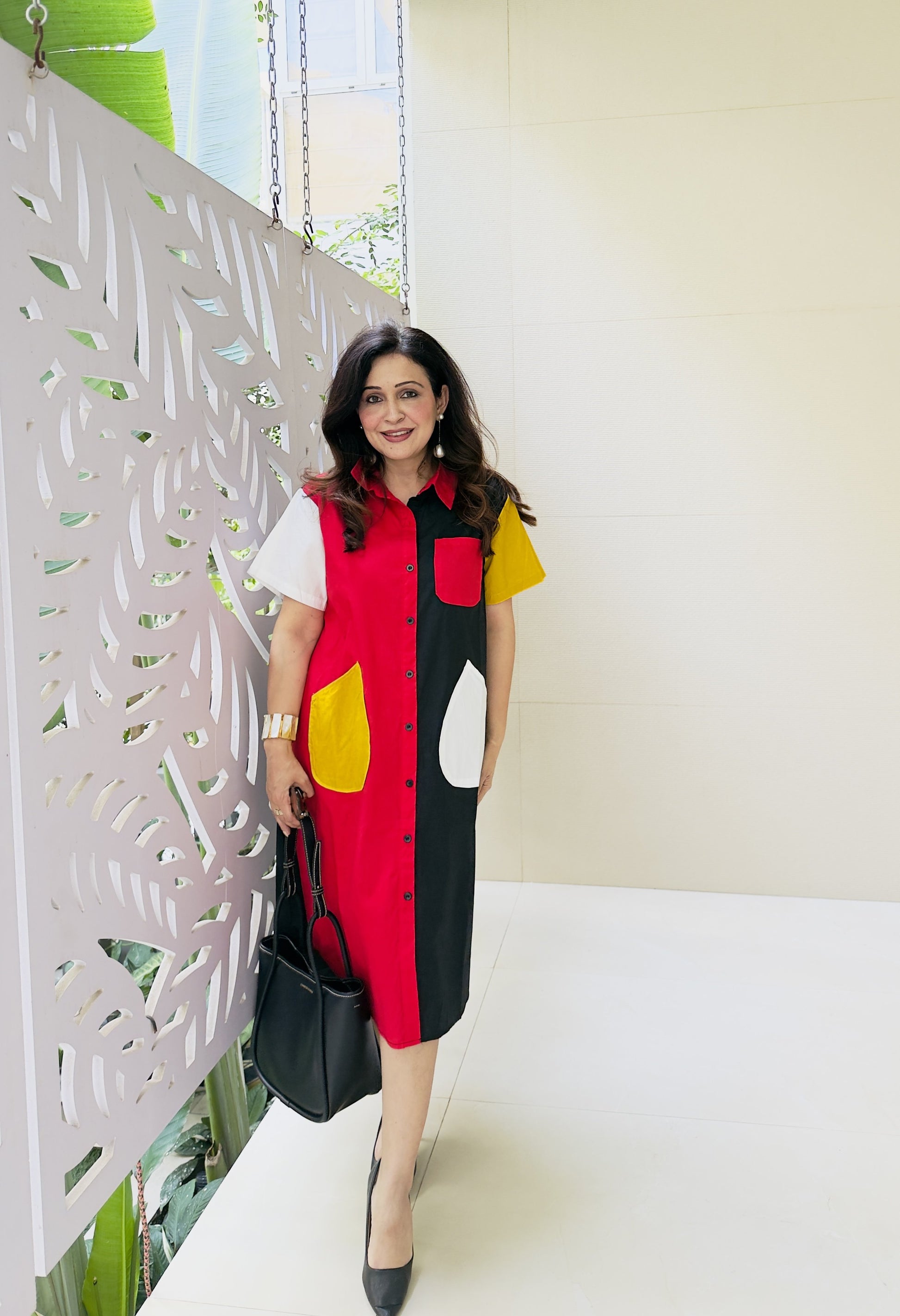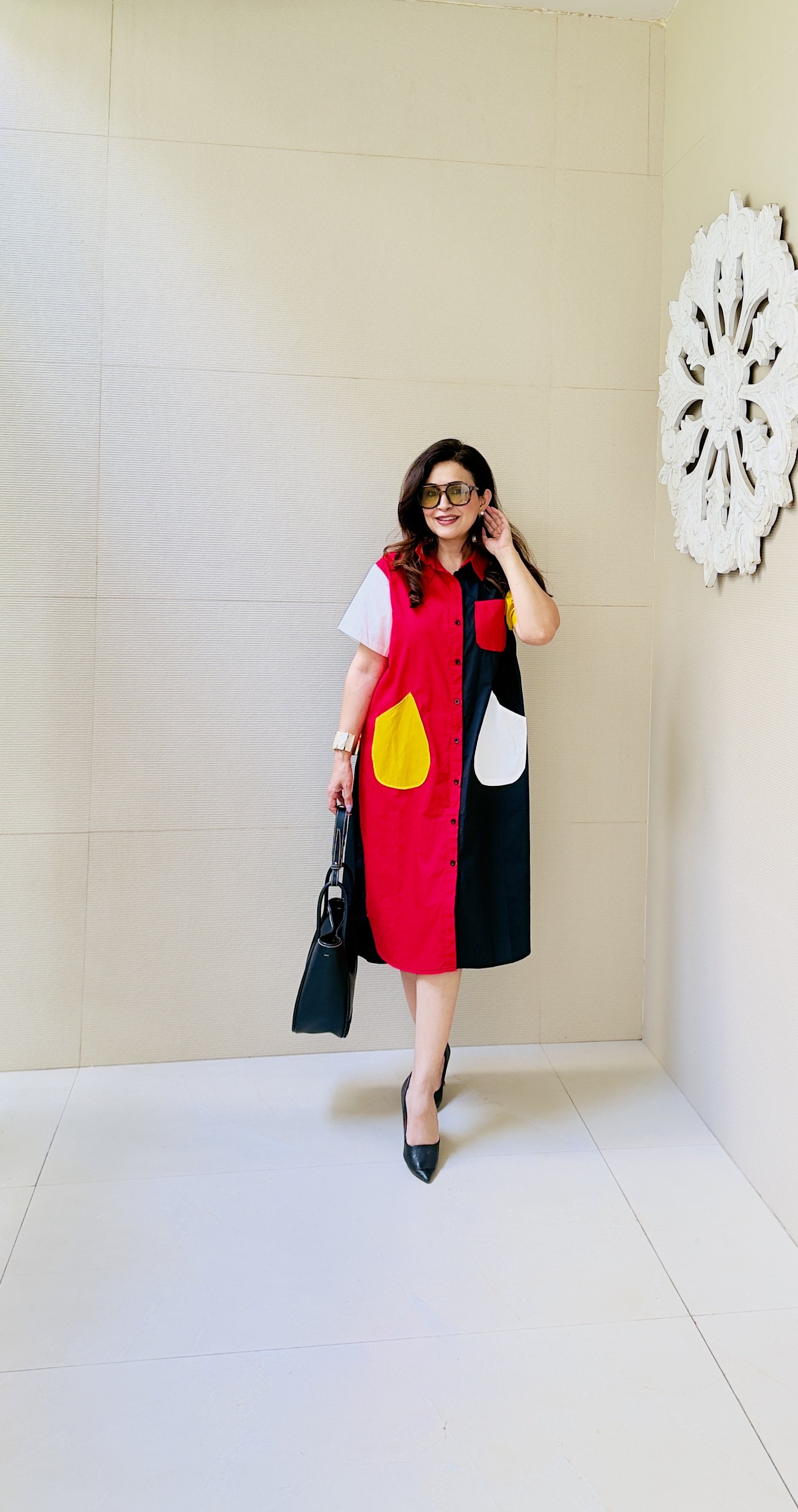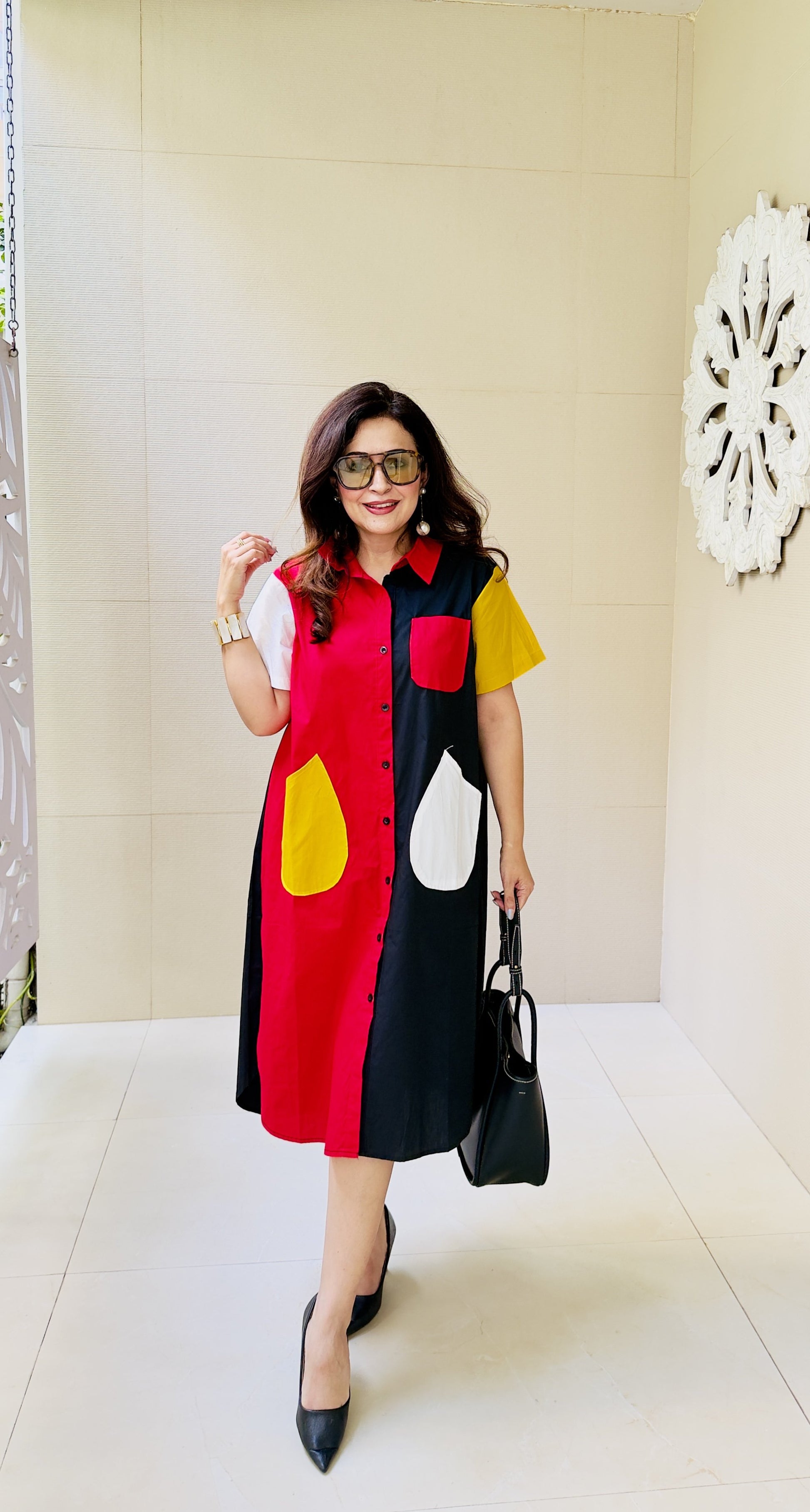 Step into effortless style with this statement shirt dress that perfectly blends bold colors with contemporary design. Featuring a striking color-block pattern in red, black, white, and mustard, this dress is crafted to stand out while keeping comfort at its core. The soft, breathable fabric ensures an easy, relaxed fit, making it ideal for all-day wear.