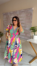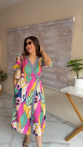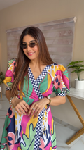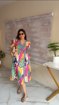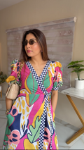 Make a bold statement with this vibrant cotton wrap dress, crafted for women who love comfort with a pop of personality. The dress features a lively mix of pink, yellow, green, navy, and abstract tropical leaf prints, giving it a fun, holiday-ready vibe.