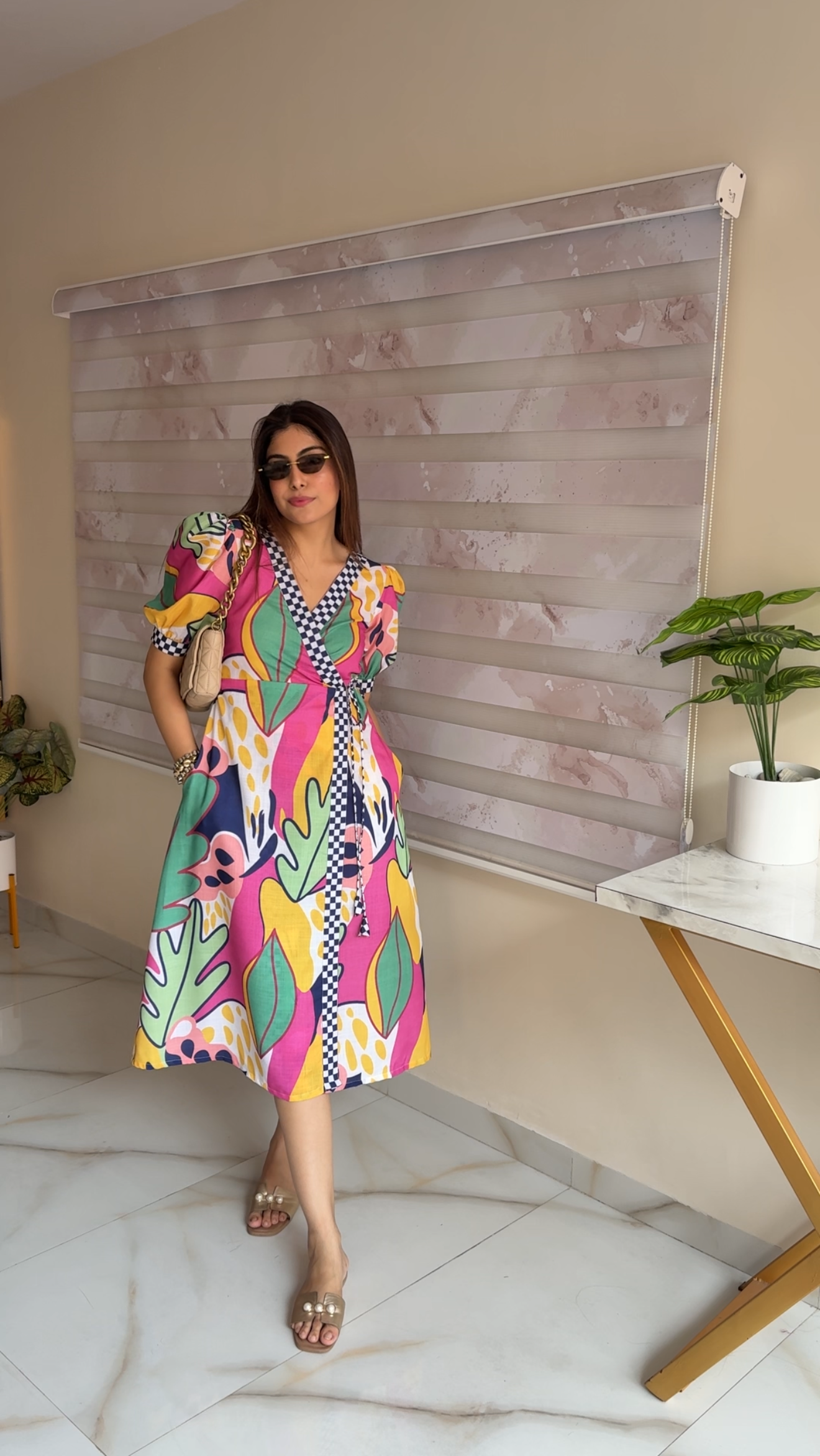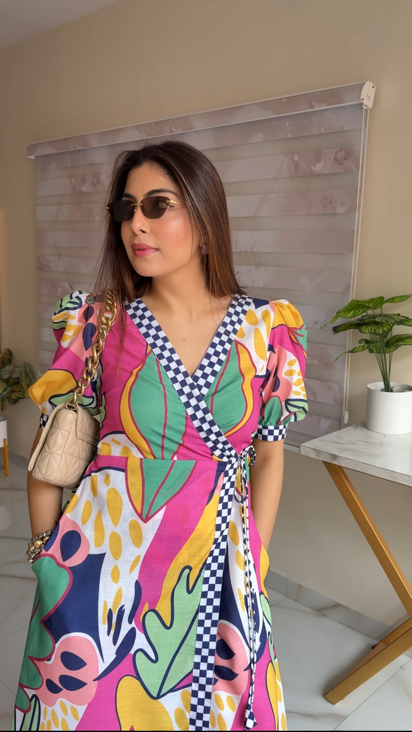The deep V-neck wrap pattern is highlighted with navy checkered borders, adding a trendy contrast that instantly elevates the look. The puff sleeves with matching checkered cuffs add charm, while the tie-up waist ensures a flattering, adjustable fit for all body types.