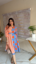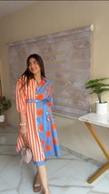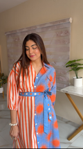 The design features a striking half-and-half pattern — one side adorned with vibrant orange stripes on a cream base, while the other side pops with a sky-blue backdrop and orange starburst motifs. The button-down front, shirt collar, and two front pockets add a touch of casual chic, while the airy silhouette ensures effortless movement.