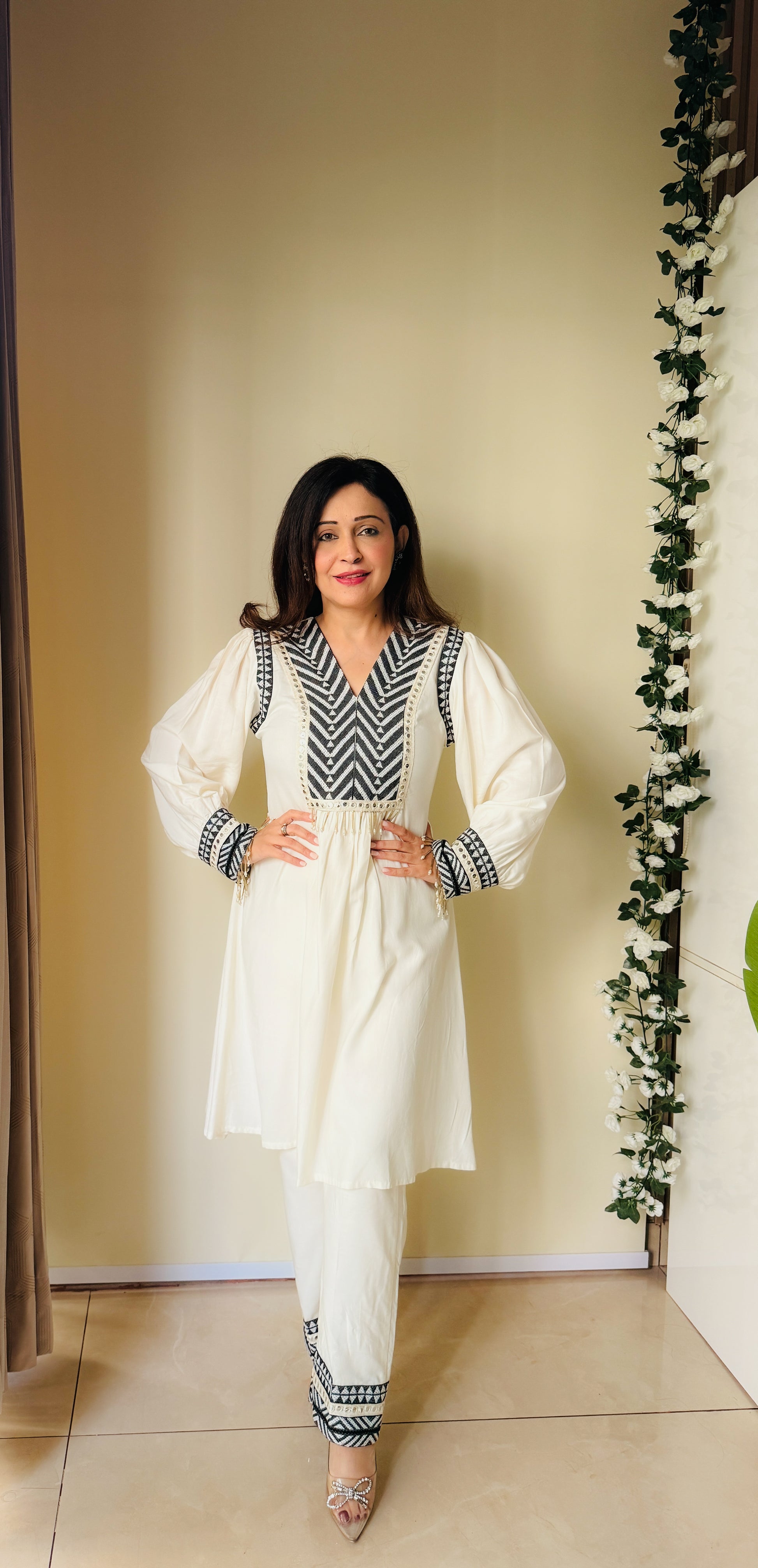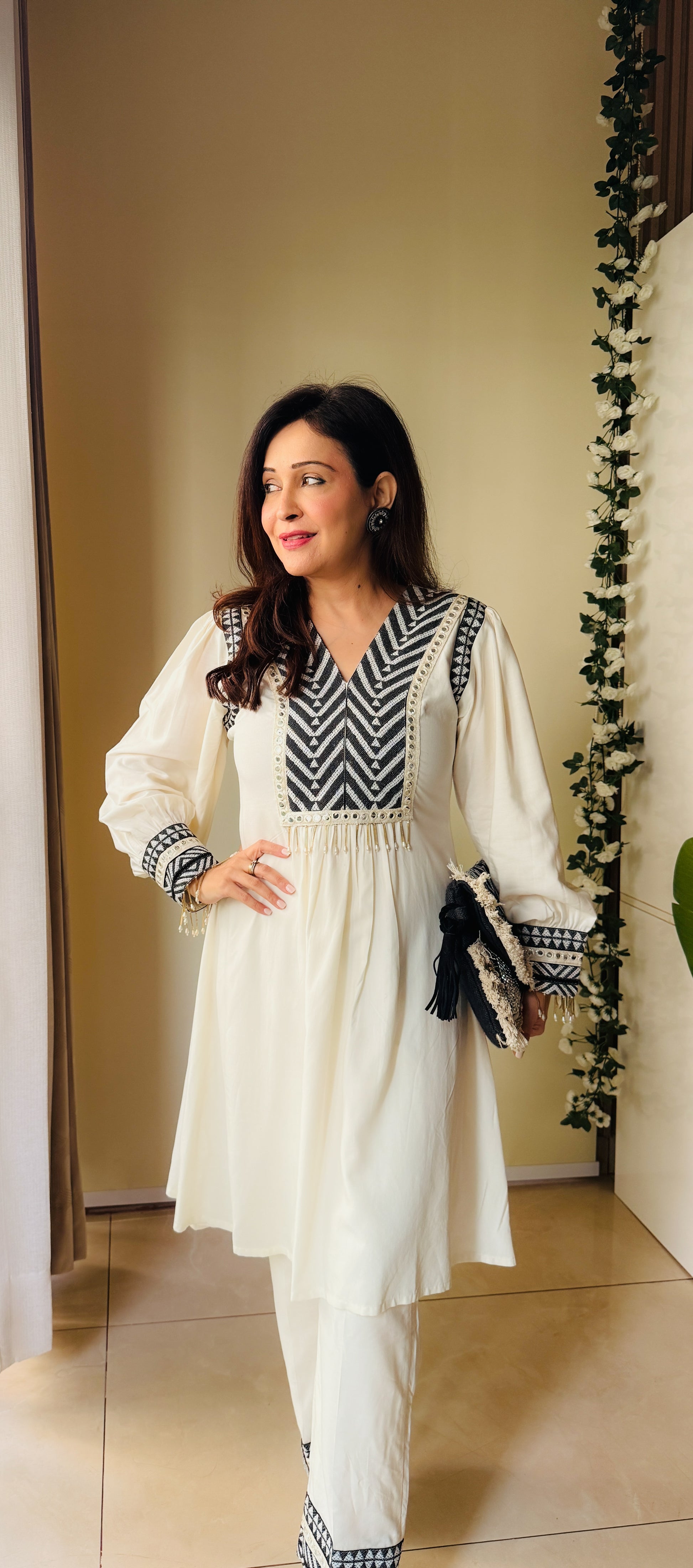 This elegant ivory kurta set blends timeless grace with modern detailing. The kurta features a striking monochrome geometric panel along the neckline, front bodice, and cuffs—adding a bold yet refined contrast to the soft, flowy fabric. Paired with straight-fit pants adorned with matching monochrome embroidery at the hem, the ensemble feels cohesive, polished, and effortlessly chic. Completed with delicate embellished heels, the look exudes understated luxury—perfect for daytime celebrations, festive gatherings, or refined casual wear.