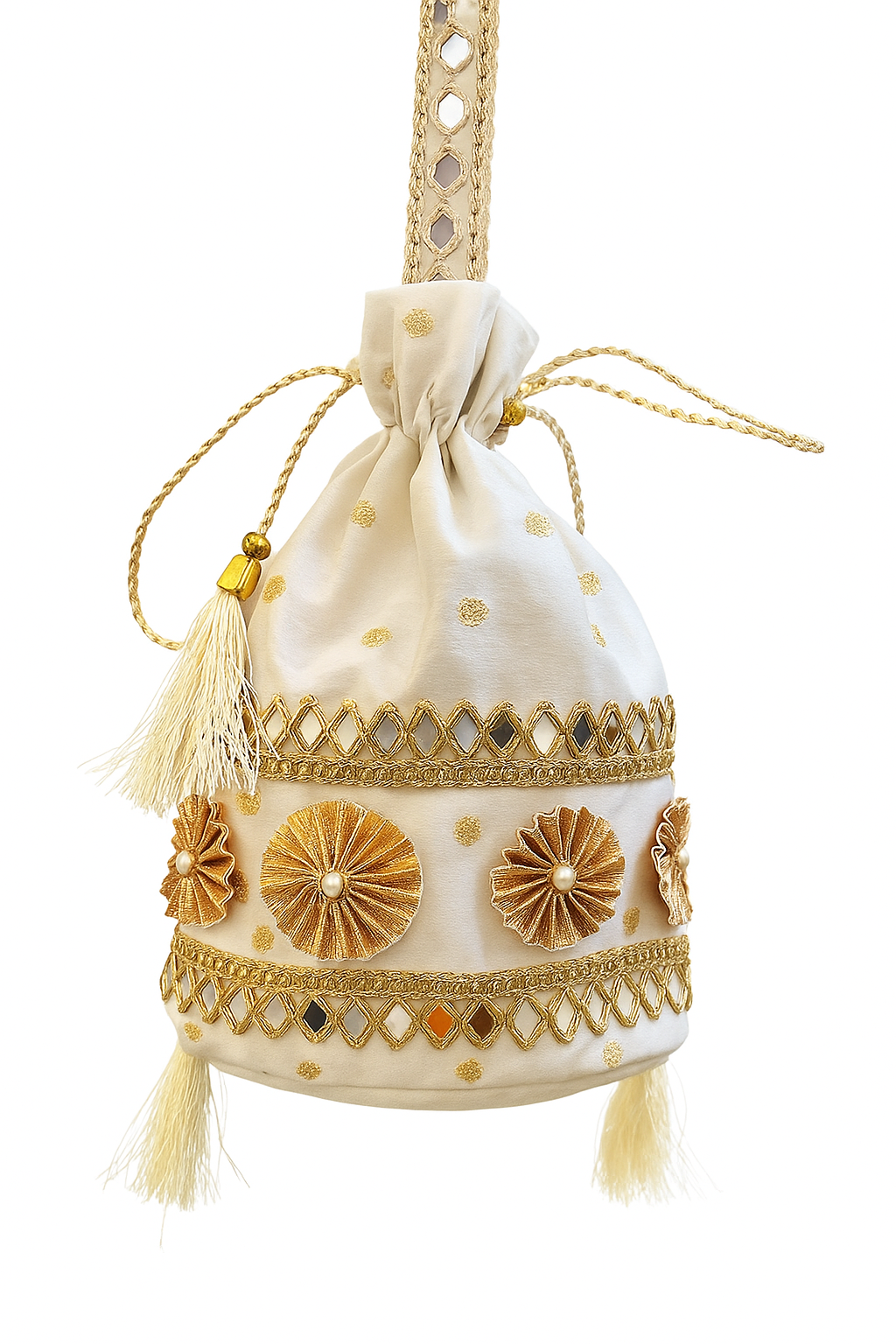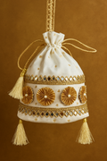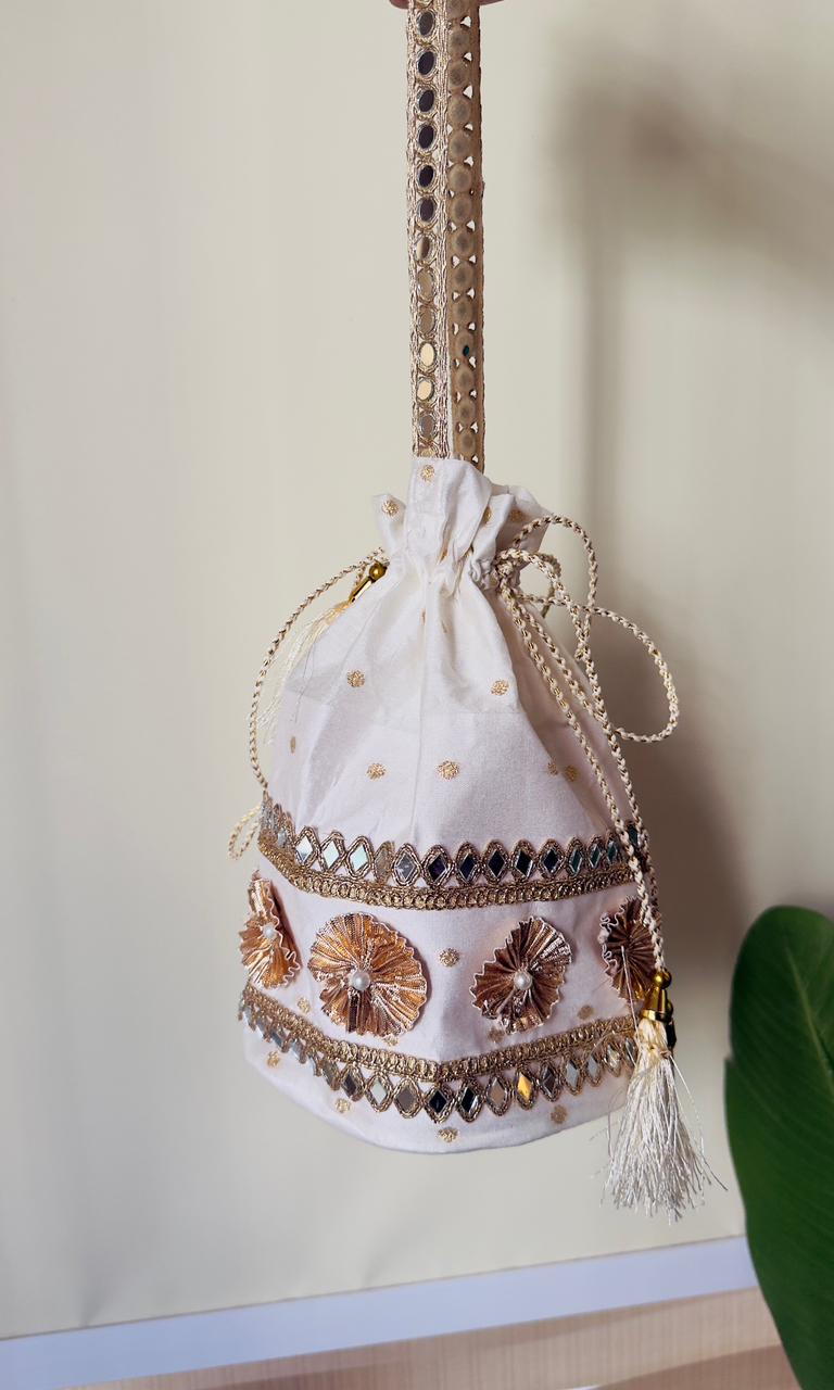 Elevate your ethnic elegance with this beautifully handcrafted potli bag, designed to add a royal touch to any occasion. The bag features intricate zari embroidery paired with delicate bead detailing, creating a perfect blend of tradition and luxury. Its rich texture and fine craftsmanship make it an eye-catching accessory for weddings, festive events, or special celebrations.