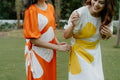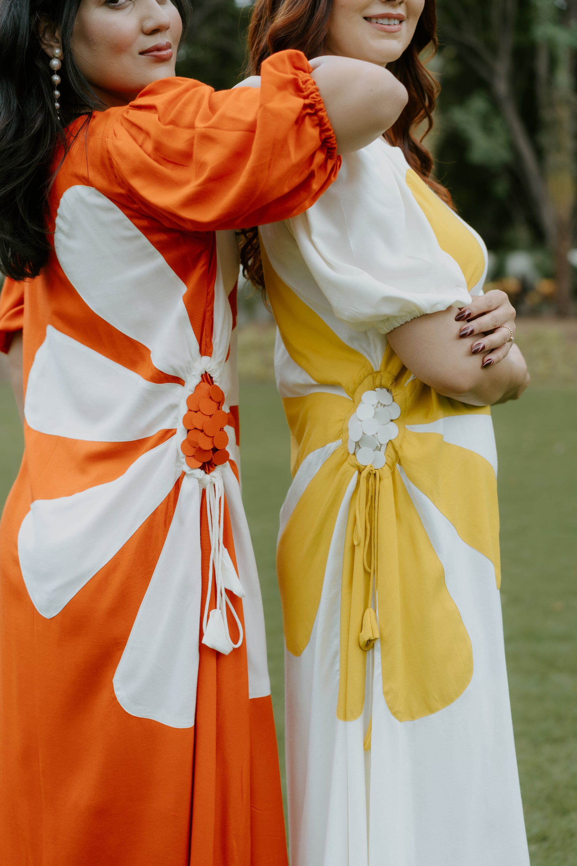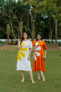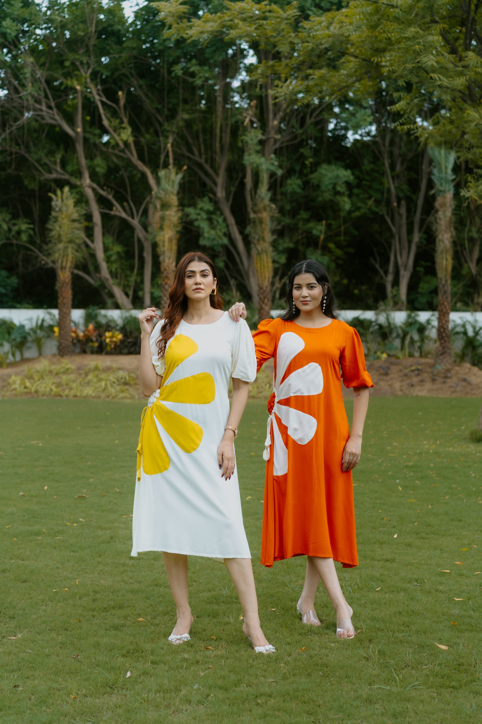 Elevate your vacation or brunch look with this breezy midi dress, adorned with elegant floral patchwork. Choose between two vibrant styles — orange with white flowers or white with yellow flowers. Designed for comfort and charm, it's your go-to outfit for sunny, stylish days.