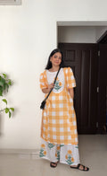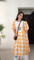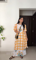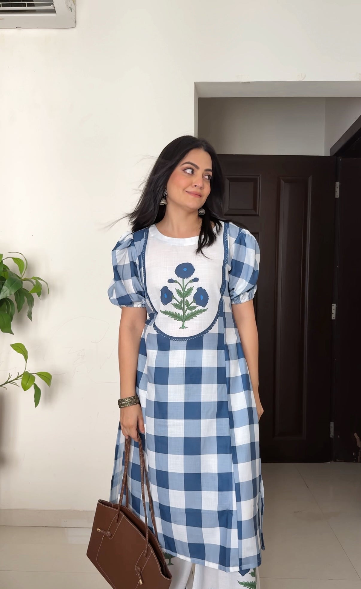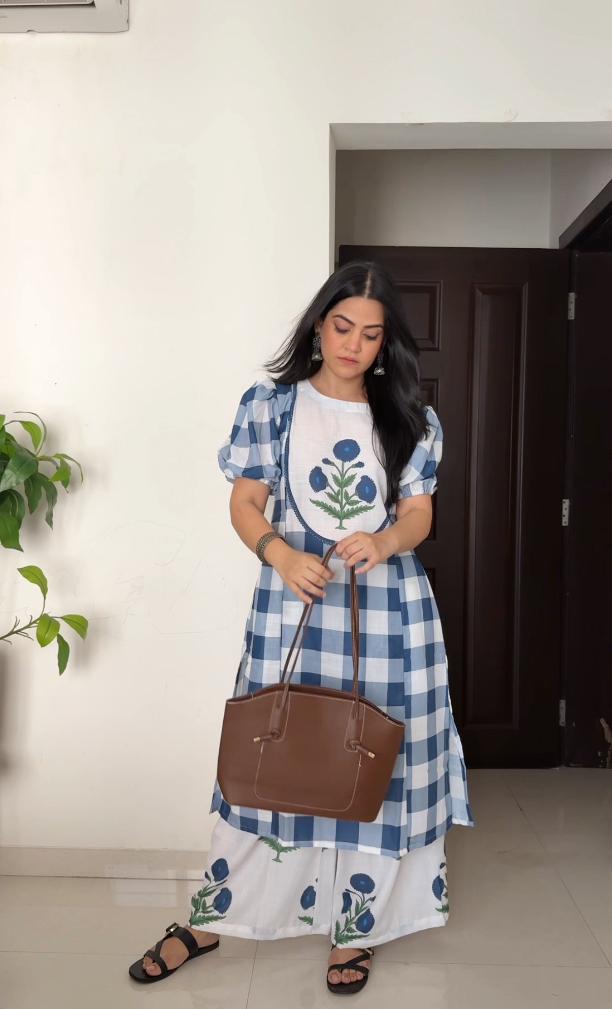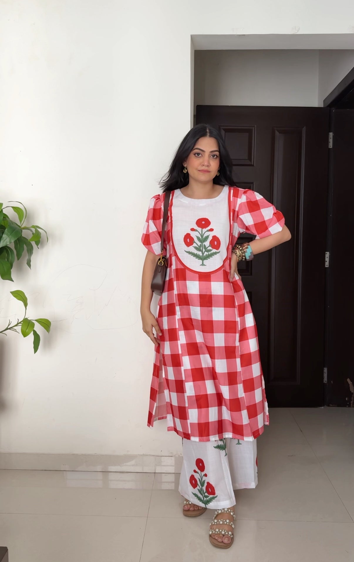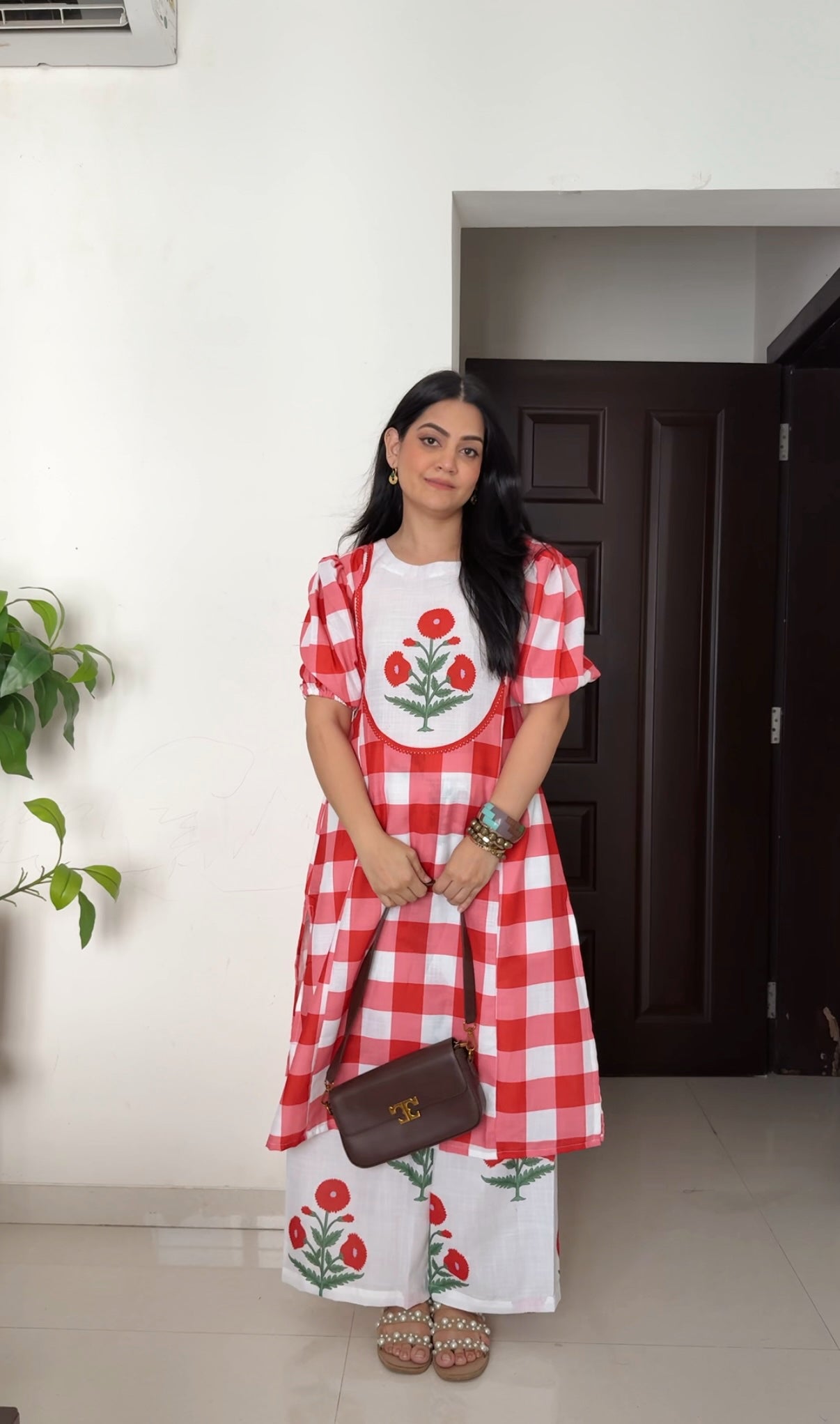 Step into timeless charm with our Floara Checks Cordset, crafted in soft, breathable cotton. Featuring classic gingham checks and delicate floral print, this coord set blends playful nostalgia with everyday comfort. The relaxed silhouette and puff sleeves add a touch of vintage sweetness — perfect for brunch dates, weekend getaways, or cozy summer days.