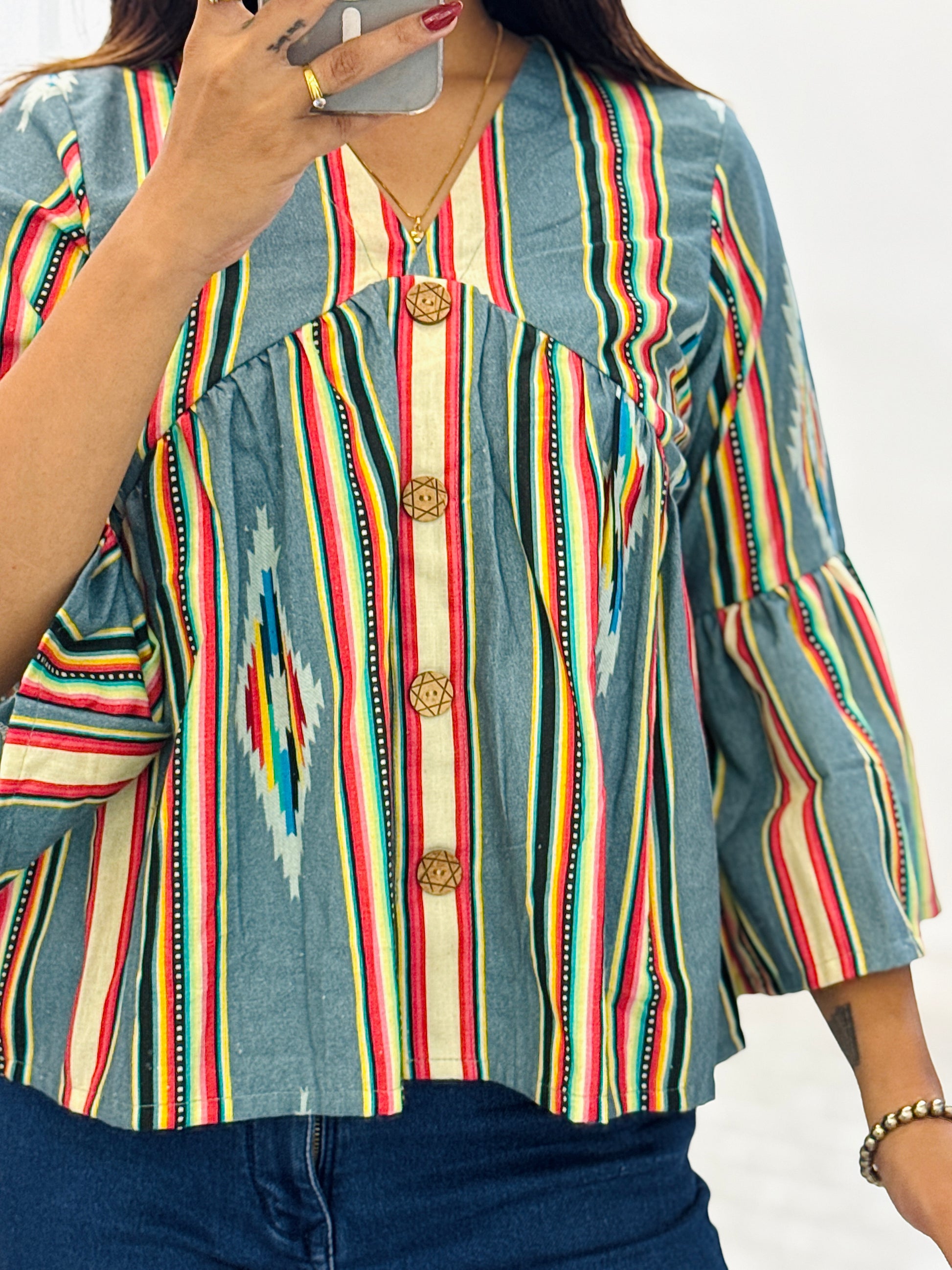 Add a splash of color to your wardrobe with this oil blue flex top featuring striking digital prints. Designed for both office wear and casual outings, it offers comfort and style in one versatile piece. Soft, breathable, and effortlessly chic.