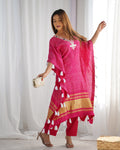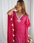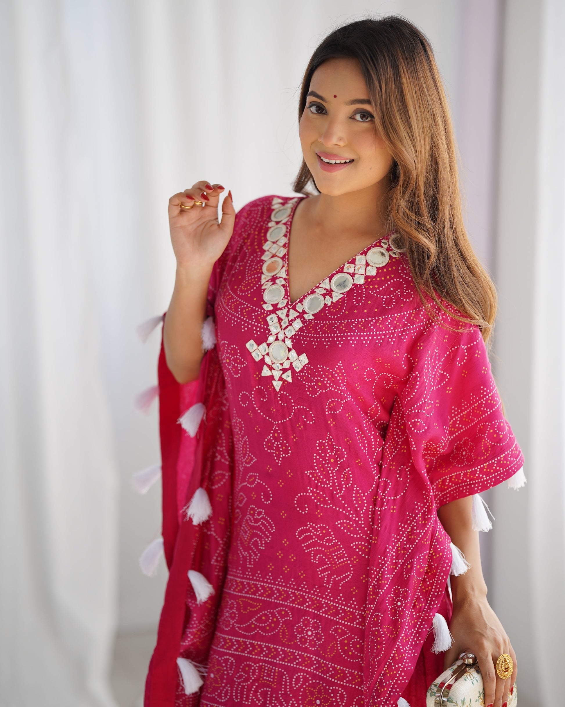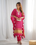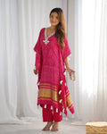 Step into festive elegance with this rani pink fuchsia glamour kaftan, beautifully adorned with white tassels and intricate mirror embroidery on the neckline. The golden border adds a touch of luxury, making it the perfect outfit for special occasions.