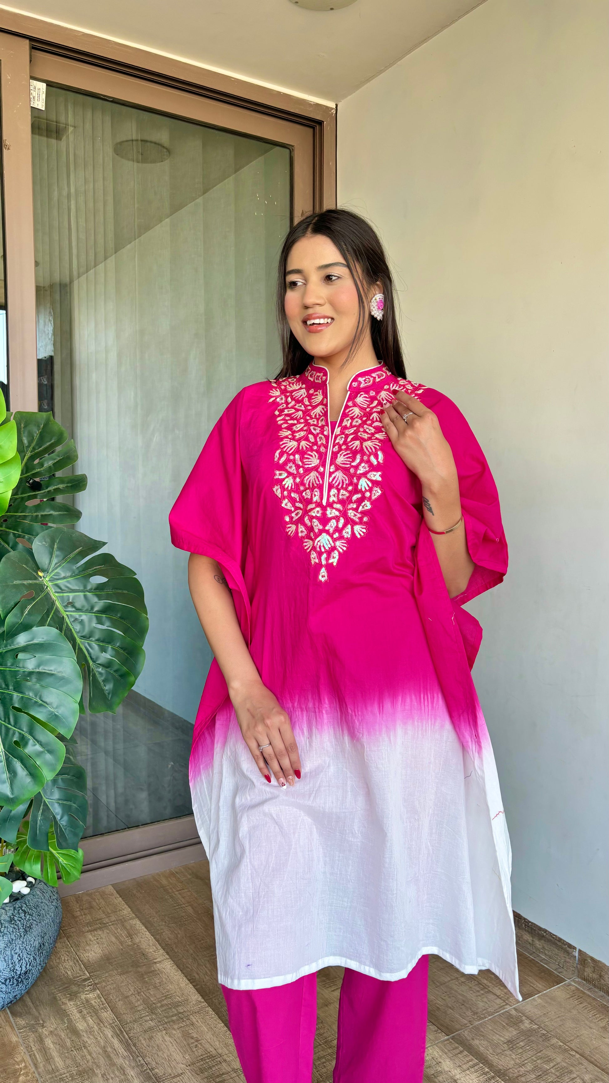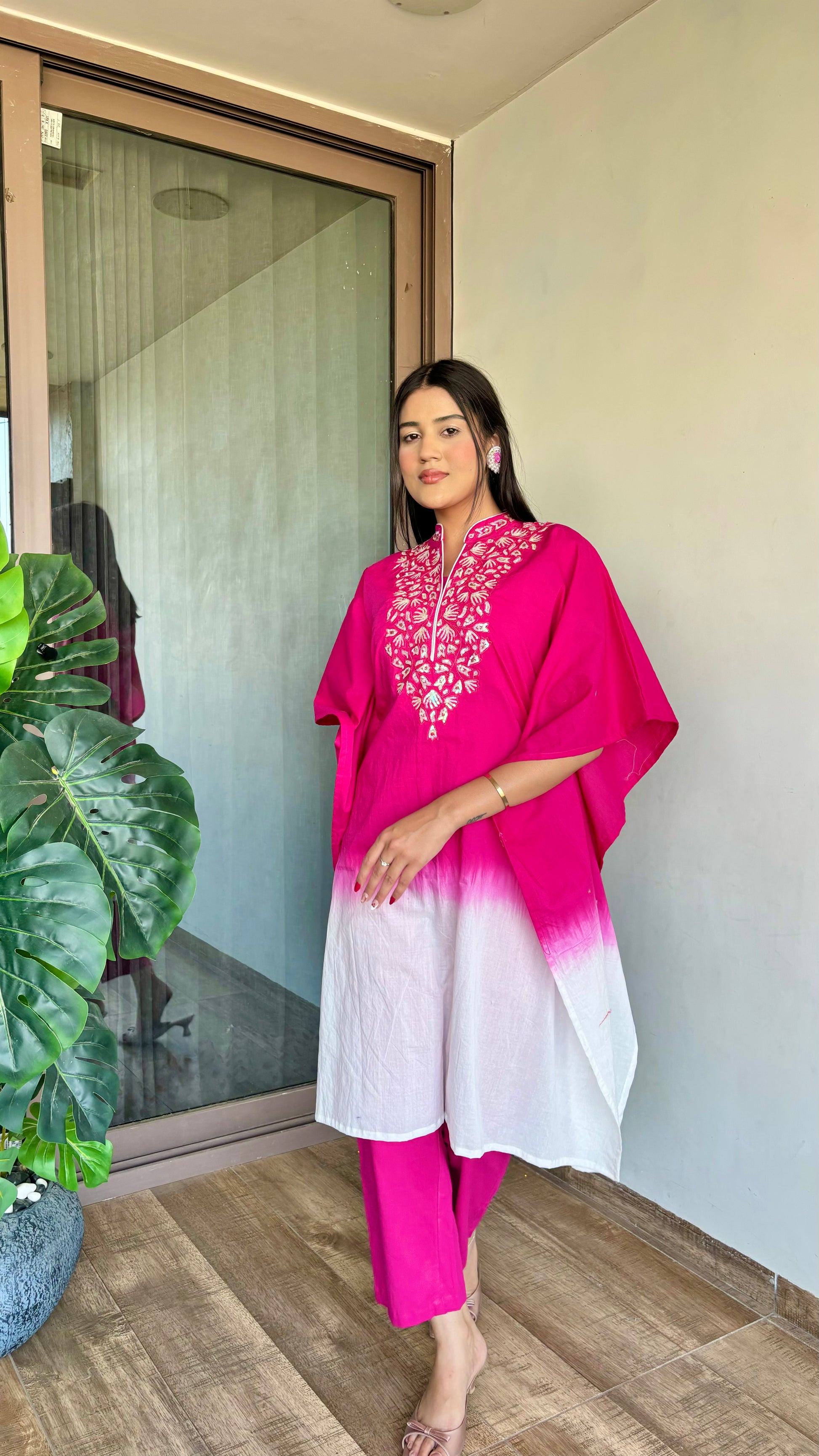 This kaftan-style cotton cord set features soft dyed hues and delicate sequin detailing on the neckline. Designed for breezy comfort with a touch of glam, it's perfect for effortless day-to-evening transitions.