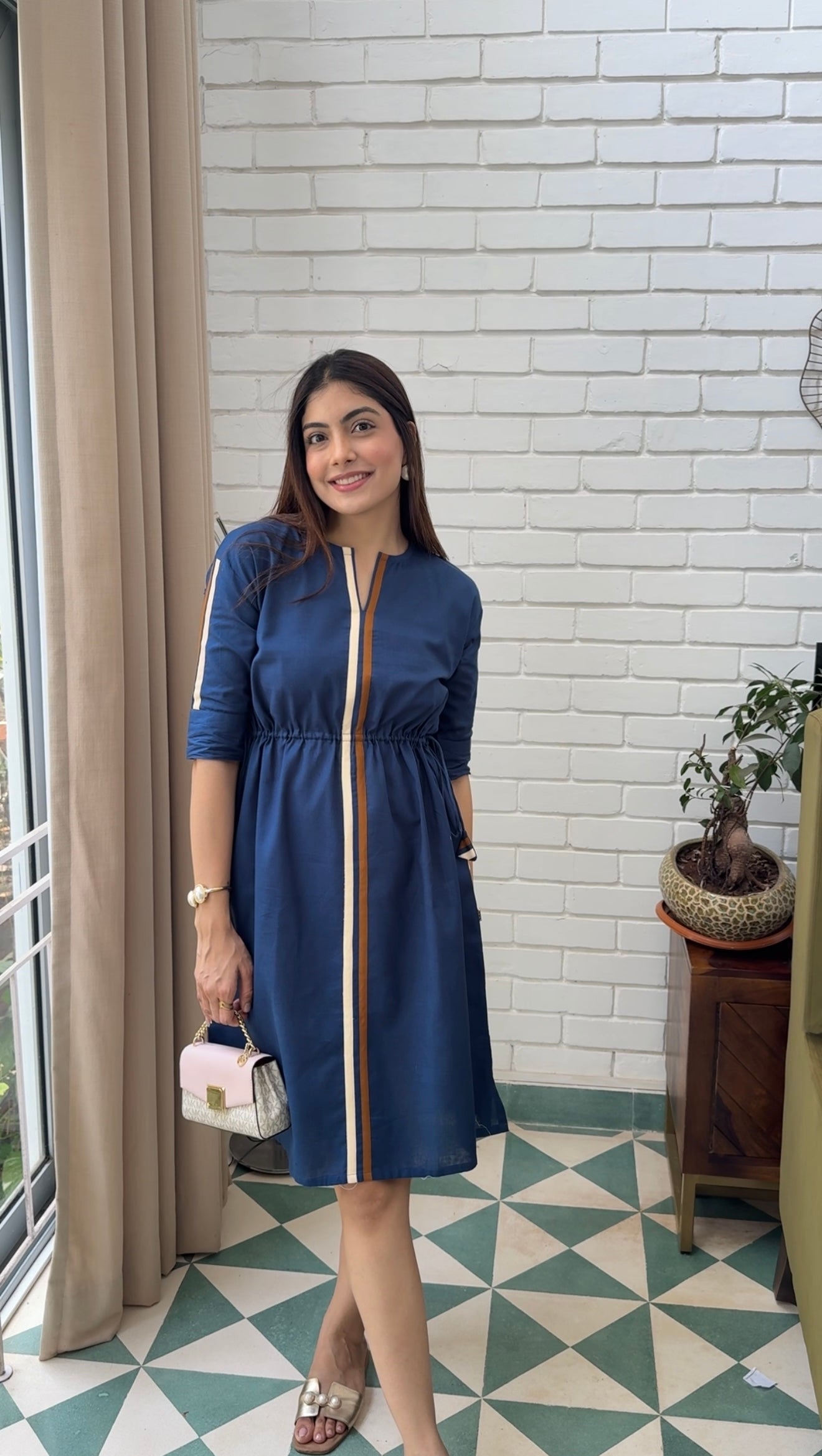 The deep blue base is beautifully highlighted with contrast vertical stripe detailing along the front placket and sleeves, adding a modern, elongating effect to the silhouette. The straight-cut design with a comfortable fit ensures ease of movement while maintaining a polished look.