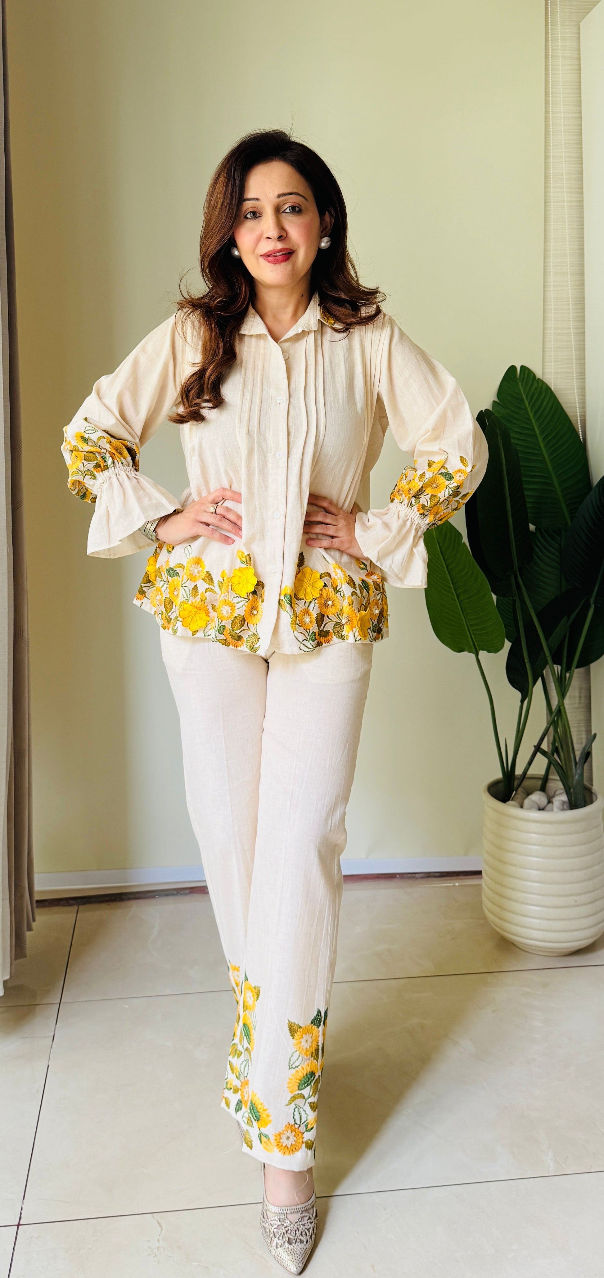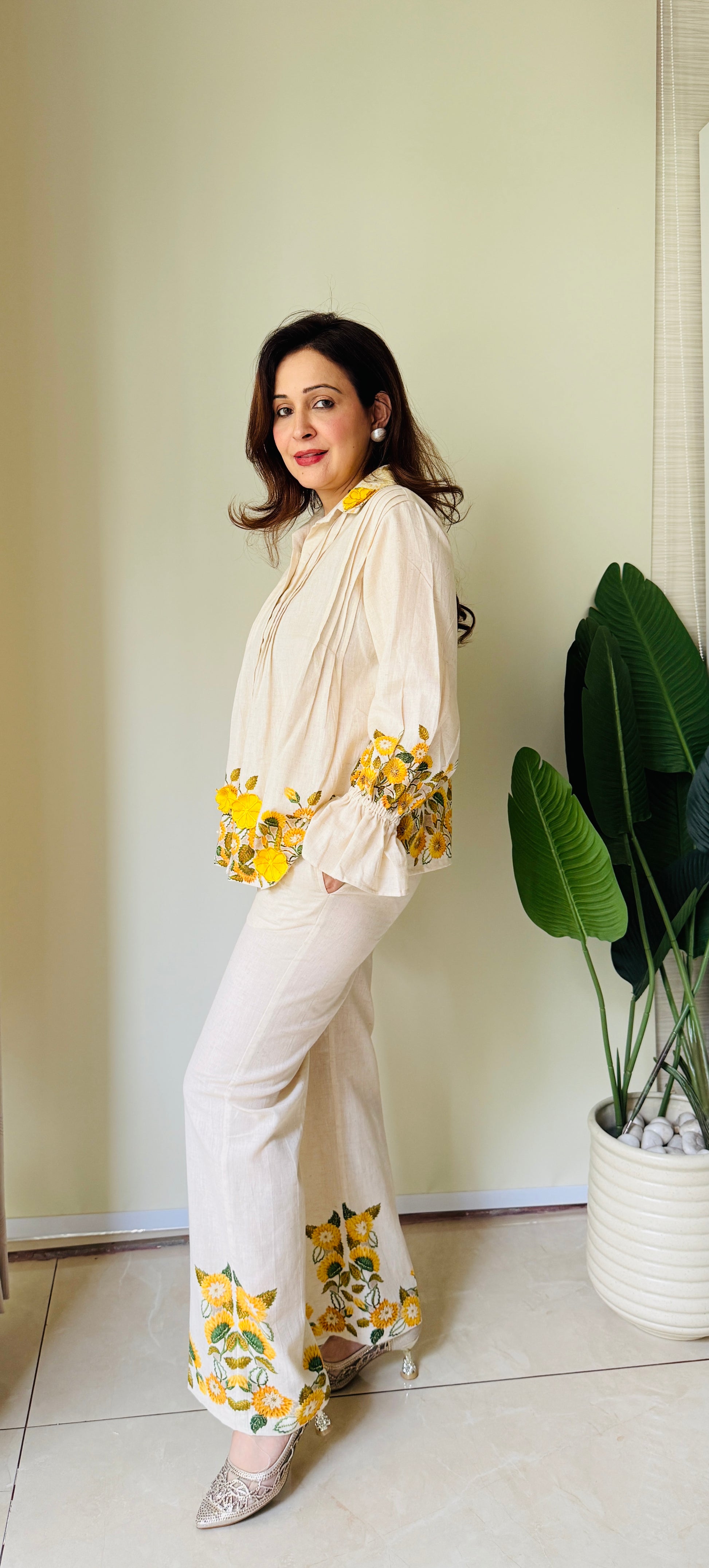 Earthy elegance meets playful charm — this khadi co-ord set features vibrant sunflower prints and delicate 3D floral patches for a fresh, handcrafted feel.
