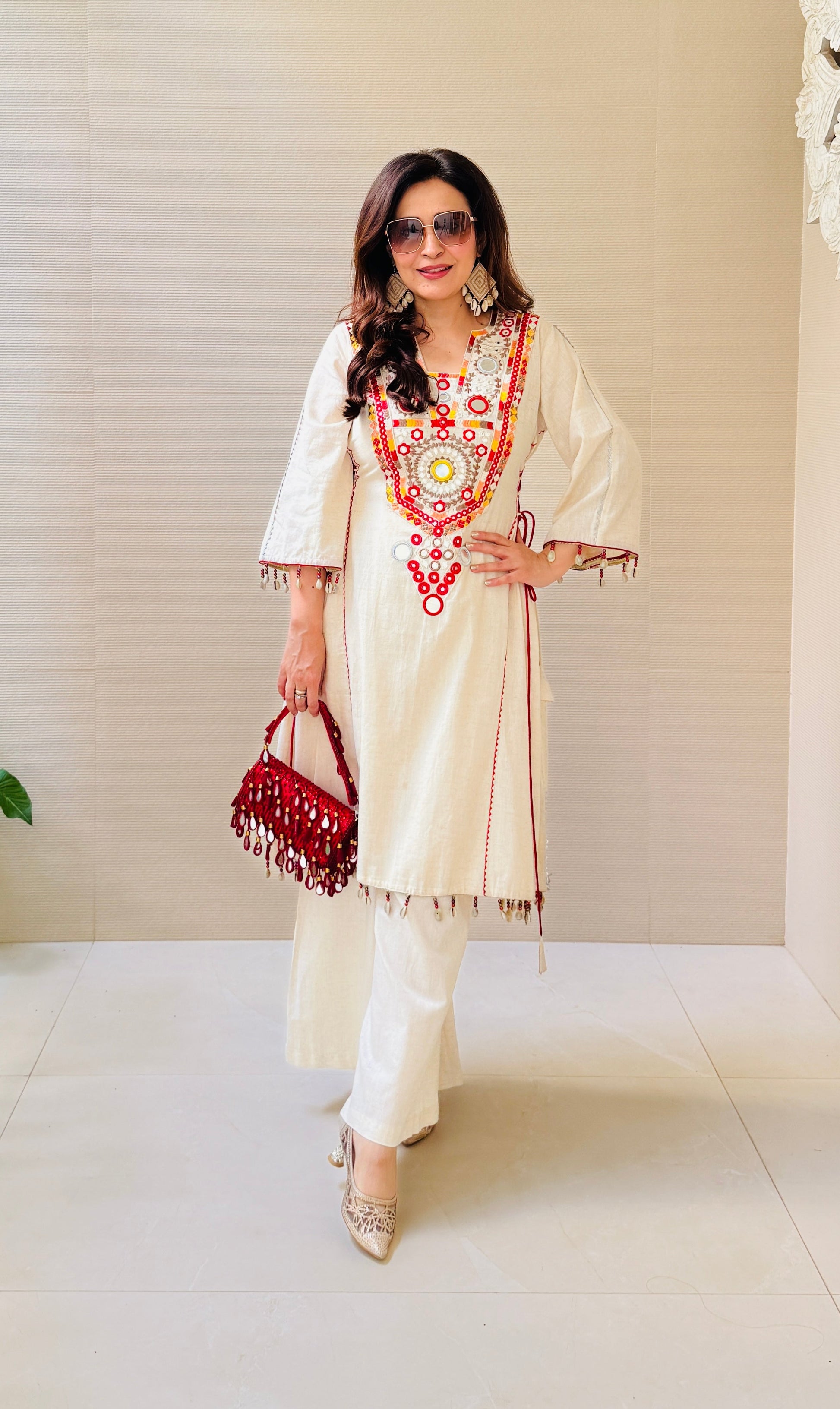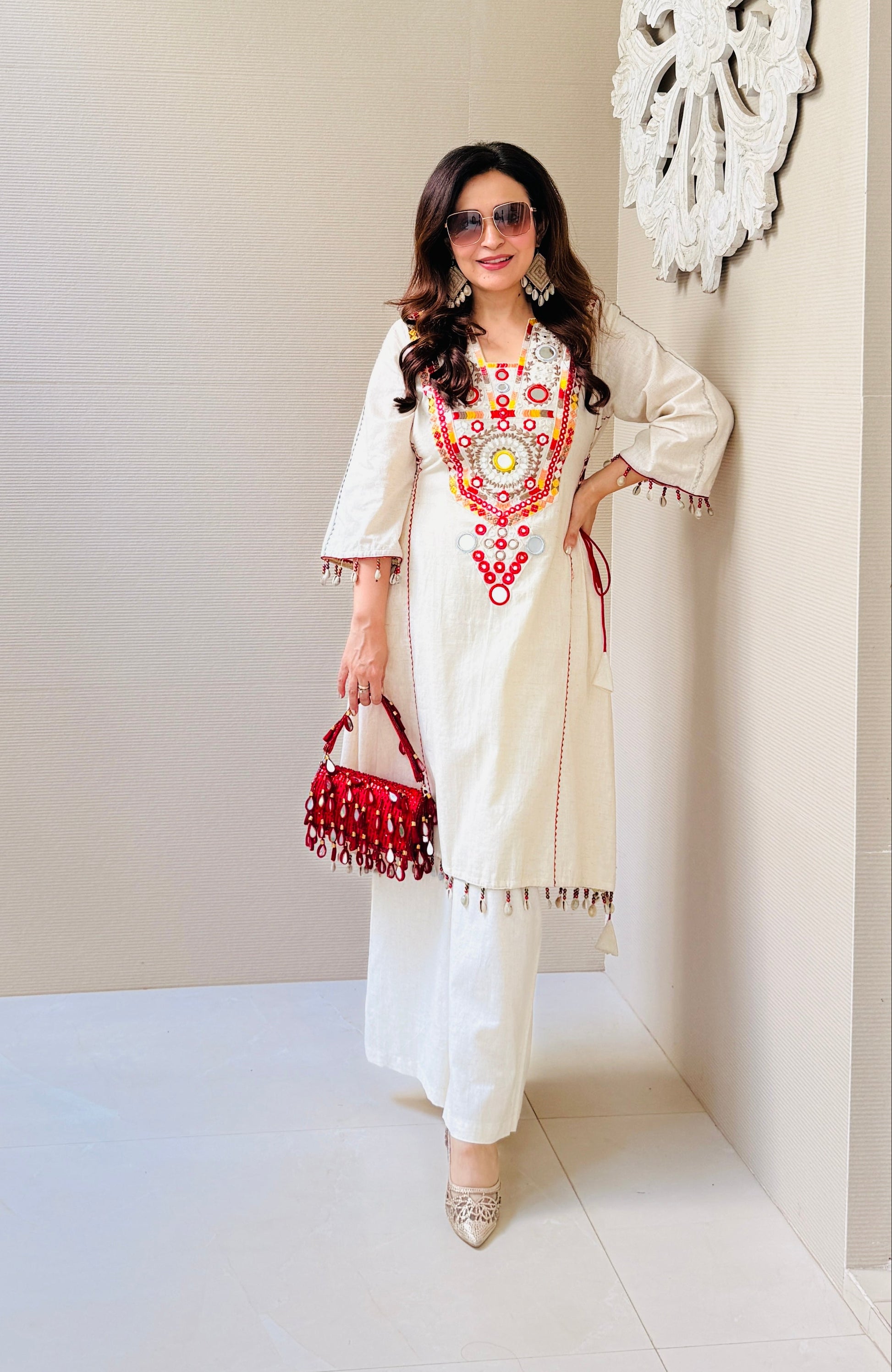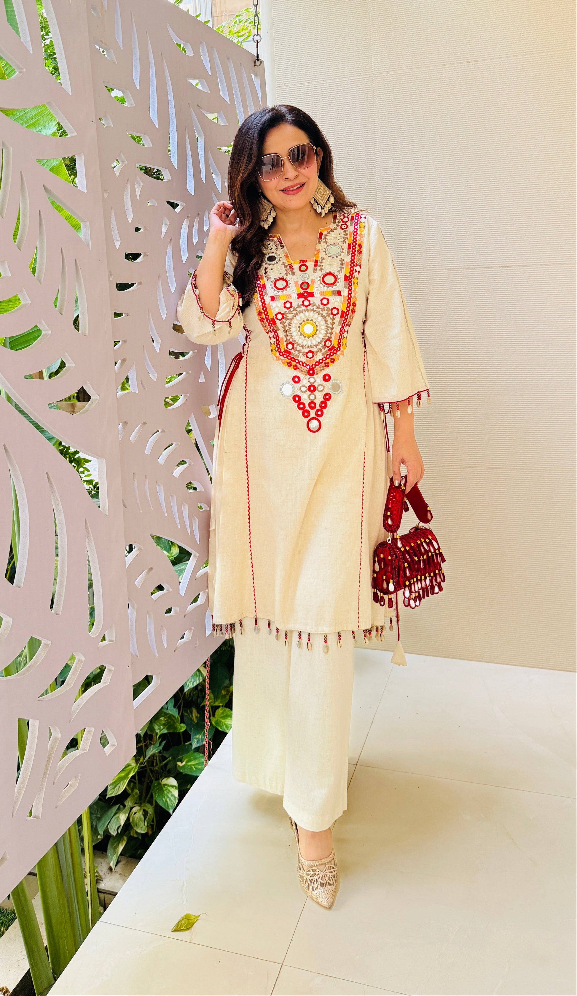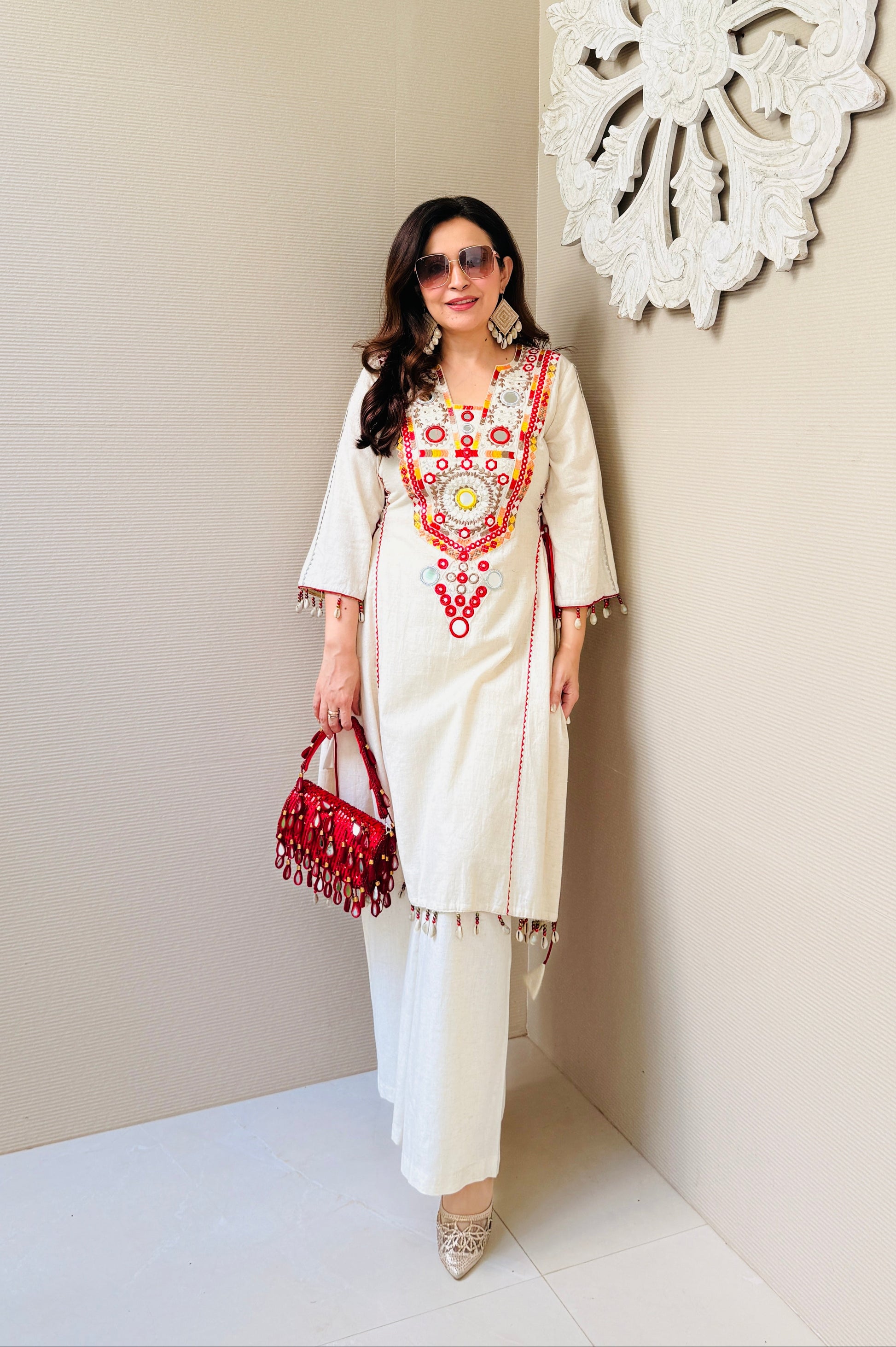 Step into effortless elegance with the Kodi Mirror Glow Set, crafted from soft Khadi fabric. Adorned with mirror work, subtle Kodi detailing, and a striking maroon dori, this kurta set brings a refined ethnic vibe. Perfect for brunches, casual days, or relaxed festivities.