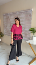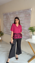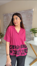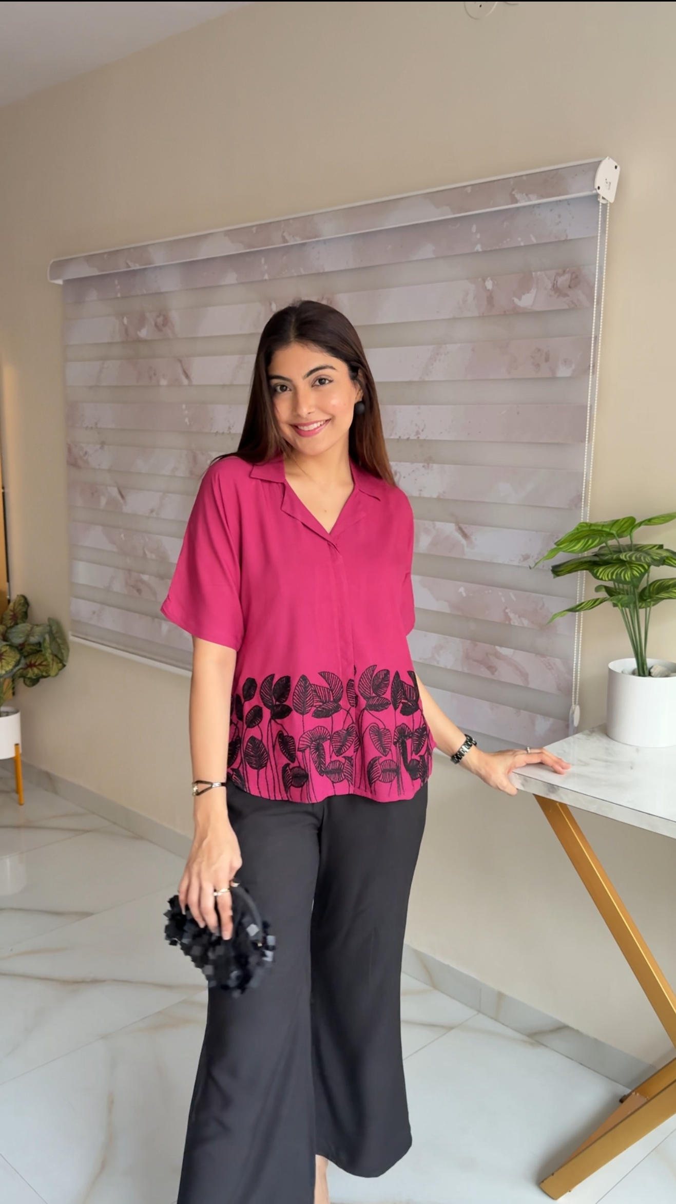 Elevate your everyday style with this chic two-piece co-ord set in a rich magenta shade. The top features a smart shirt collar with a clean button-down look, offering a perfect blend of casual elegance and modern charm. Its standout detail is the bold black botanical embroidery along the hemline—an artistic touch that adds sophistication and depth to the outfit.