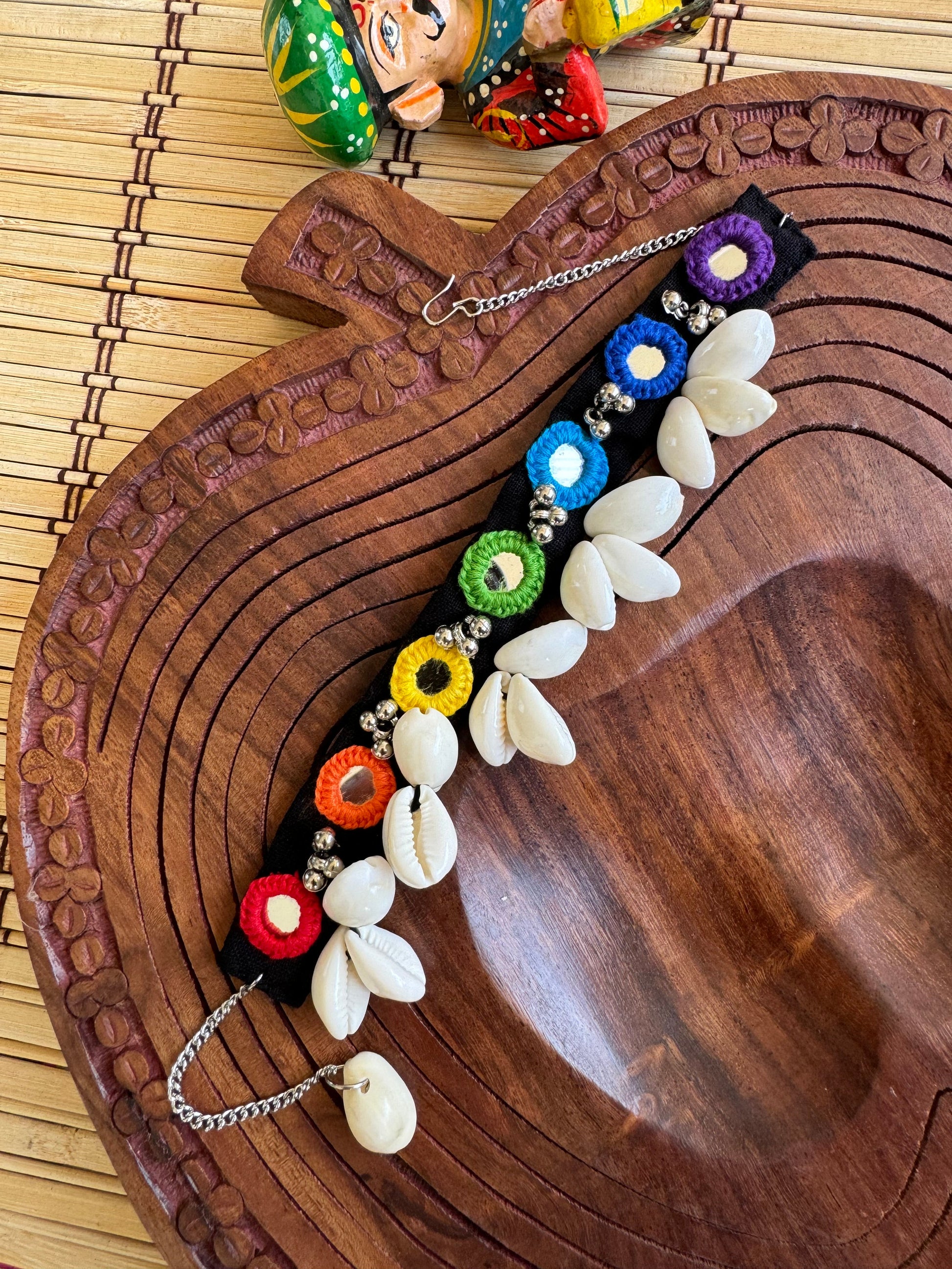 This Hand embroidered accessory finished with vintage ghungroos and pom poms can be wear as anklet, Choker or Bajubandh.