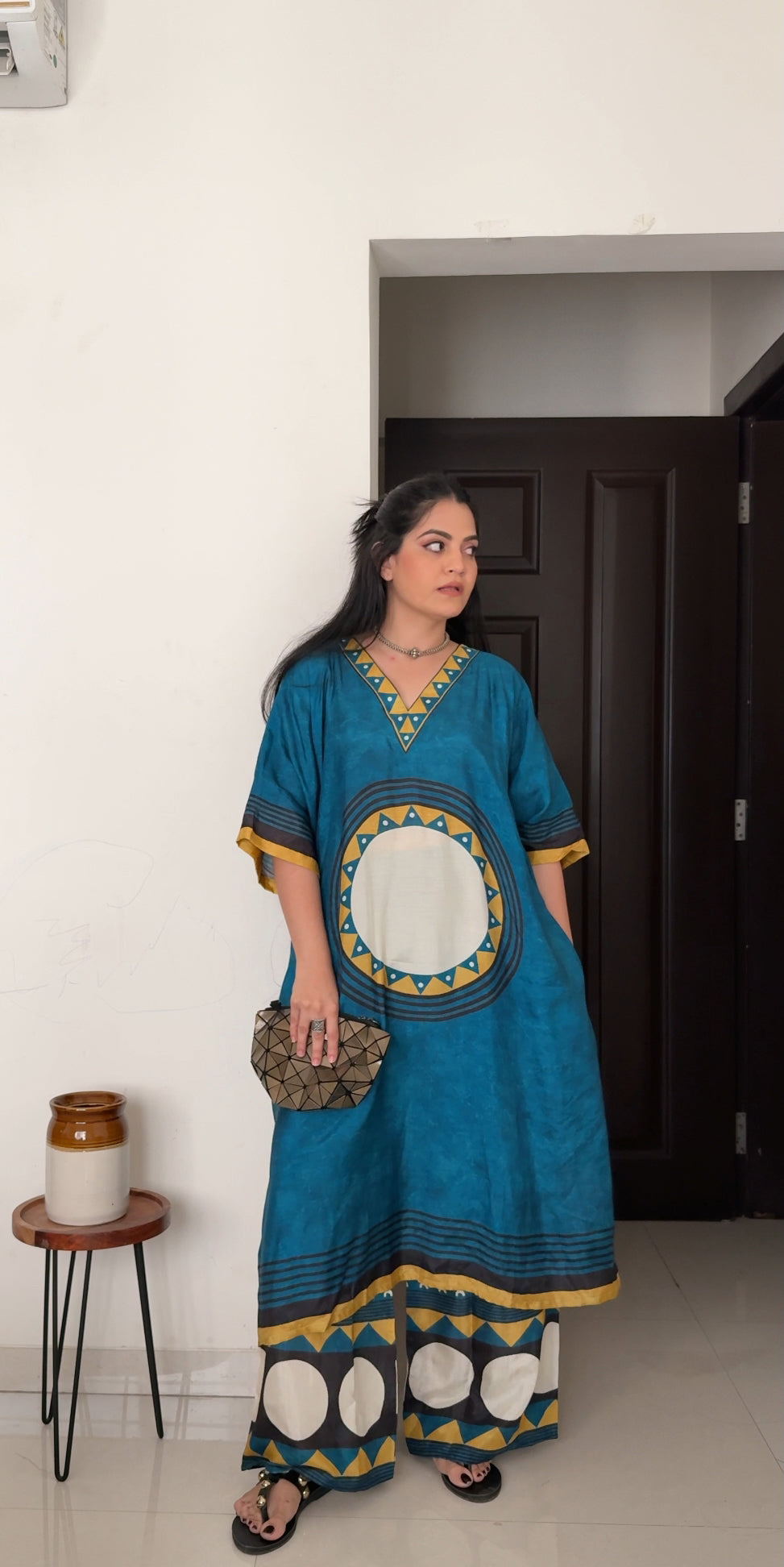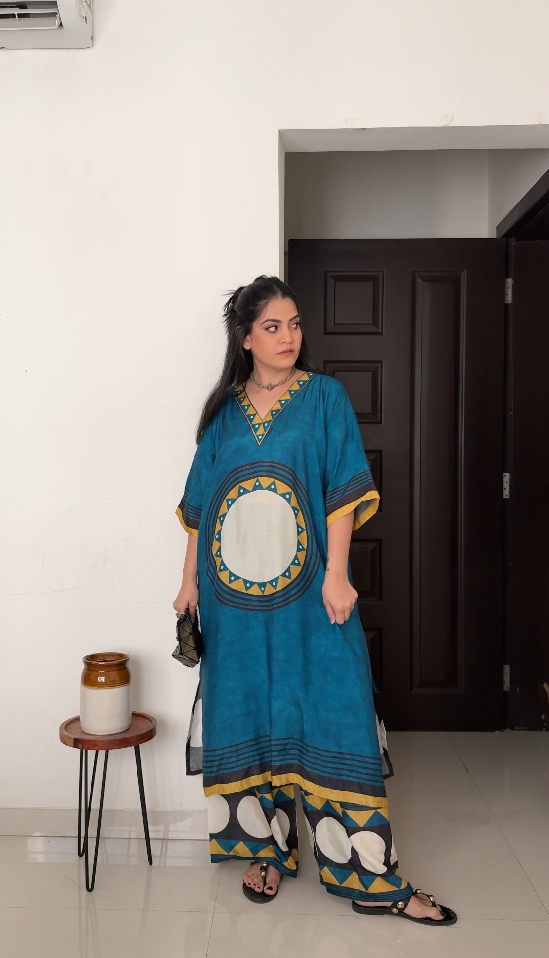 Step into refined style with this marine navy co-ord set, crafted from pure muslin with exquisite digital prints. Featuring a relaxed-fit kurta and flowy plazo, it’s your go-to for office chic, festive flair, or a stylish brunch. Lightweight, breathable, and effortlessly graceful.