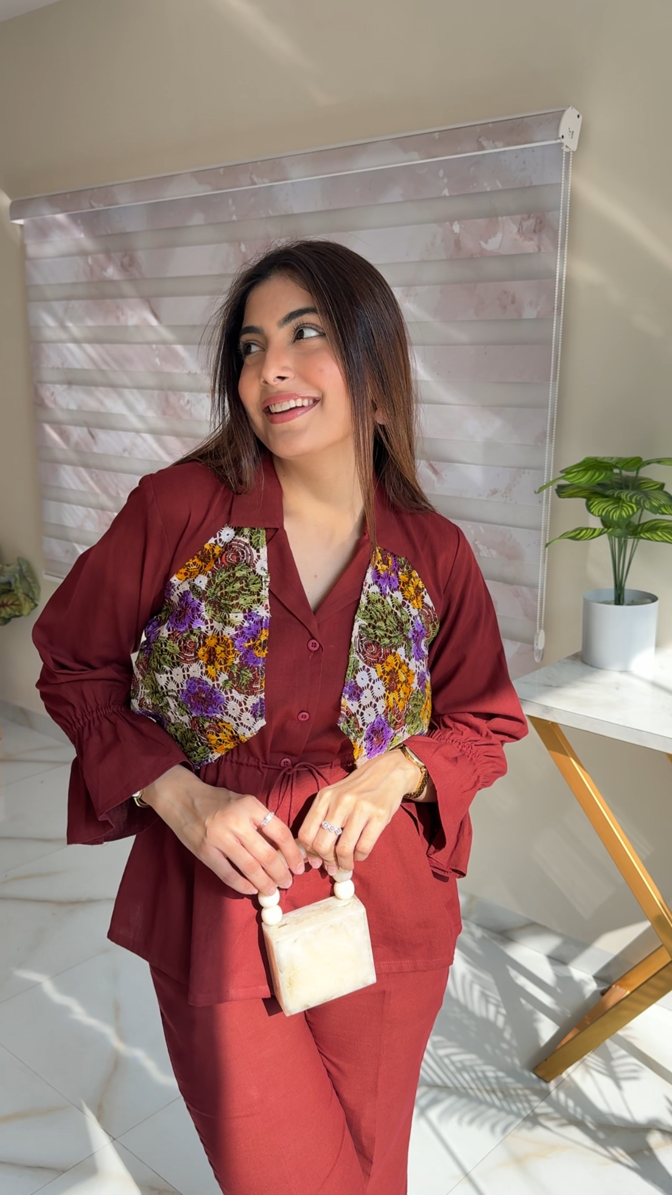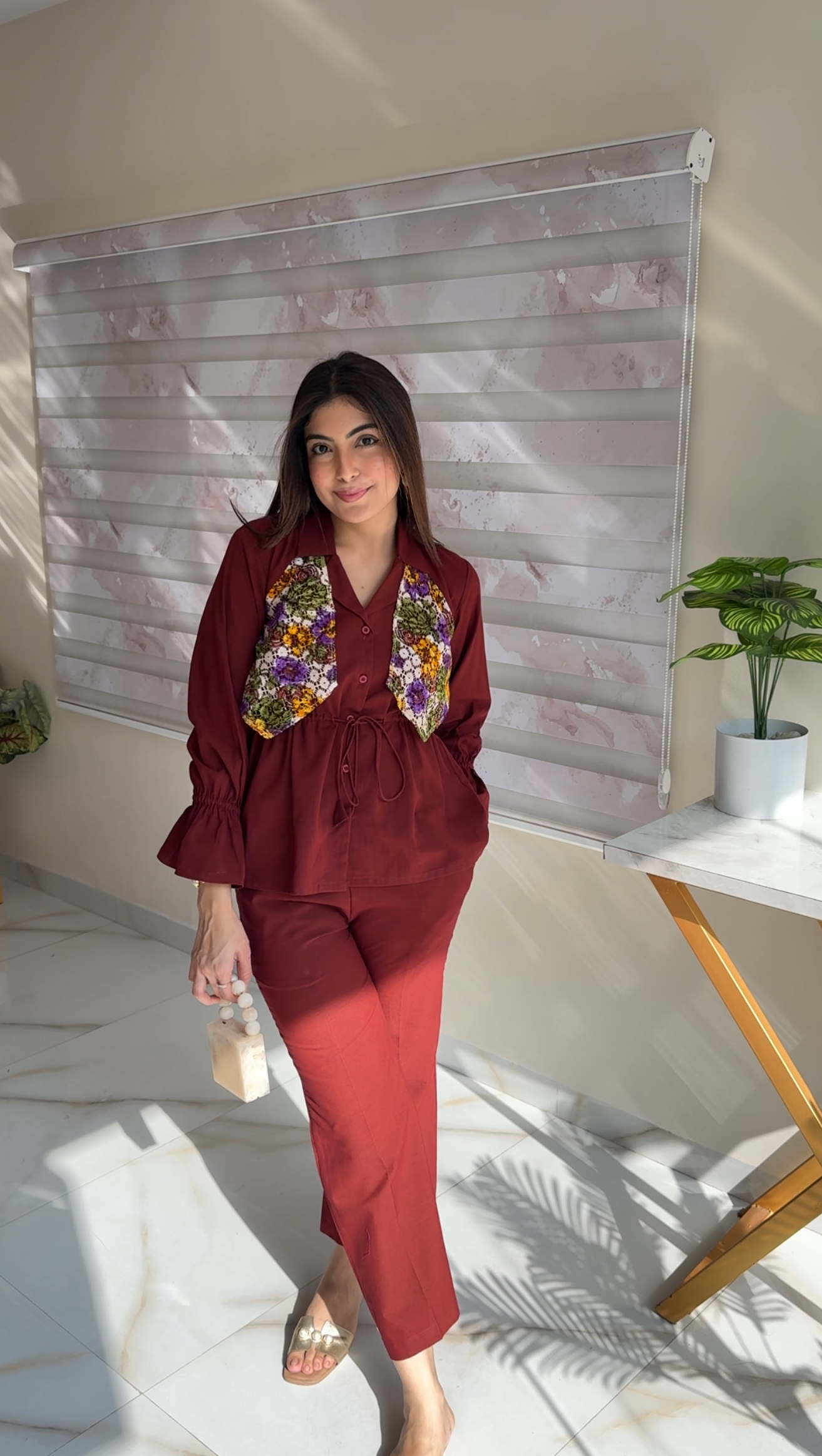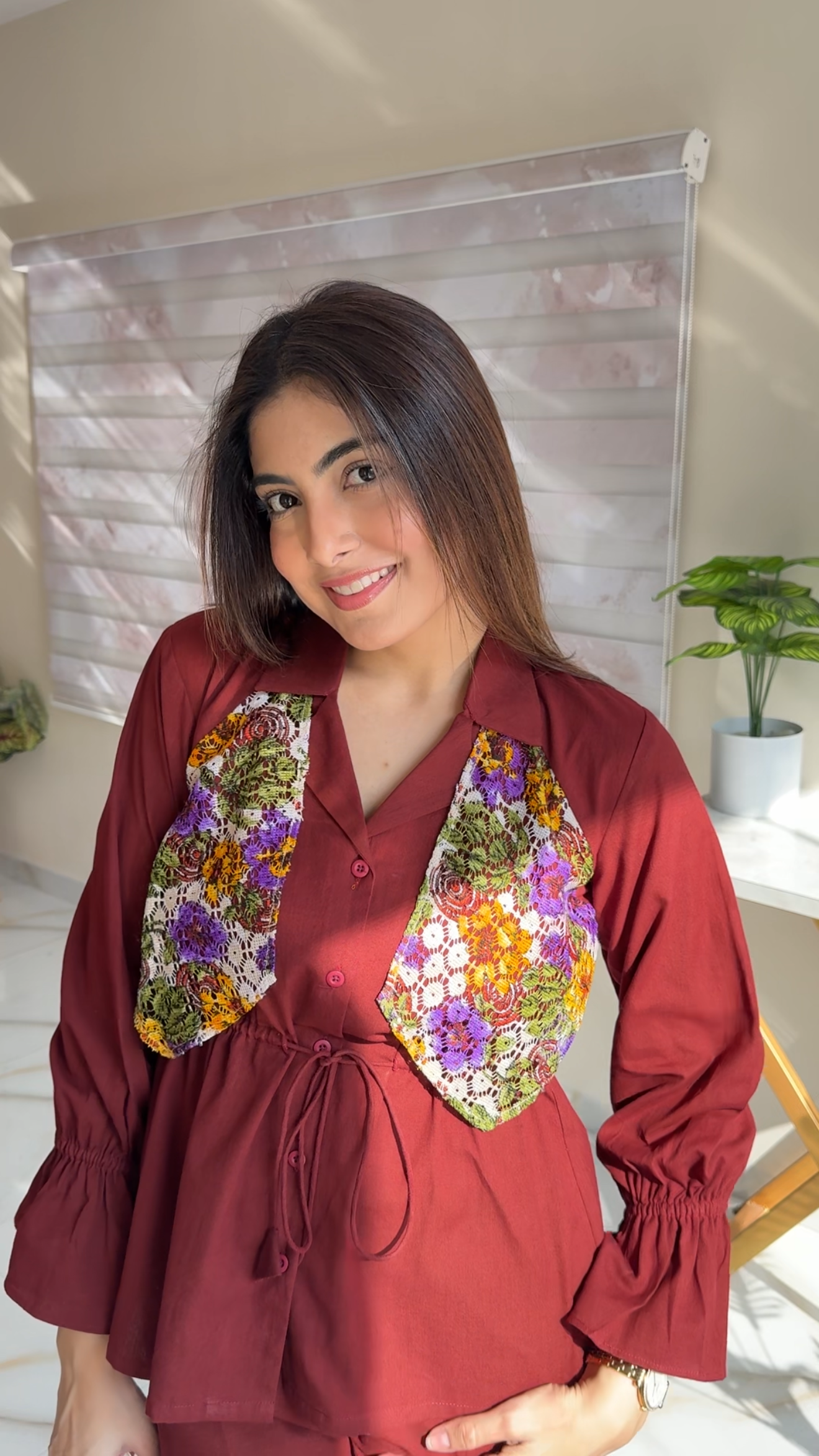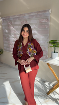 Elevate your style with this elegant and chic two-piece cord set, designed for comfort and standout appeal. The top features a rich maroon base with beautifully contrasted multicolor floral patchwork on the front, adding a vibrant, handcrafted charm. Its structured collar, front button detailing, and adjustable drawstring tie give it a modern, tailored finish.