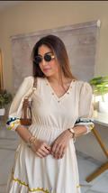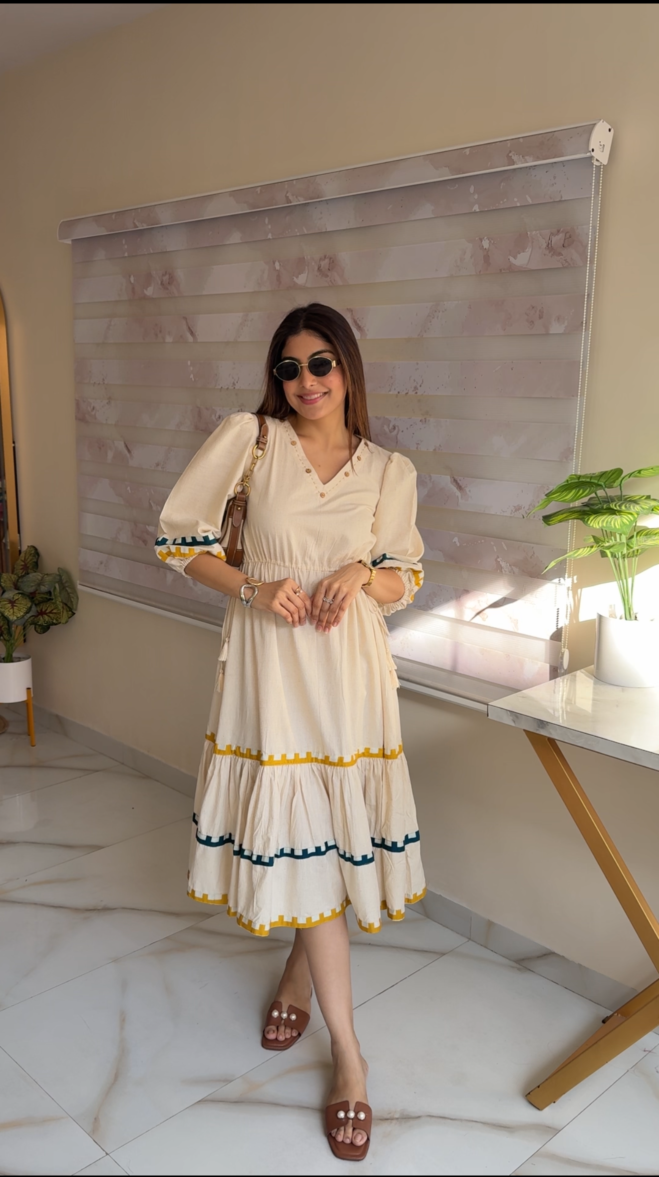 Featuring a flattering V-neckline accented with statement wooden buttons, full sleeves with elastic cuffs, and a gently gathered waist, this dress beautifully enhances your silhouette without compromising comfort. The tiered skirt with coordinated border detailing gives the outfit a breezy, flowy look—perfect for brunches, day outings, vacations, or relaxed festive gatherings.