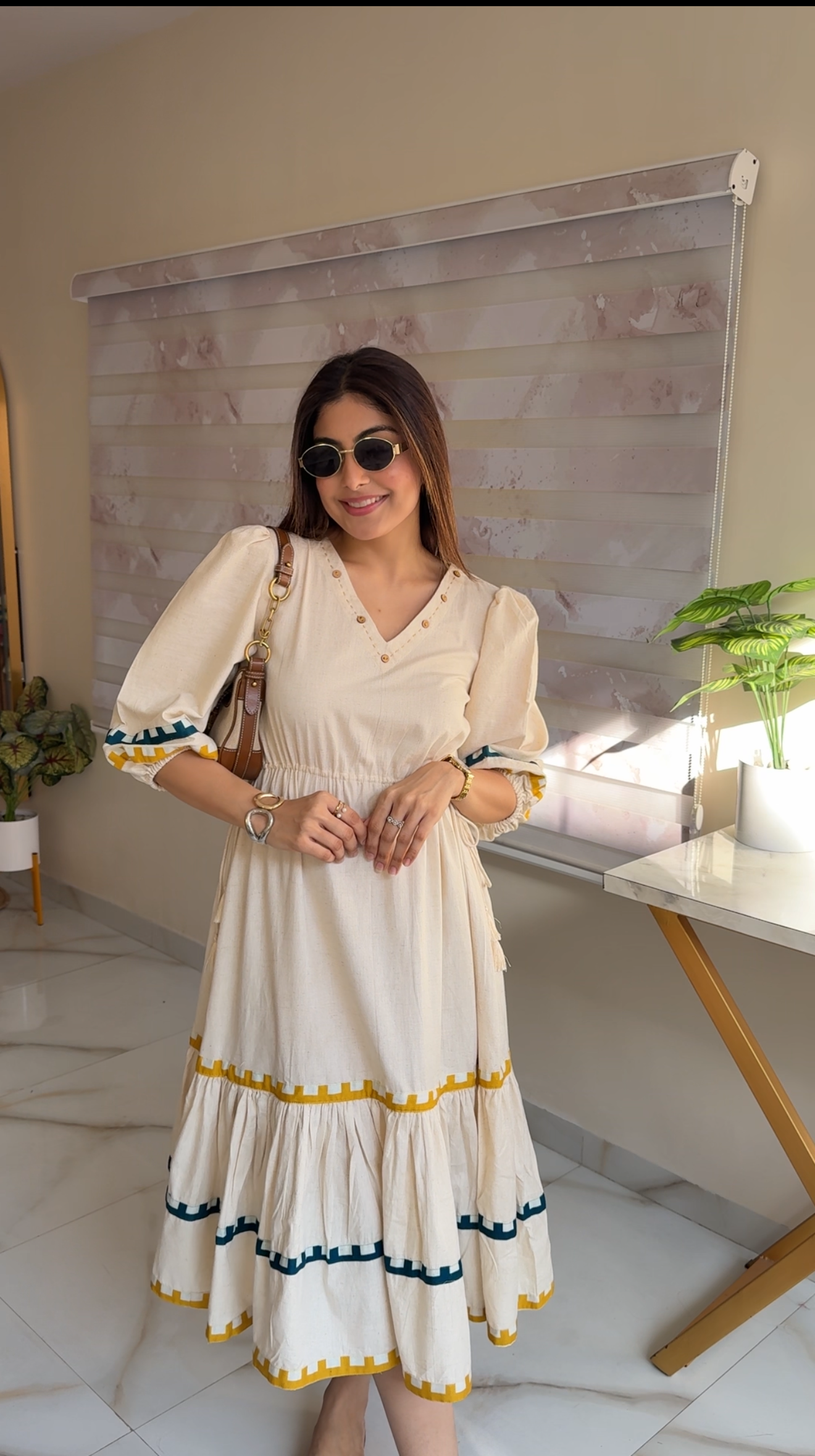 Effortlessly elegant and full of charm, this 100% premium cotton dress is designed for comfort, style, and everyday grace. The soft off-white base brings a soothing, natural feel, while the unique geometric panel detailing in mustard yellow and deep blue adds a pop of modern artistry.