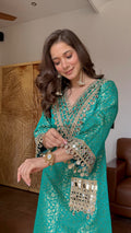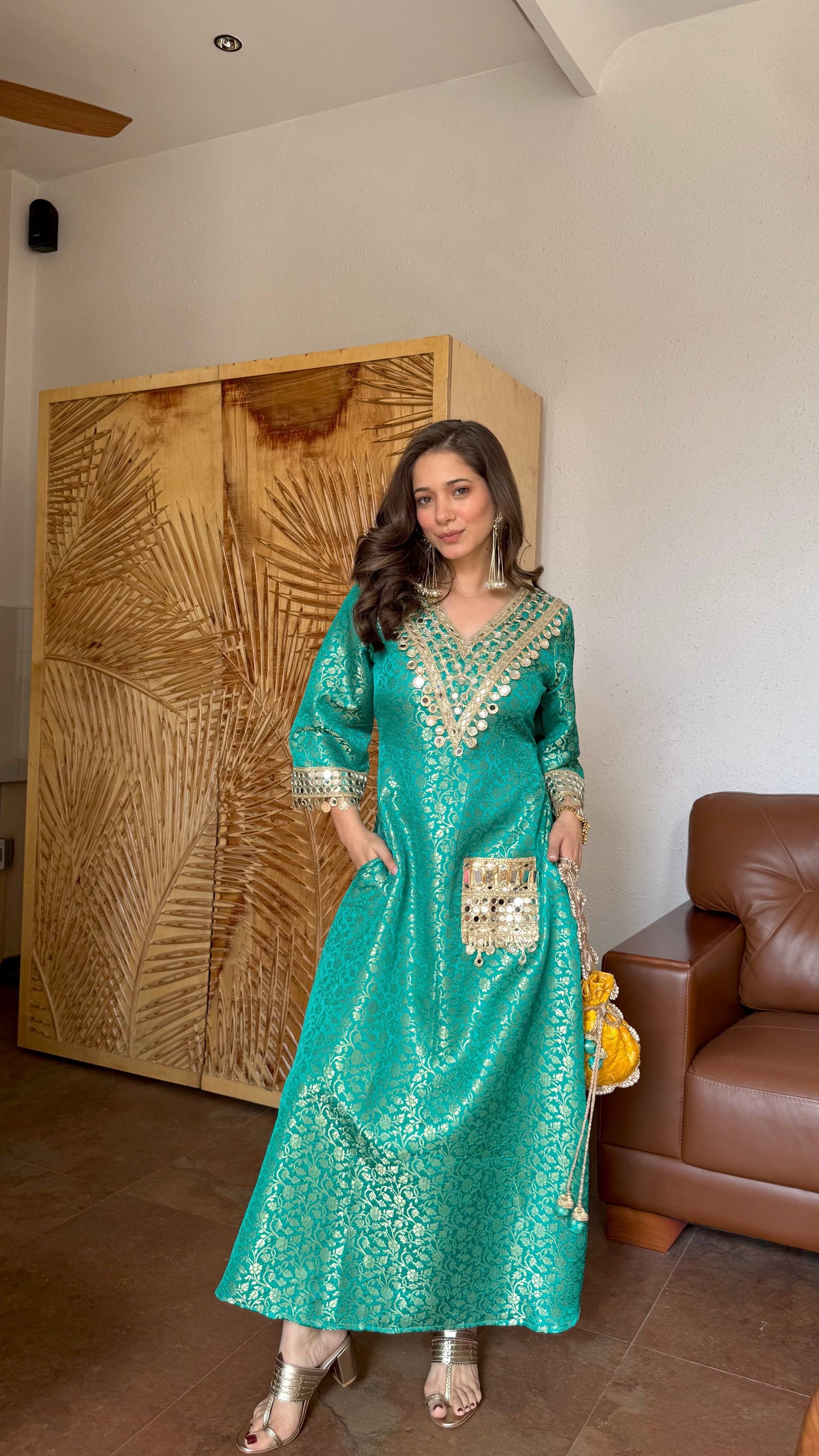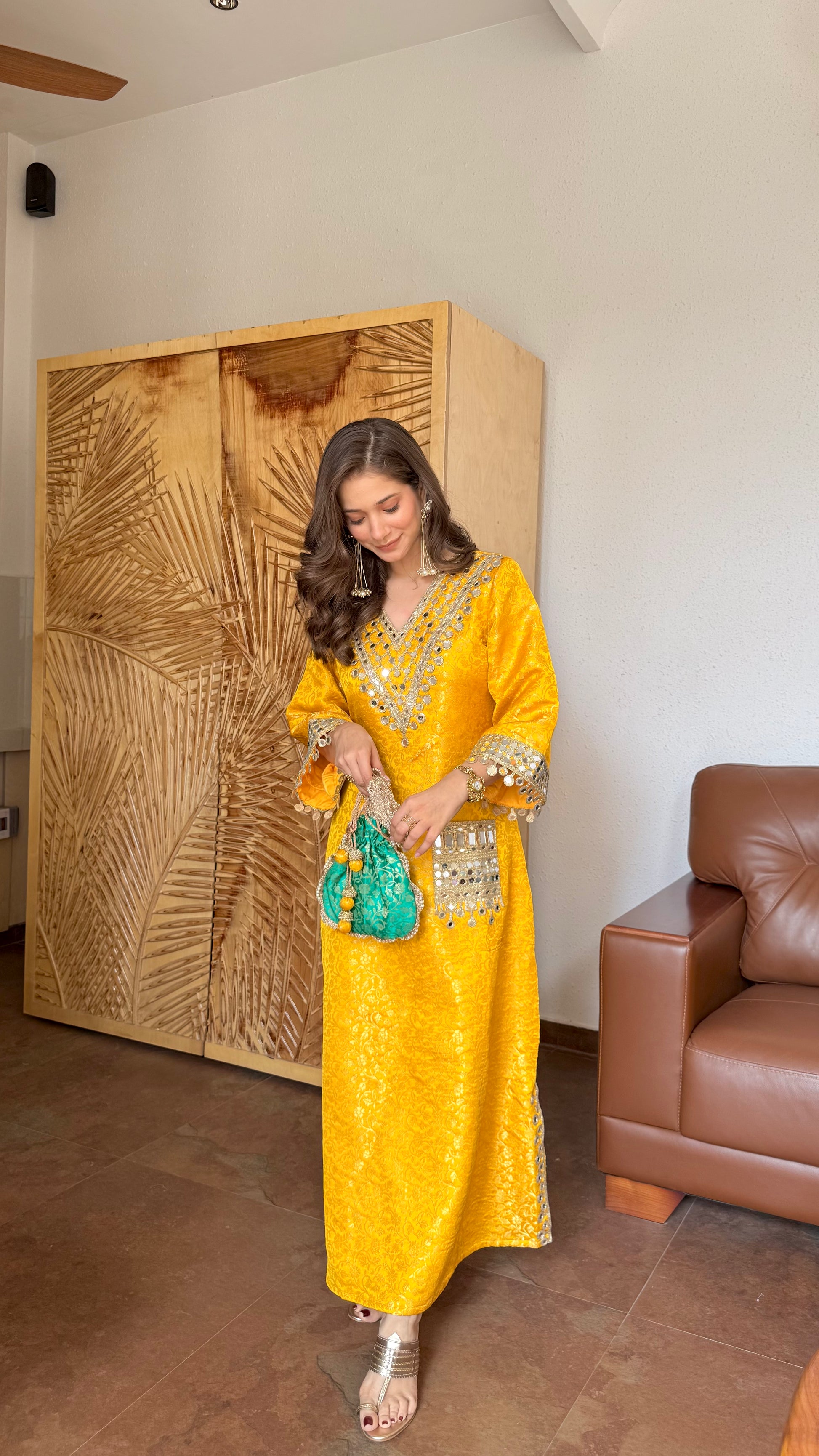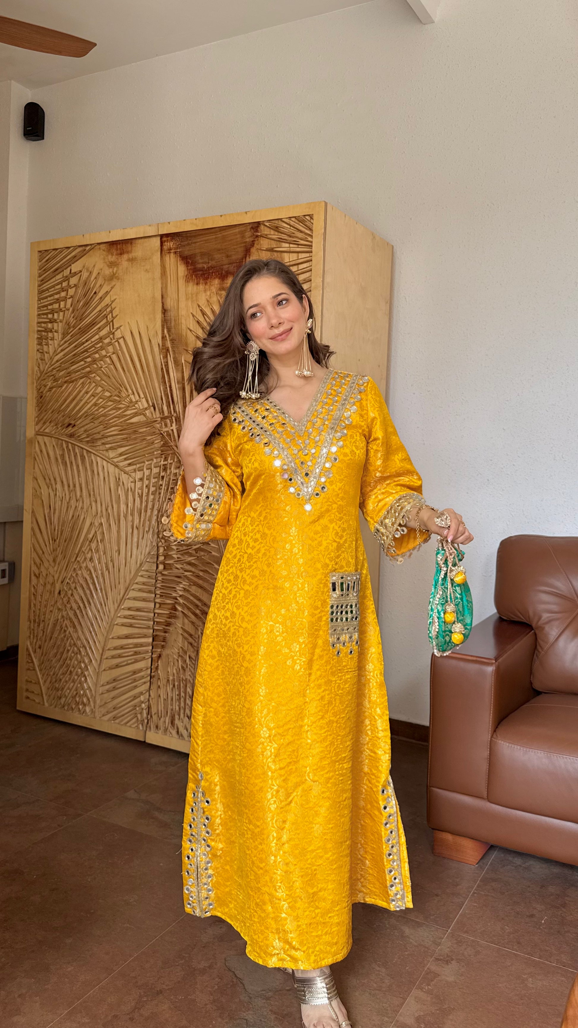 The beautifully detailed V-neckline is adorned with intricate mirror work and fine gota lace, adding a shimmering touch that enhances its regal appeal. The sleeves are gracefully finished with matching mirror embellishments, while the stylish mirror-work pocket adds a unique and contemporary twist. It comes with contrast matching potli bag