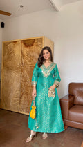 Step into timeless elegance with this exquisitely crafted brocade kaftan, designed for women who love royal charm with modern grace. Made from luxurious brocade fabric featuring delicate woven floral motifs, this piece radiates sophistication and festive grandeur.