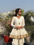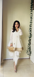 Bring effortless elegance to your festive wardrobe with this stunning Kali Flared Kurti paired with a Dhoti Pant. Designed in a soft ivory-cream tone, this outfit radiates pure sophistication. The kurti features a graceful V-neckline embellished with handcrafted mirror work, adding a subtle festive sparkle.