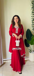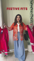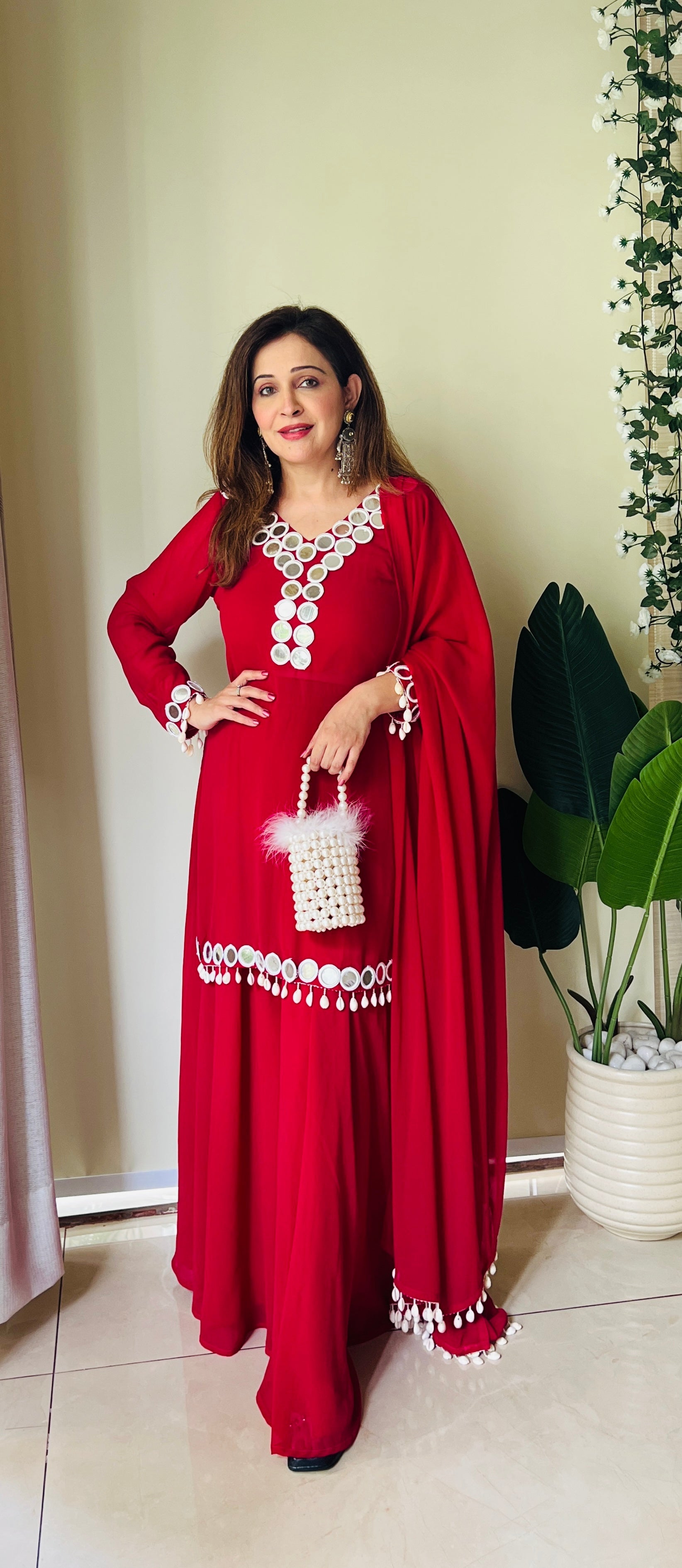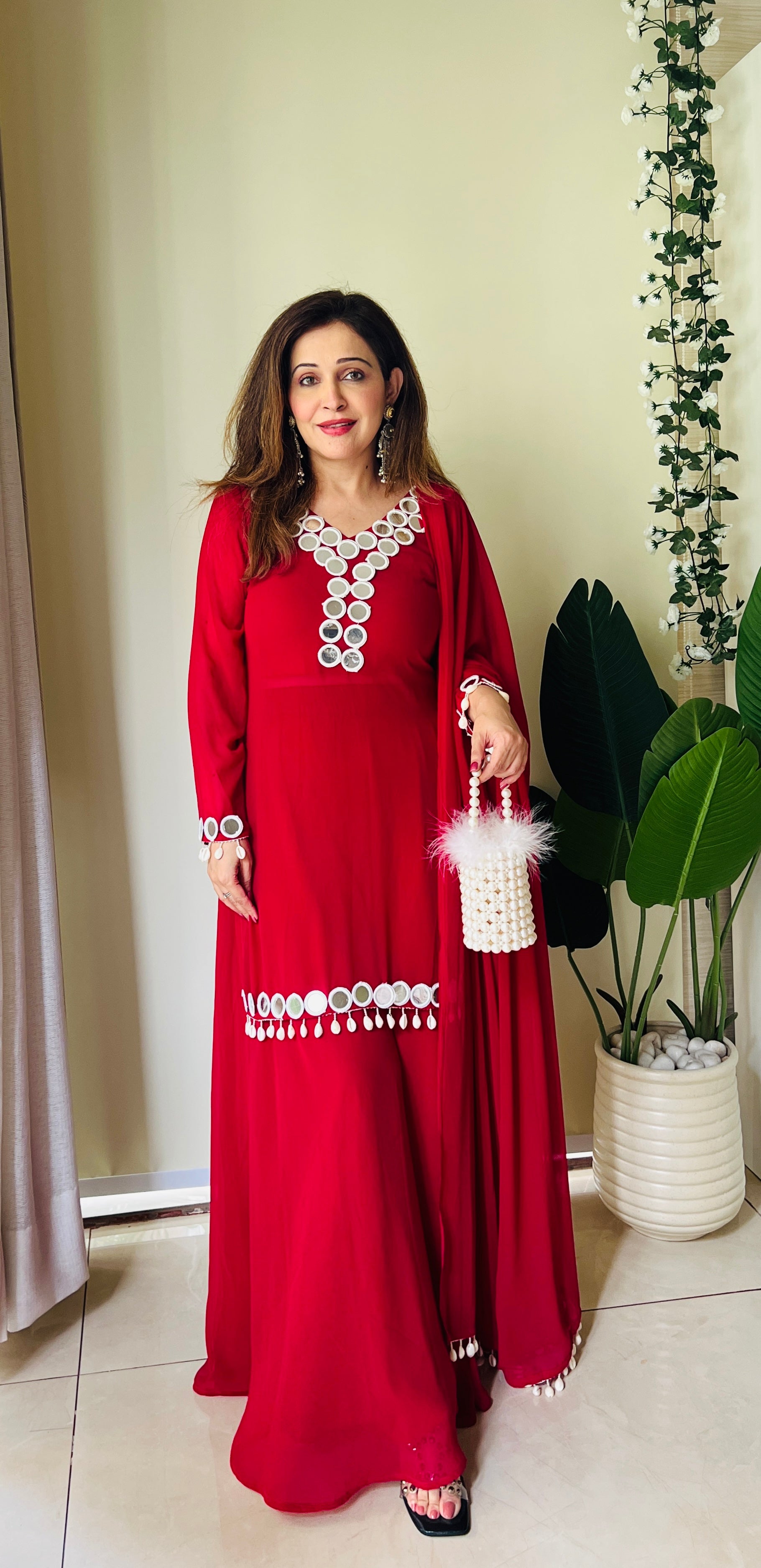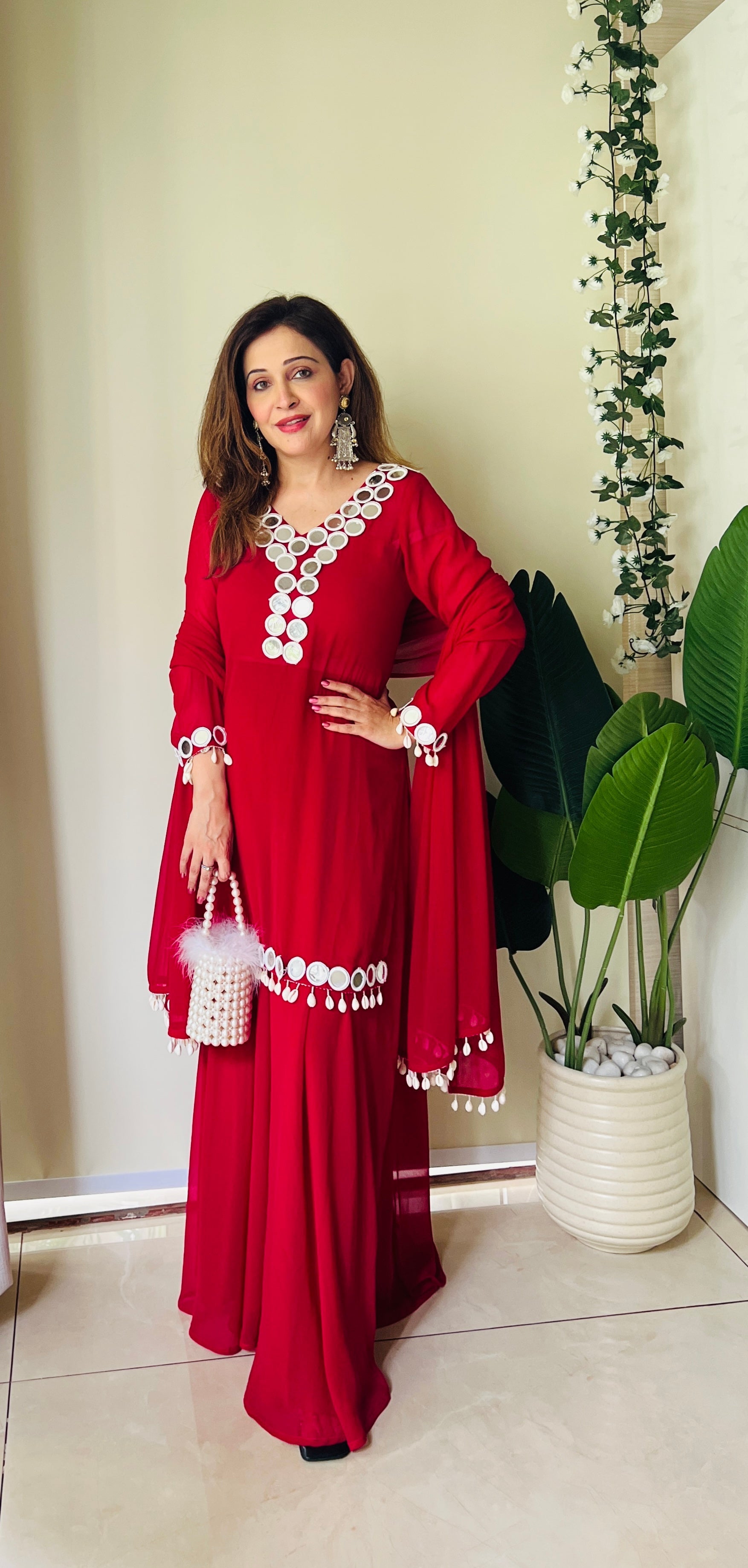 Presenting the Mirror Glint Georgette Set Elevate your style with this flared 3-piece ensemble, designed with a modern touch and crafted from luxurious georgette fabric. Perfect for any occasion, this set exudes elegance and sophistication, complemented by its rich shades. Complete your look with minimal accessories and immerse yourself in the dreamy ambiance of this stunning ensemble.