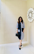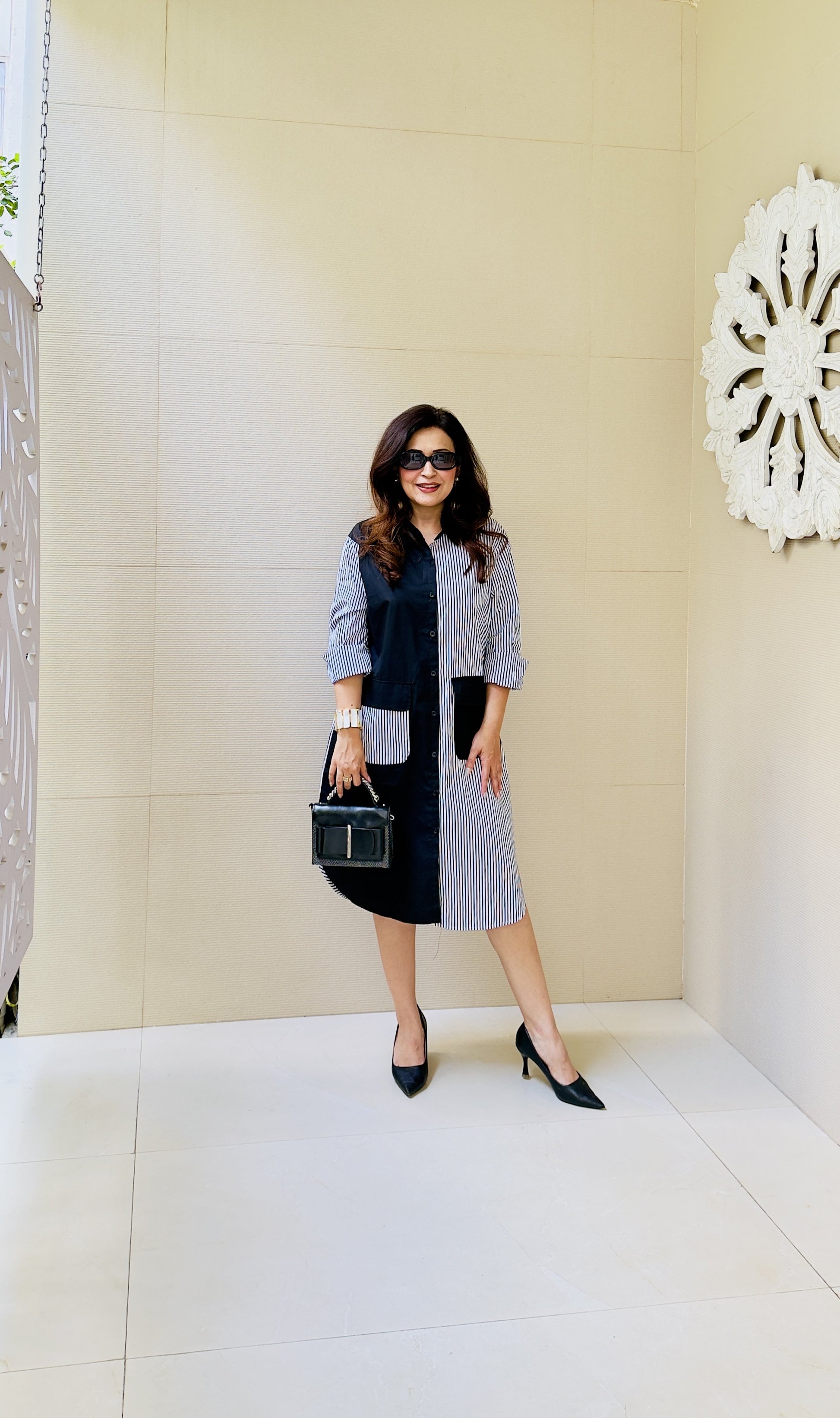 Step into effortless sophistication with this chic monochrome shirt dress, designed for the modern woman who loves timeless style with a contemporary twist. Featuring a striking contrast of solid black and classic stripes, this dress creates a bold yet balanced look that instantly elevates your wardrobe.