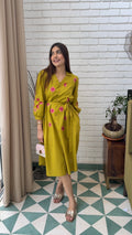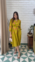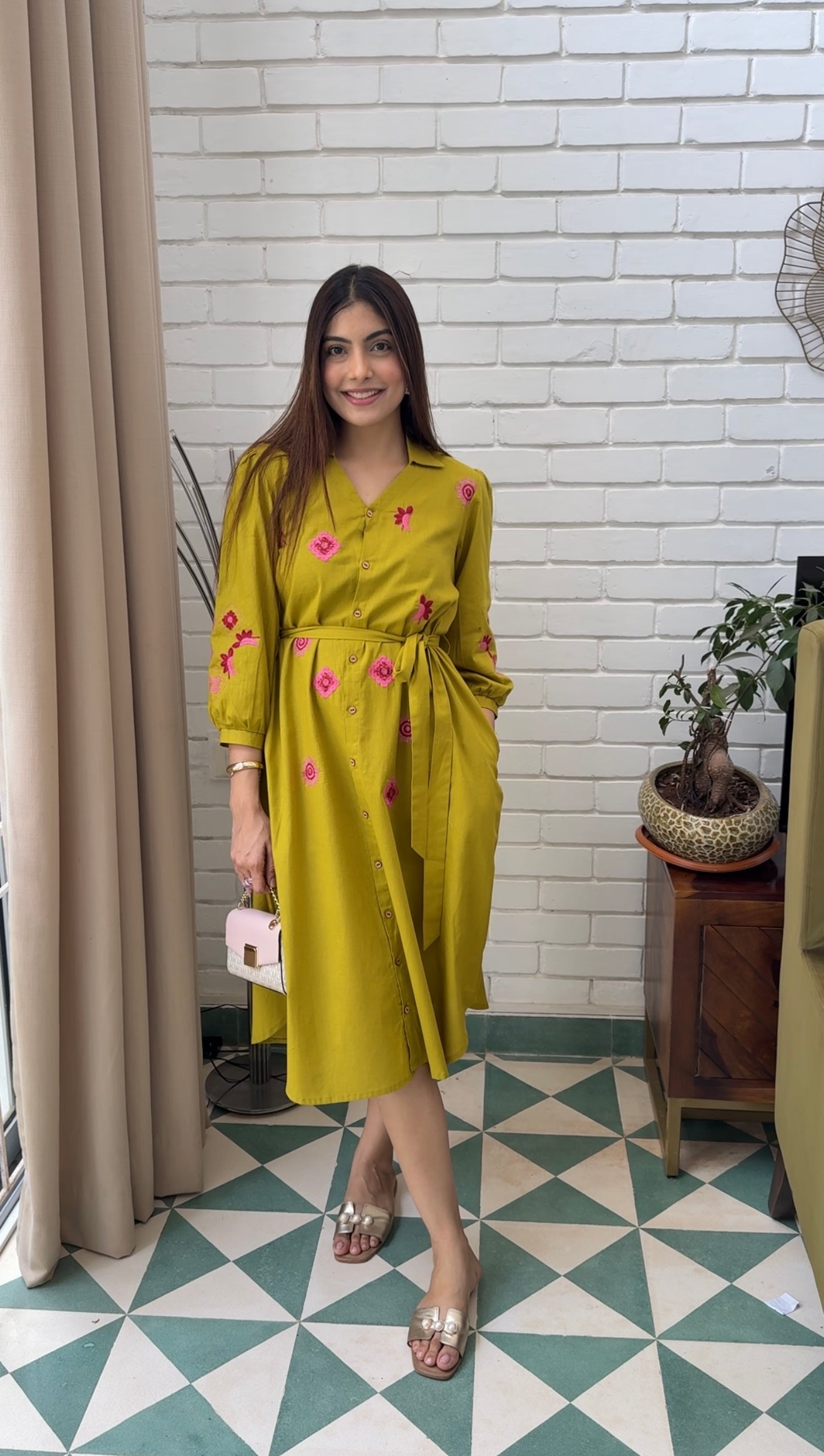 The soothing mustard tone is beautifully accented with delicate floral embroidery, adding a subtle handcrafted charm. Featuring a classic collared neckline, front button-down detailing, and three-quarter sleeves, the dress is complemented with a waist tie-up belt that enhances the silhouette gracefully.