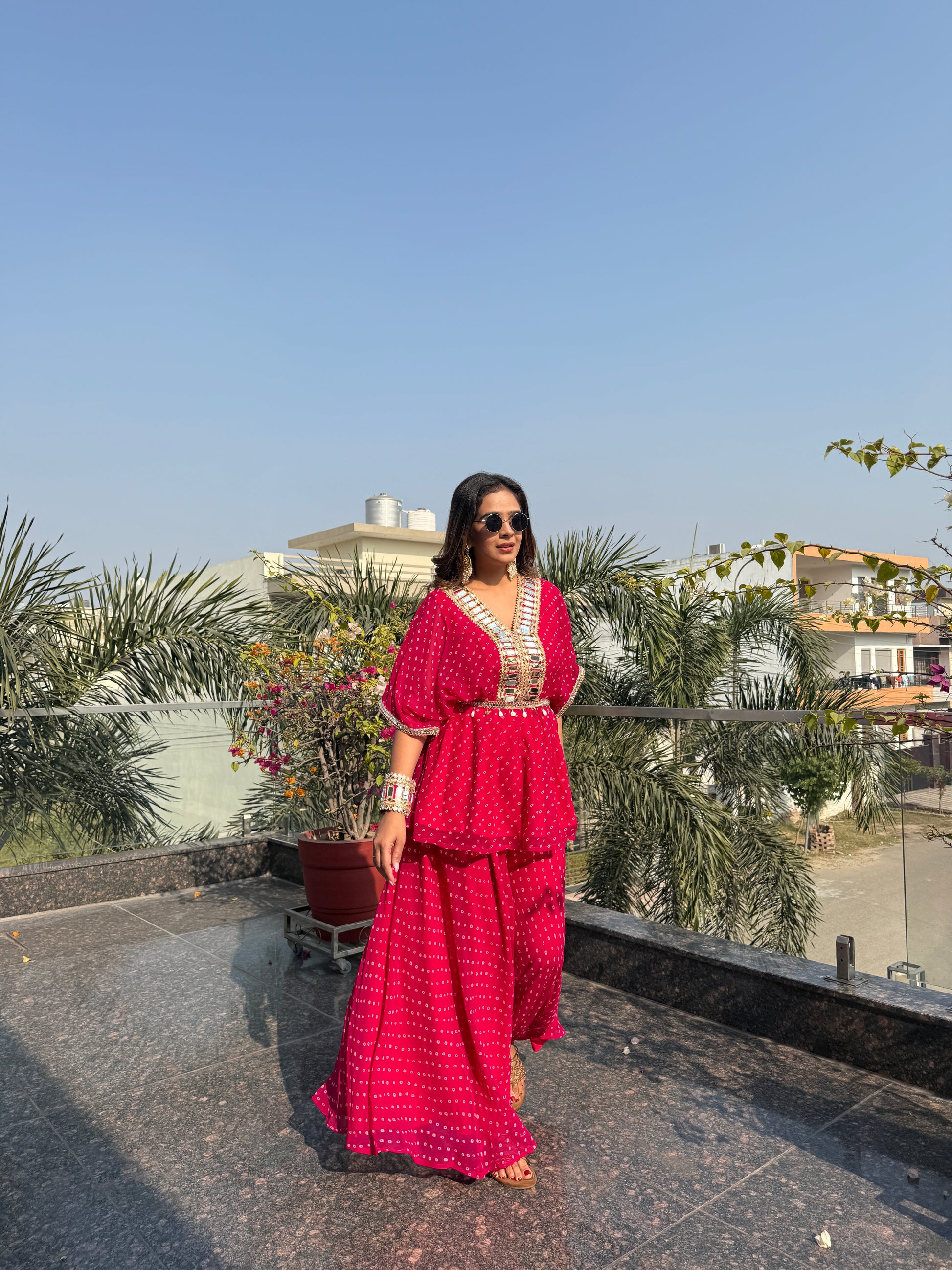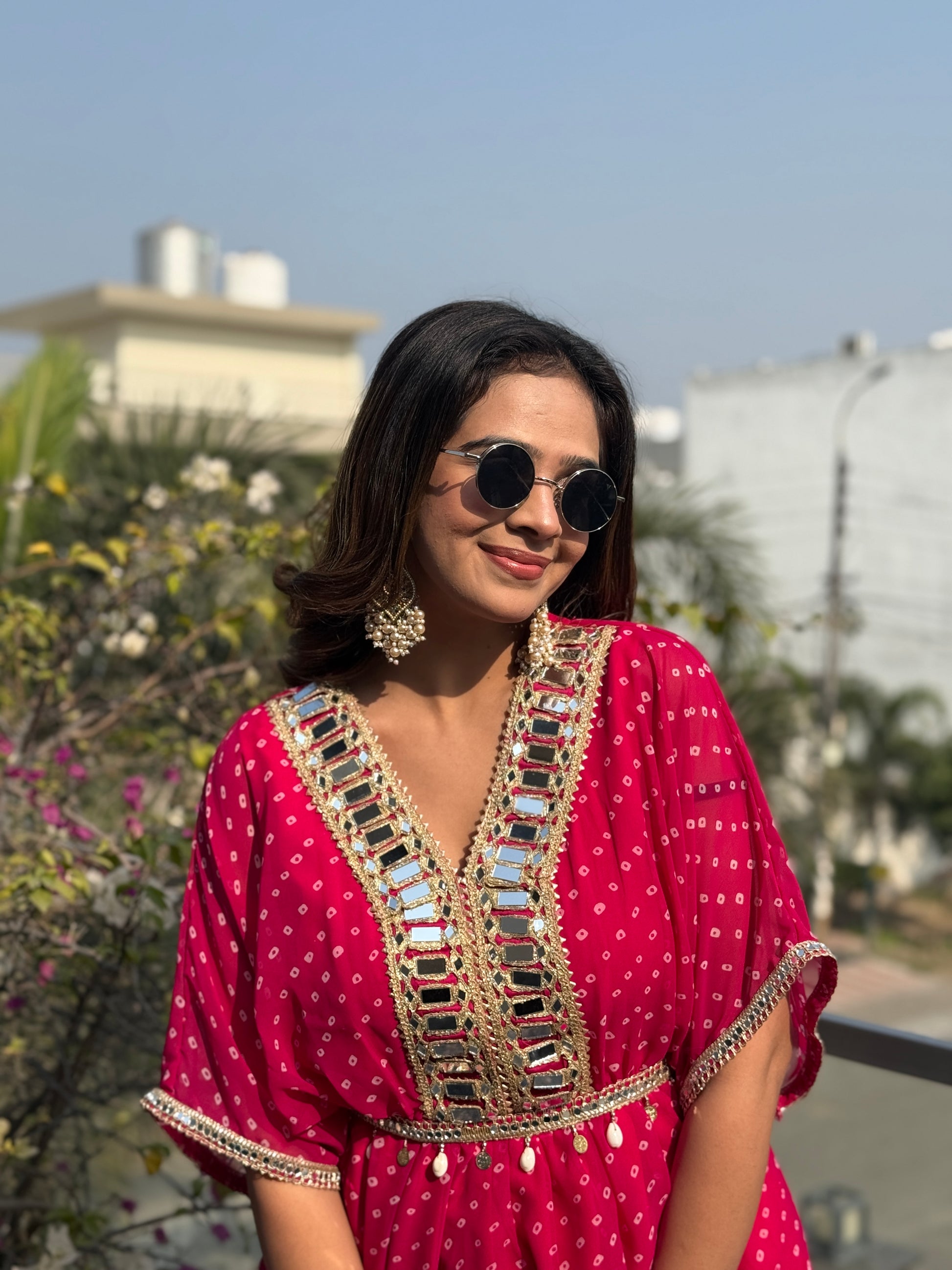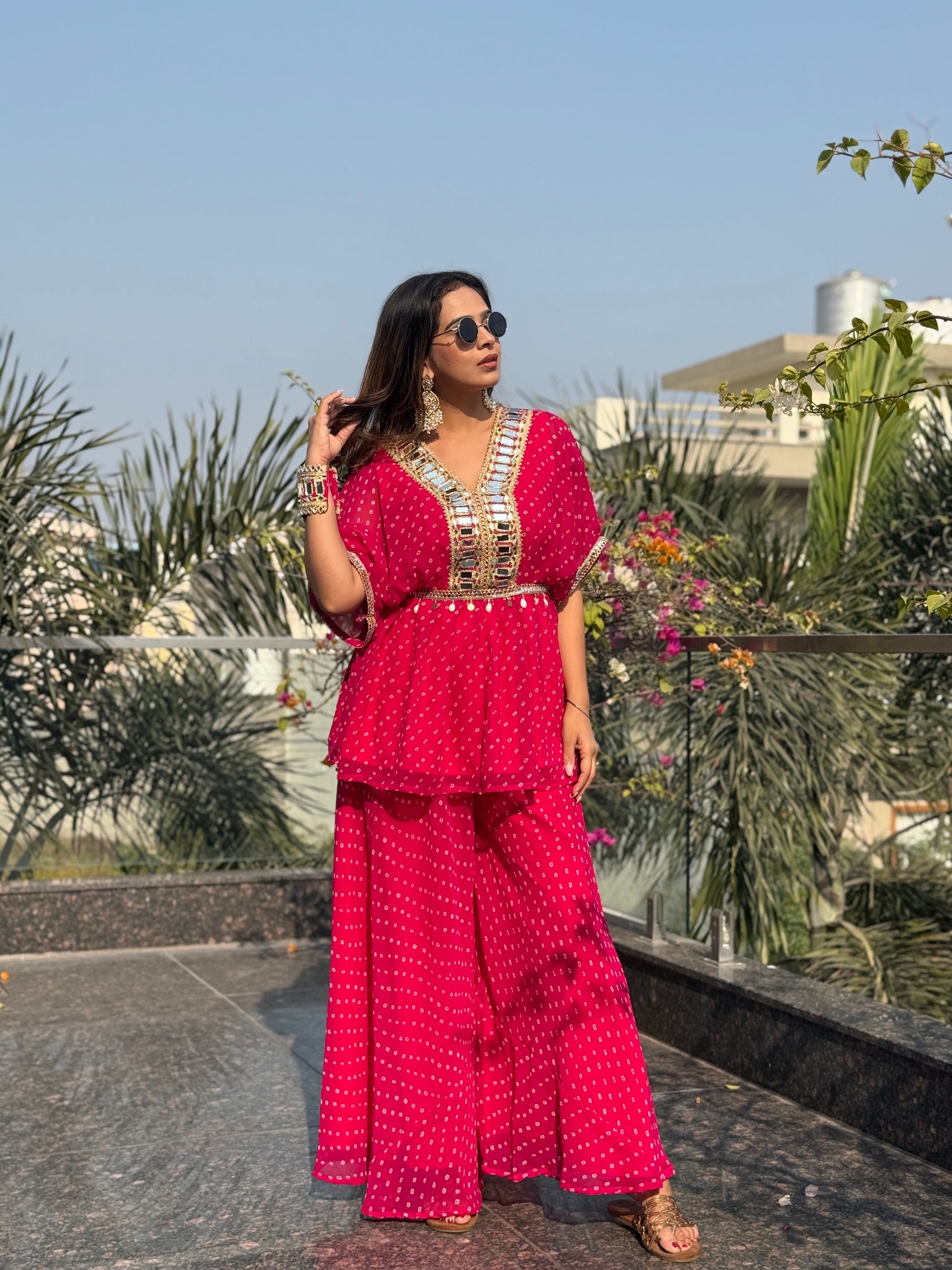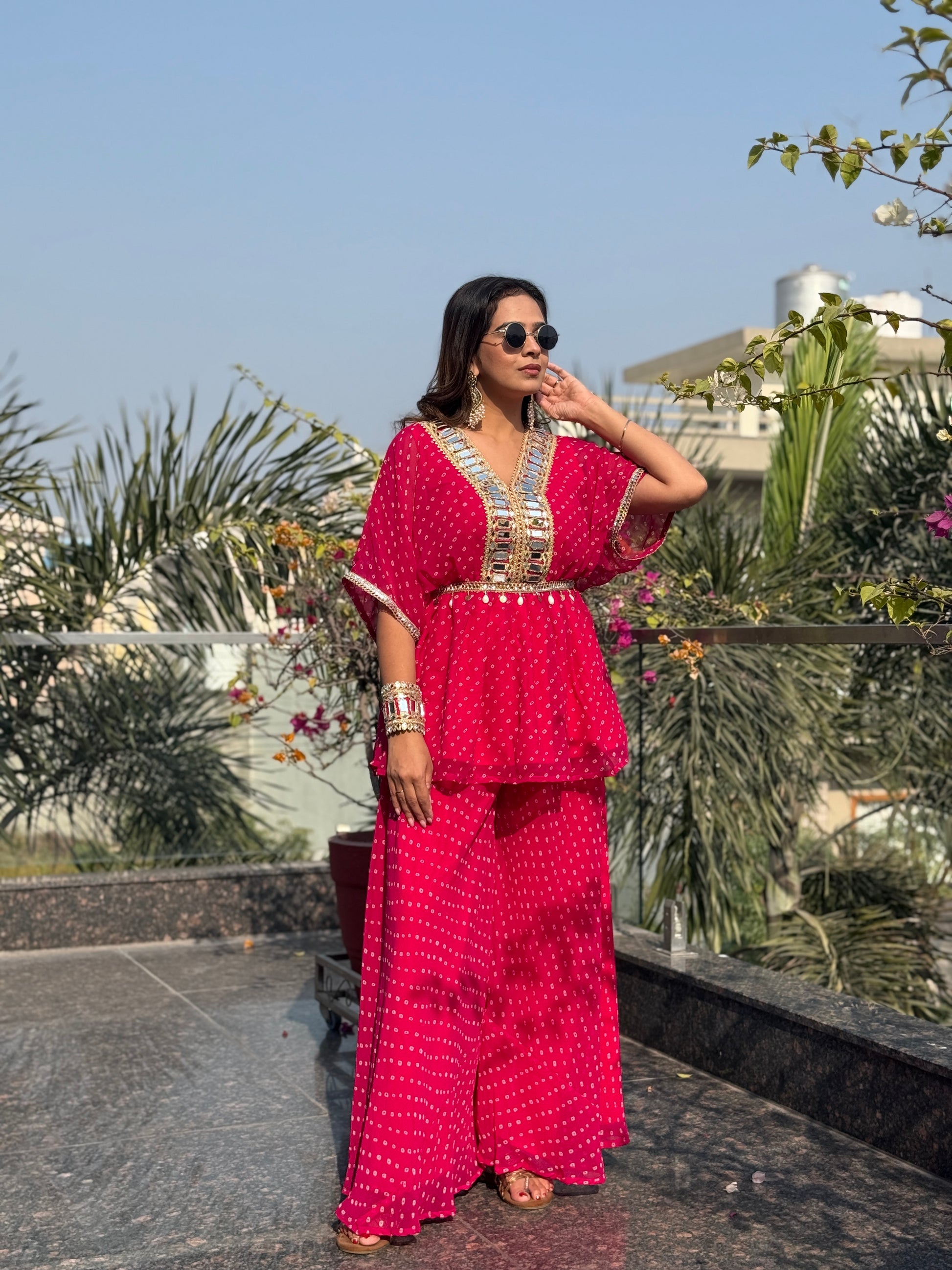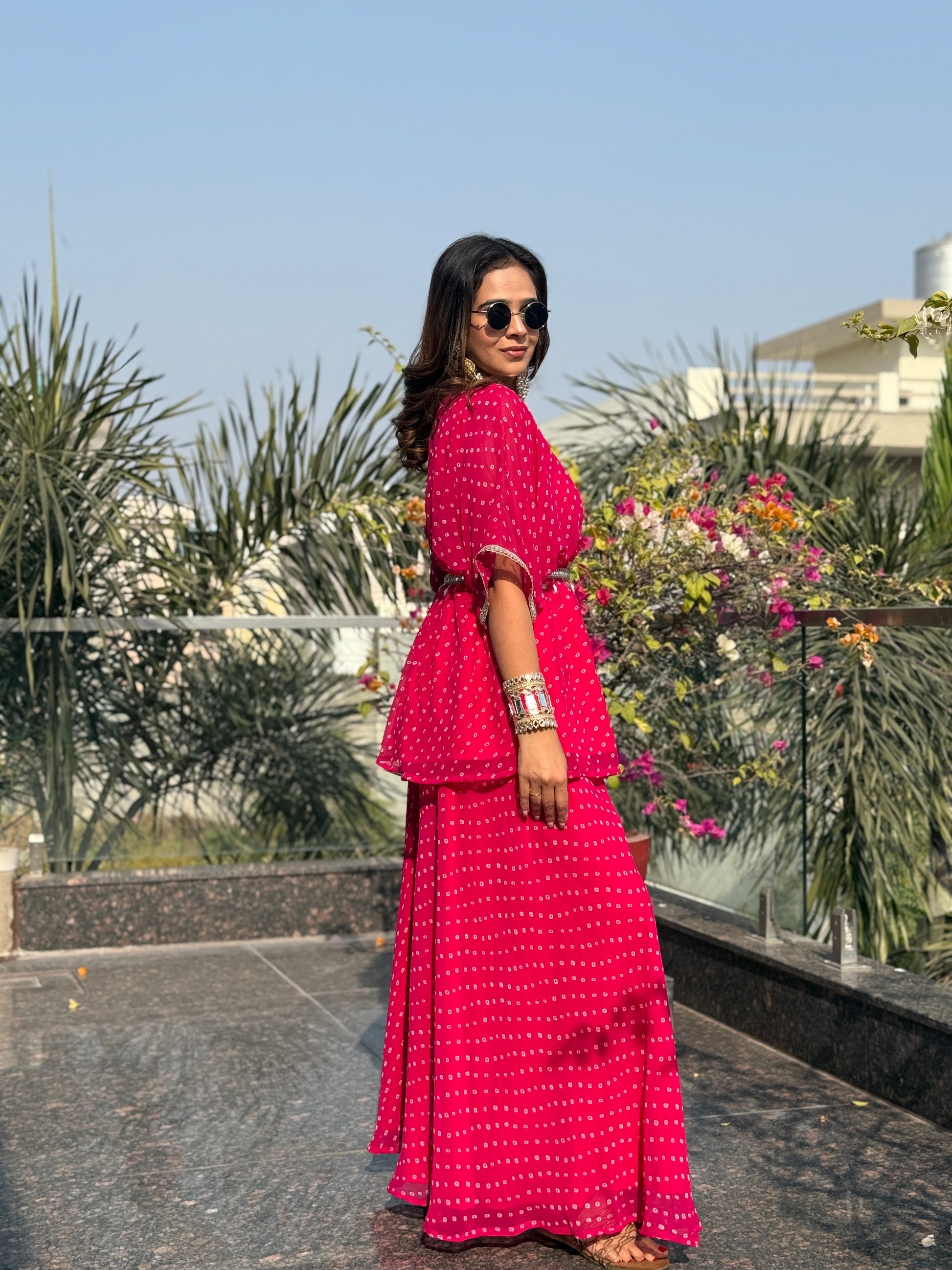 Step into effortless elegance with this stunning kaftan-style top and bottom set, crafted in soft and flowy Georgette Bandhani fabric. The vibrant fuchsia hue paired with traditional Bandhani patterns gives the outfit a rich ethnic charm, while the lightweight georgette adds graceful movement and all-day comfort.