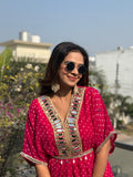 The kaftan features a beautifully embellished mirror-work neckline and sleeve detailing, adding a festive sparkle to the overall look. The matching bottoms complete the ensemble, making it perfect for casual celebrations, festive gatherings, resort wear, or everyday ethnic styling.