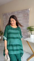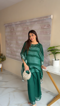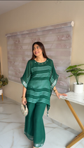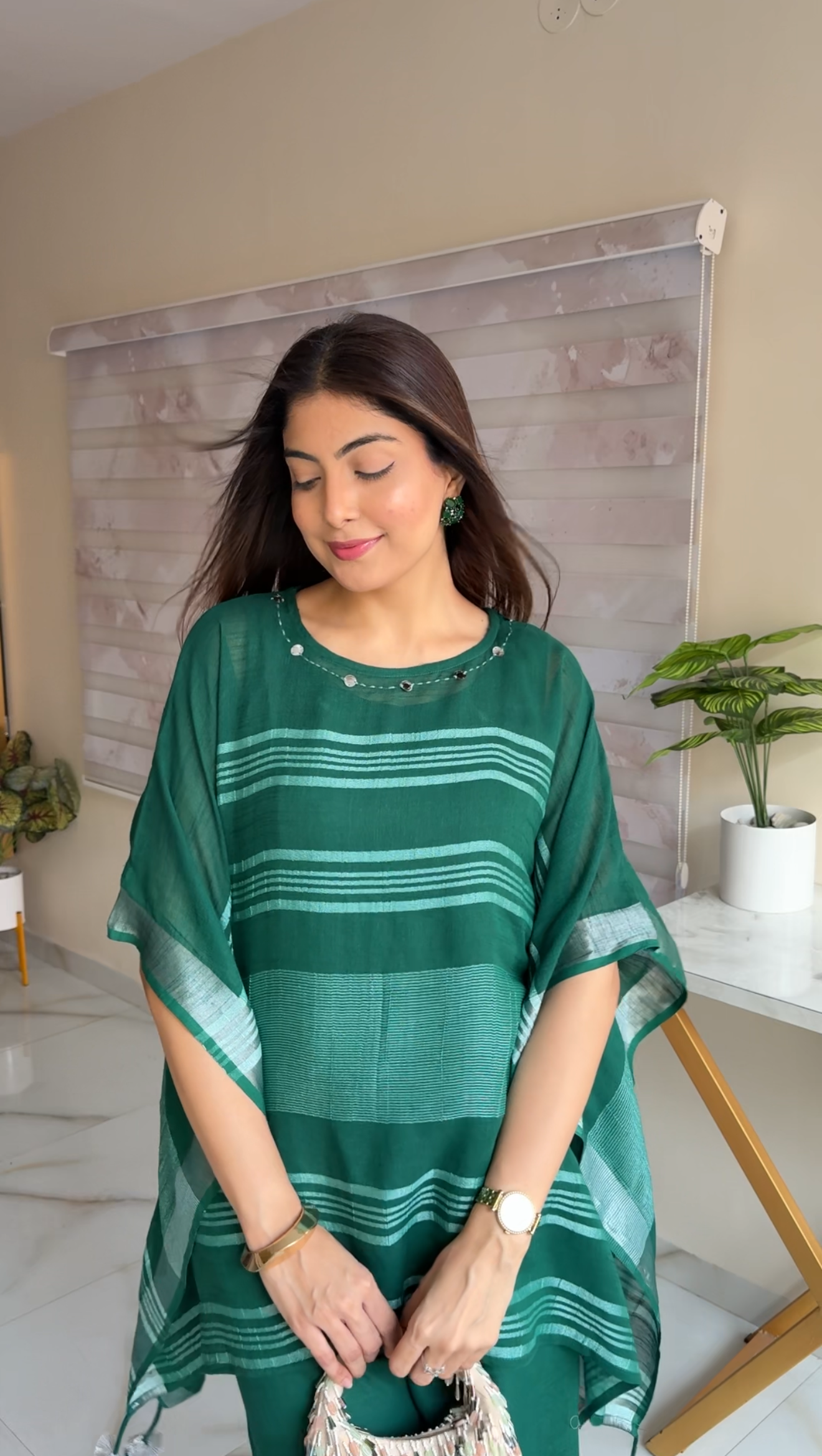 Embrace effortless elegance with this stunning kaftan-style top and bottom set, crafted in a rich, deep emerald green. The airy, flowy kaftan top features delicate woven stripes and shimmering mirror embellishments along the neckline, adding a touch of festive sparkle. Its relaxed silhouette drapes gracefully, offering comfort without compromising on style.