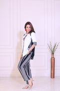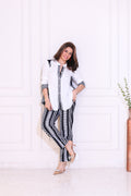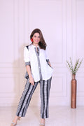 Step into effortless elegance with this monochrome embroidered co-ord set. The top features a soft white base highlighted with striking black tribal-inspired embroidery along the neckline, front placket, cuffs, and side panels—creating a beautifully balanced contrast. Paired with matching patterned straight pants, the set brings together comfort, sophistication, and a touch of ethnic charm. Perfect for casual outings, lunch dates, or travel wear, this ensemble keeps you stylish with minimal effort.