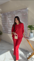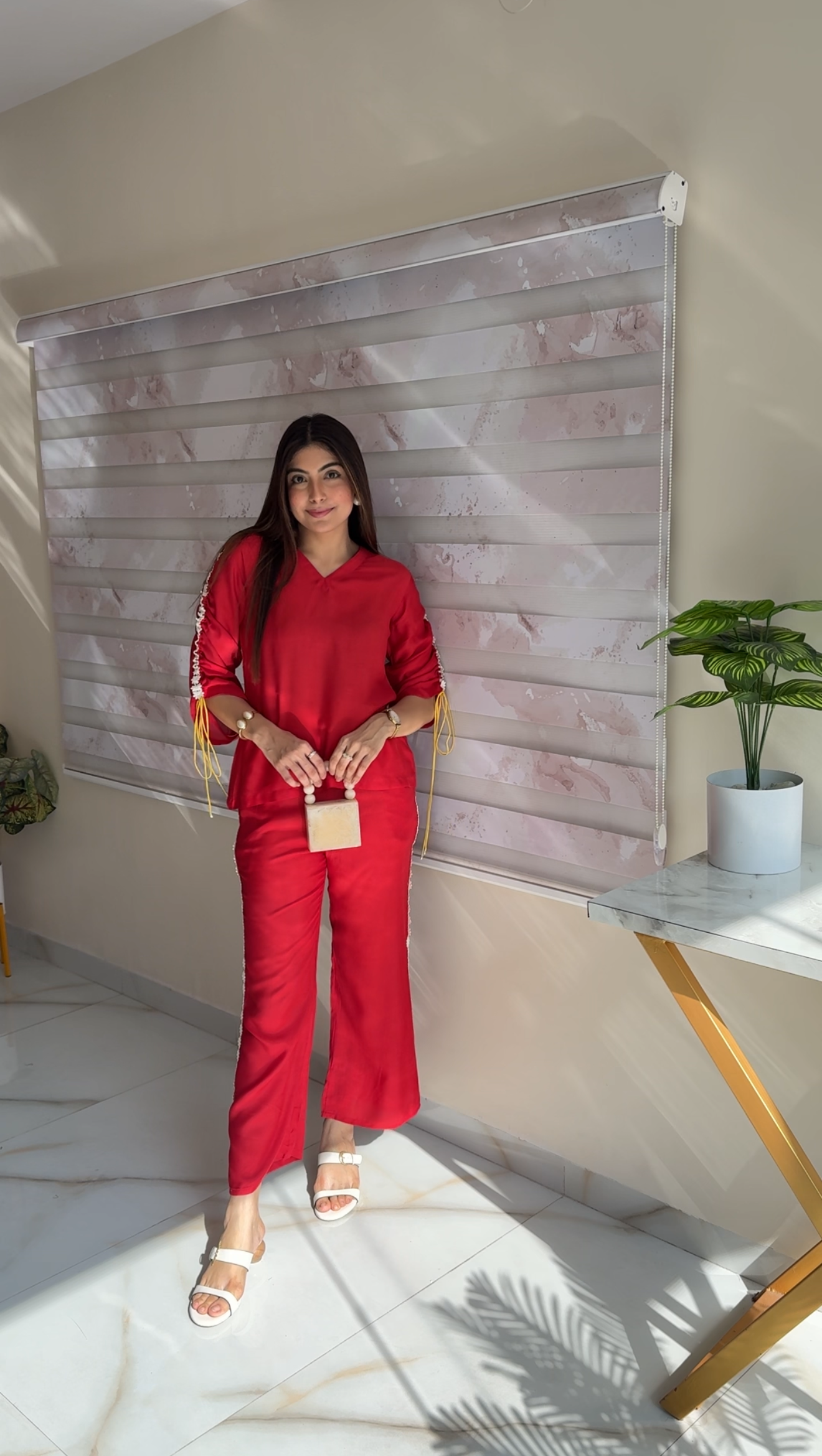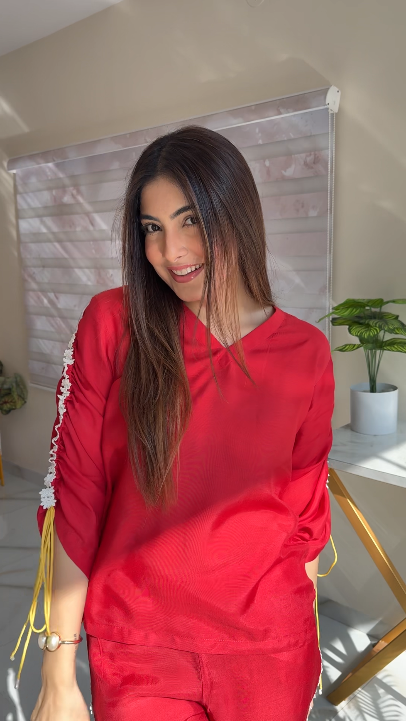 Make a bold yet graceful style statement with this vibrant red cord set, designed with a perfect blend of simplicity and delicate detailing. The top features a clean V-neckline and long sleeves for an elegant, streamlined look. What sets this piece apart is the charming white floral lace running along shoulder and sleeve, adding a touch of handcrafted beauty and modern contrast.