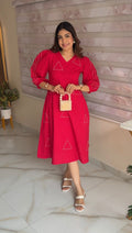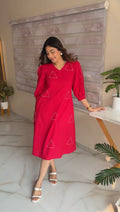Step into effortless elegance with this stunning red midi dress, adorned with delicate triangle thread work that adds a touch of modern charm to its classic silhouette. Crafted in a rich crimson hue, this dress perfectly blends tradition with contemporary style.