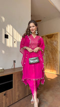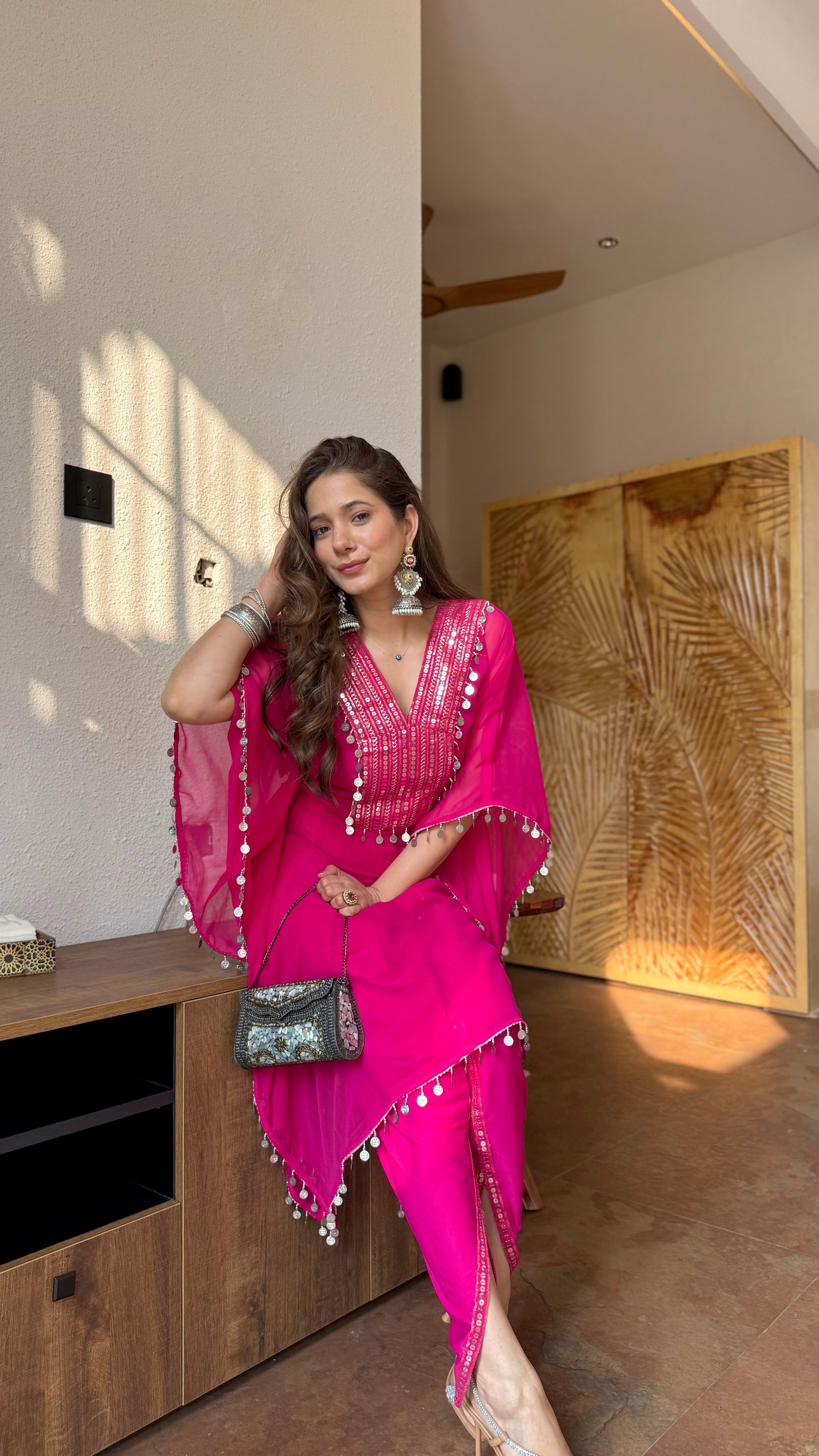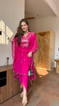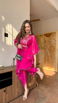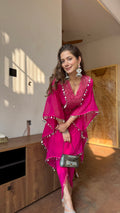 Experience effortless elegance with this luxurious Rosé Radiance kaftan, beautifully designed with intricate handwork and delicate embellishments. The flowing silhouette, paired with the lightweight fabric, exudes grace and sophistication, making it a perfect choice for festive occasions or a glamorous evening out.