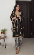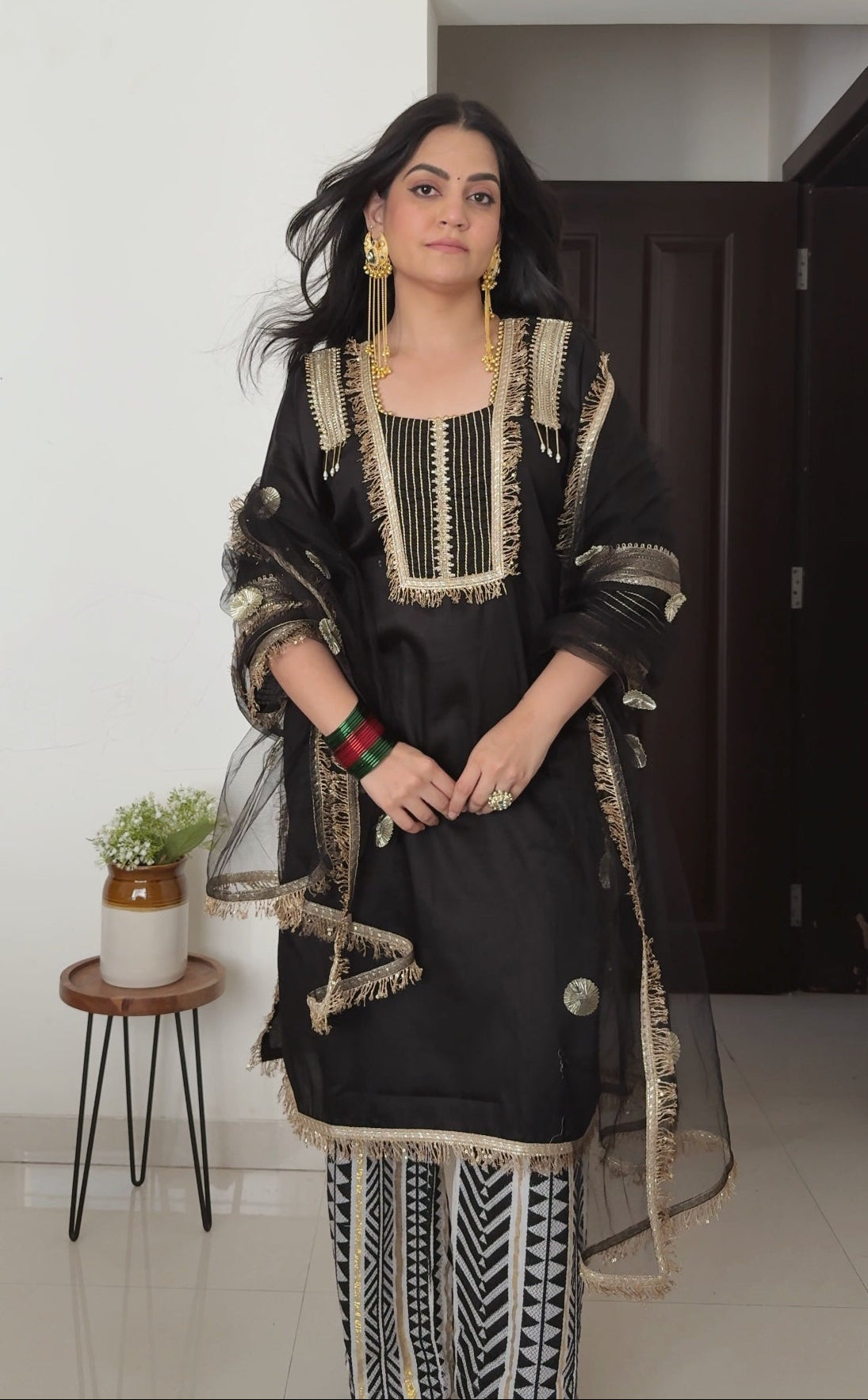 Made from premium Jam Satin fabric, the Royal Grace Cordset in classic black exudes sophistication and timeless elegance. The outfit is highlighted with Delicate fringe detailing on the neckline, sleeves, and hemline, giving it a rich and regal appeal.