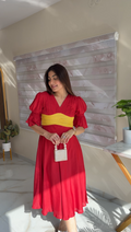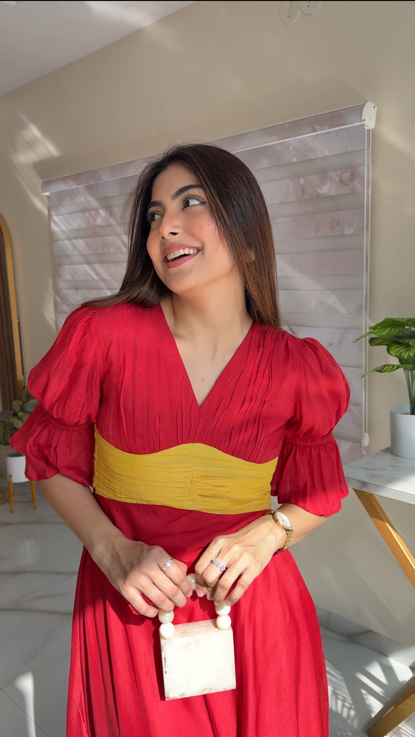 Bold, vibrant, and full of charm — this stunning red flared dress is a true head-turner. Designed with structured pleated detailing on the bodice, it features a deep V-neckline that adds an elegant, modern touch. The highlight of the outfit is the striking mustard-yellow waistband, crafted with fine pleats that enhance your waistline beautifully, giving the dress a flattering, cinched silhouette.