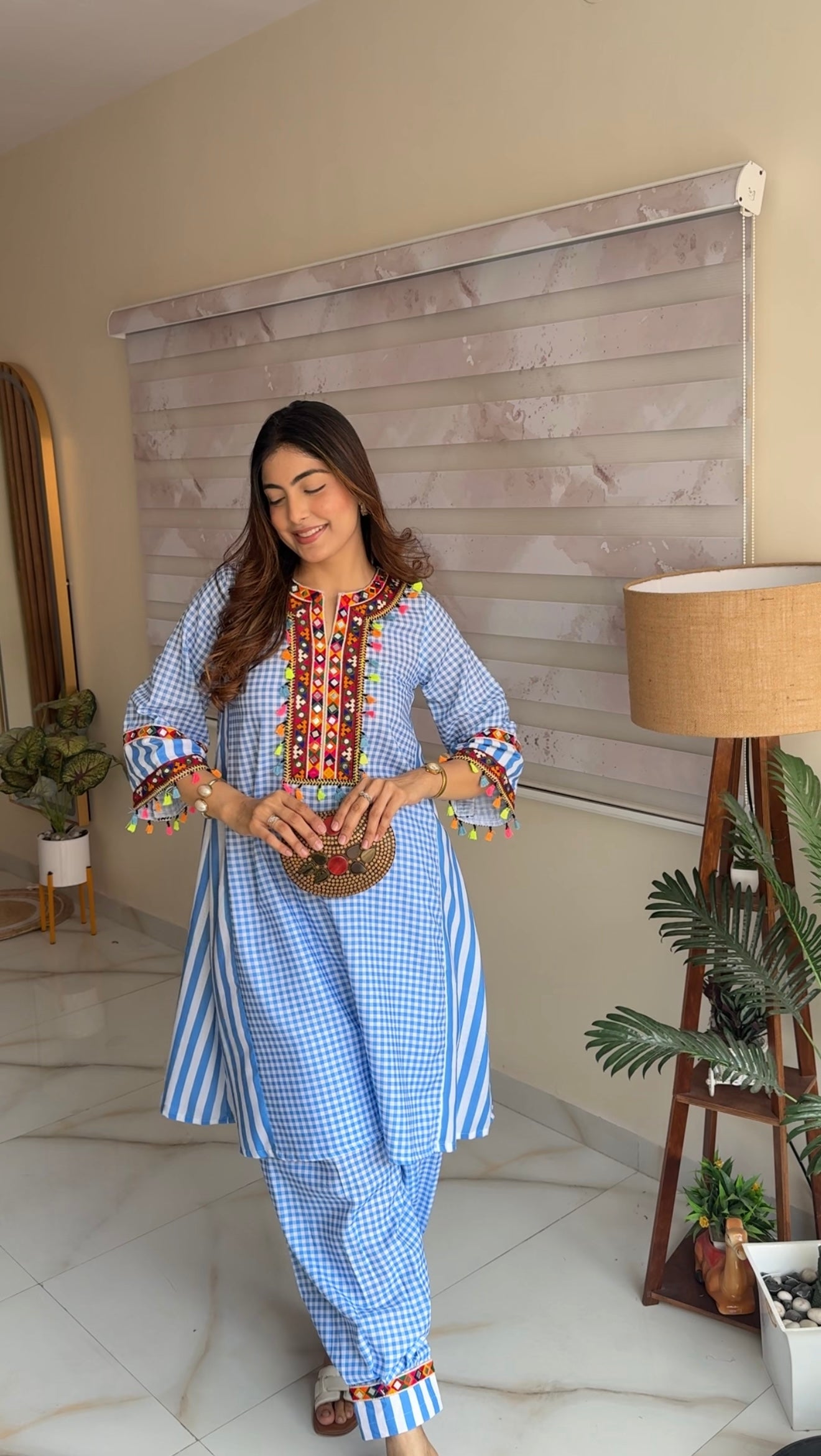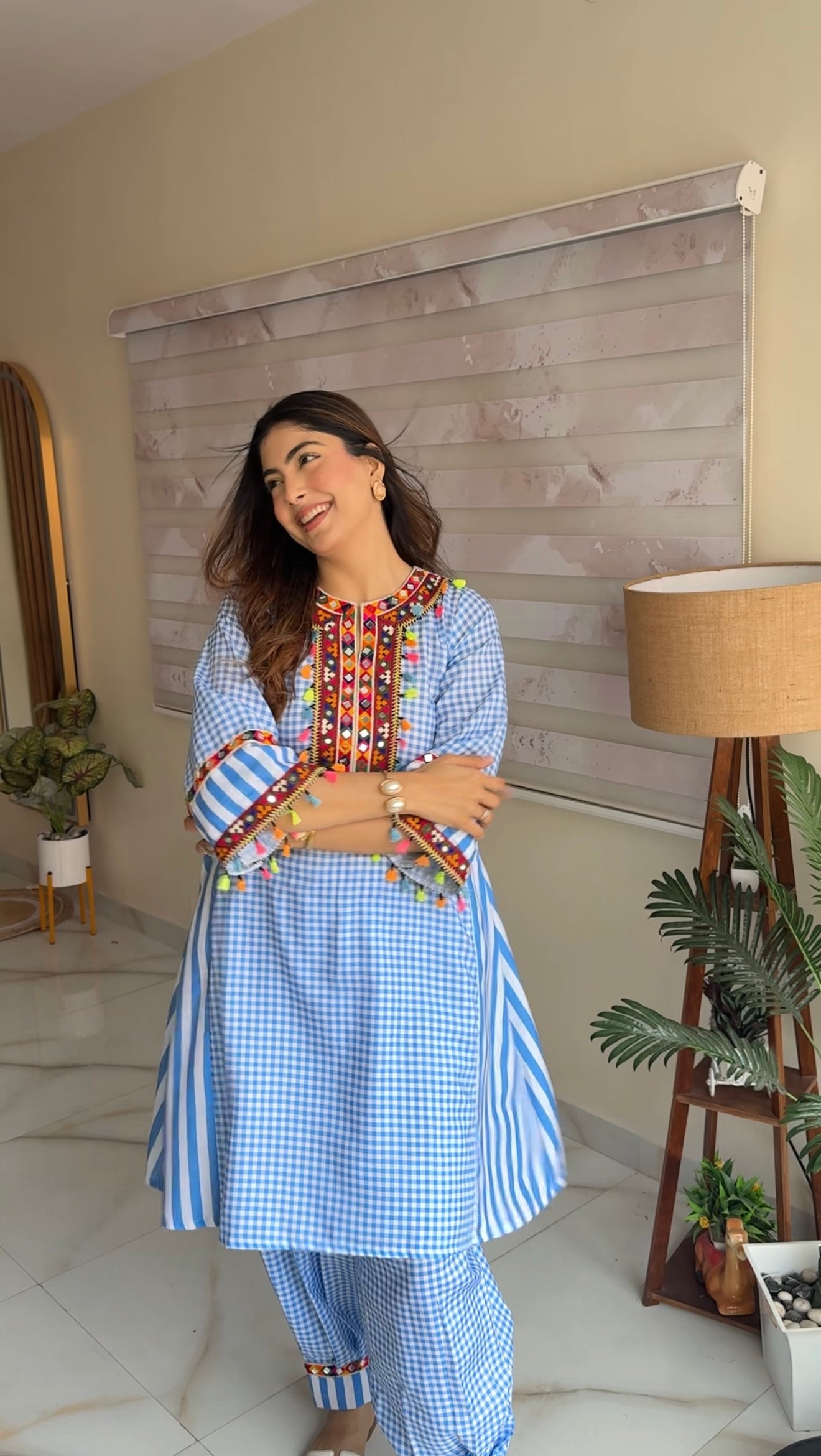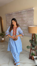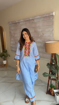 Brighten your wardrobe with this sky blue cotton slub kurta and plazo set, featuring white checks and vibrant multi-colour fumka. The loose fit ensures all-day comfort, making it perfect for office wear, casual brunches, or festive parties. Stylish, breathable, and uniquely charming.