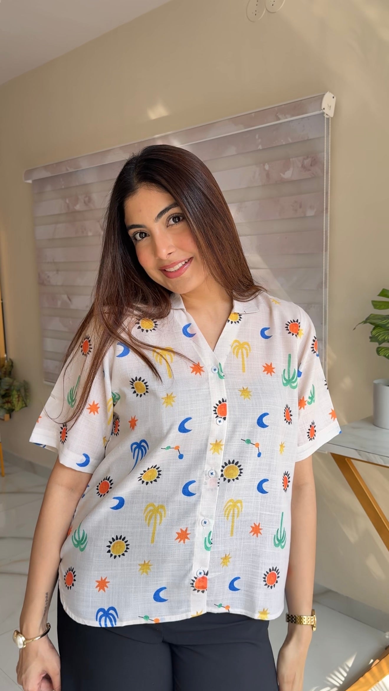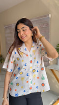 Made from soft, breathable cotton fabric, this shirt is designed to keep you comfortable while making a bold style statement. The light base is adorned with whimsical digital prints inspired by suns, moons, palms, and playful symbols, giving it a fun, artsy, and contemporary feel.