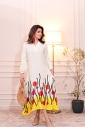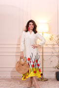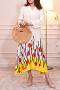 Effortlessly elegant with an artistic soul, this statement midi dress is designed to turn everyday moments into style stories. Crafted in soft, breathable fabric, the silhouette flows gracefully with a relaxed yet refined fit. The clean ivory base is beautifully elevated with an abstract hemline print—bold black strokes and playful red accents melting into a sunshine-yellow border, creating a modern art–inspired finish.